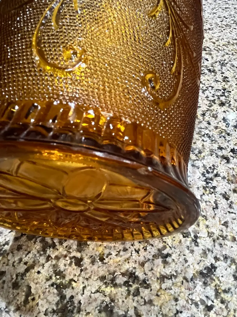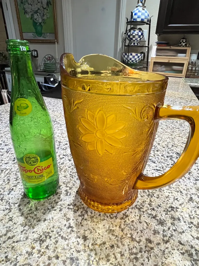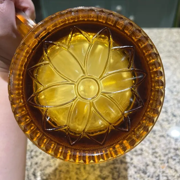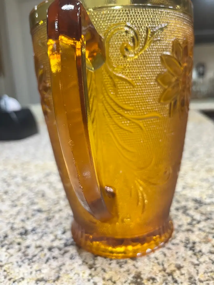 Vintage amber-colored glass pitcher, specifically identified as an Indiana Glass Tiara Sandwich pattern pitcher, likely dating back to the 1960s or 1970s.