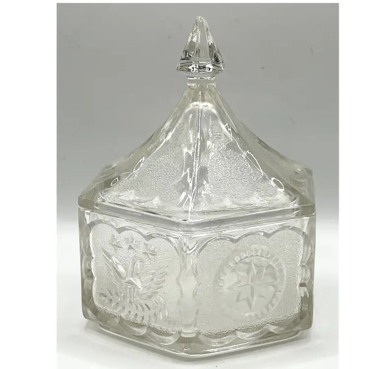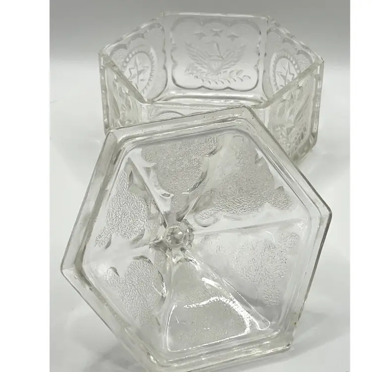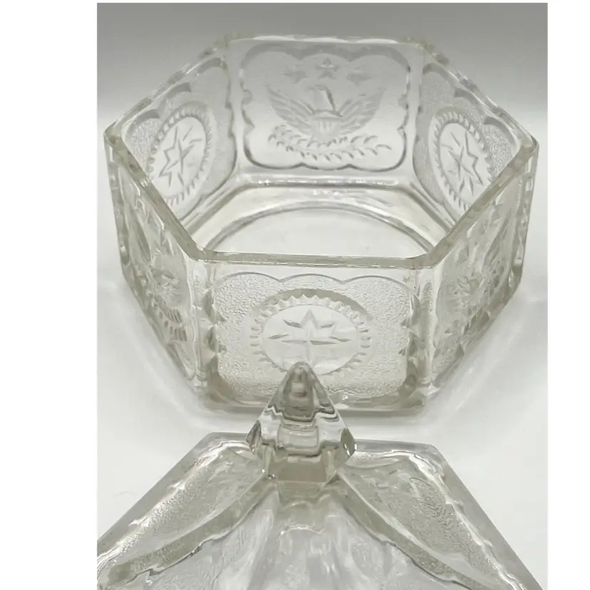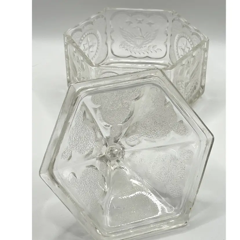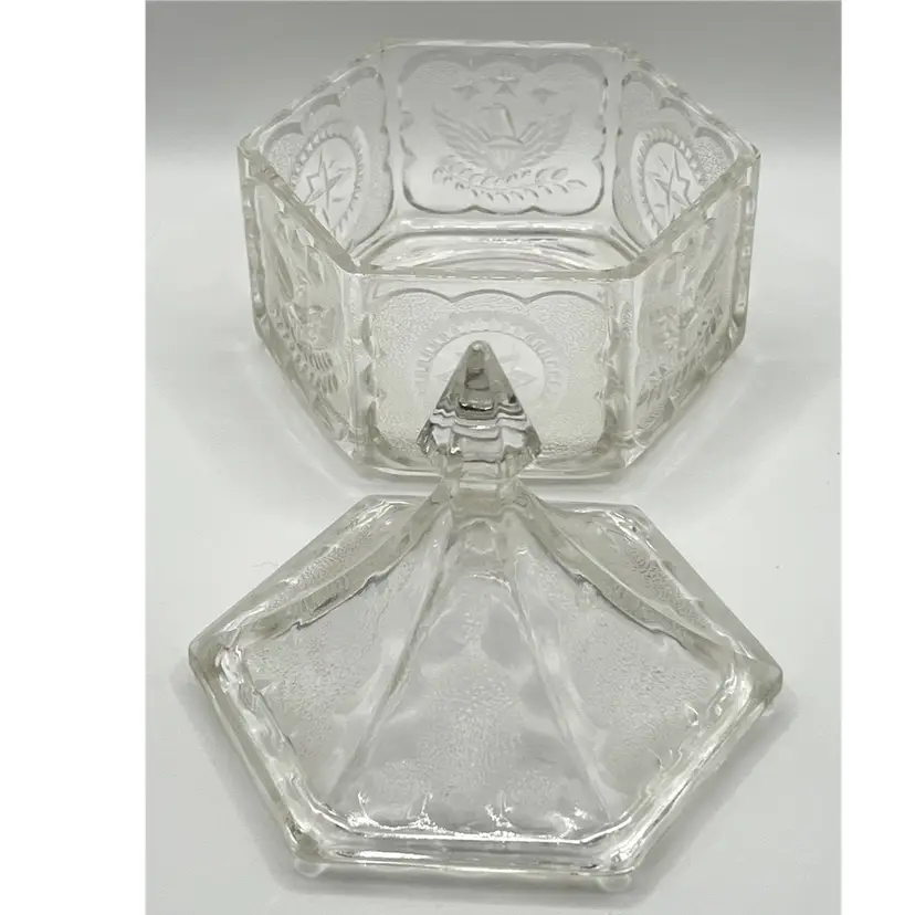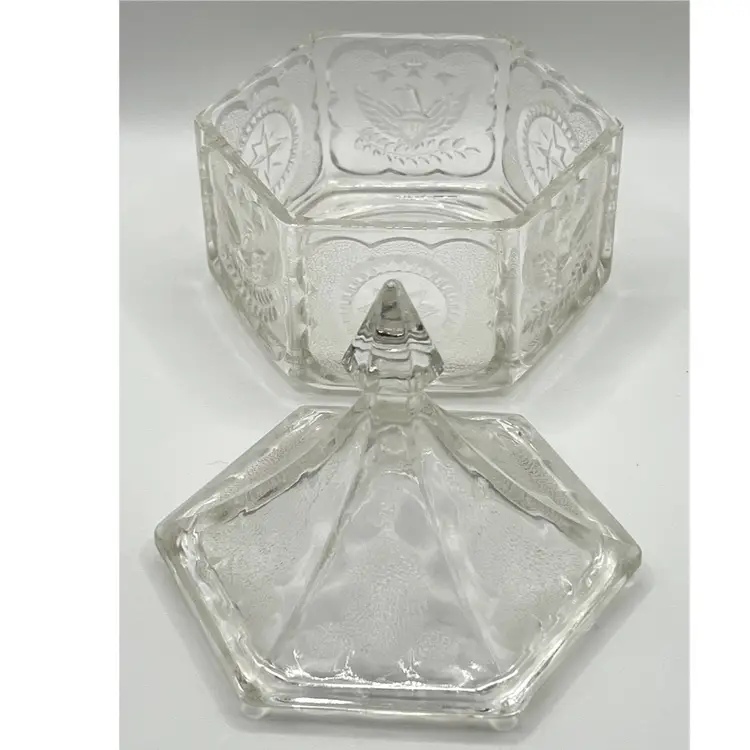 Indiana Glass Pressed Clear Hexagon Candy Dish With Lid Patriotic Eagles & Stars 6 in Height, 4.2 in diameter. No chips