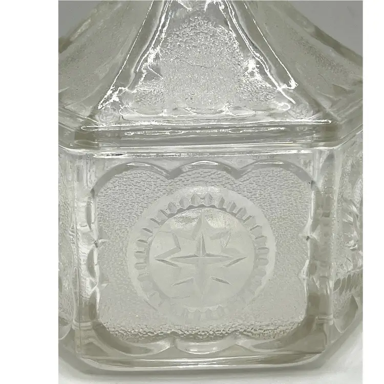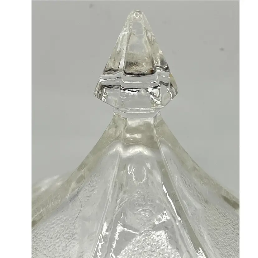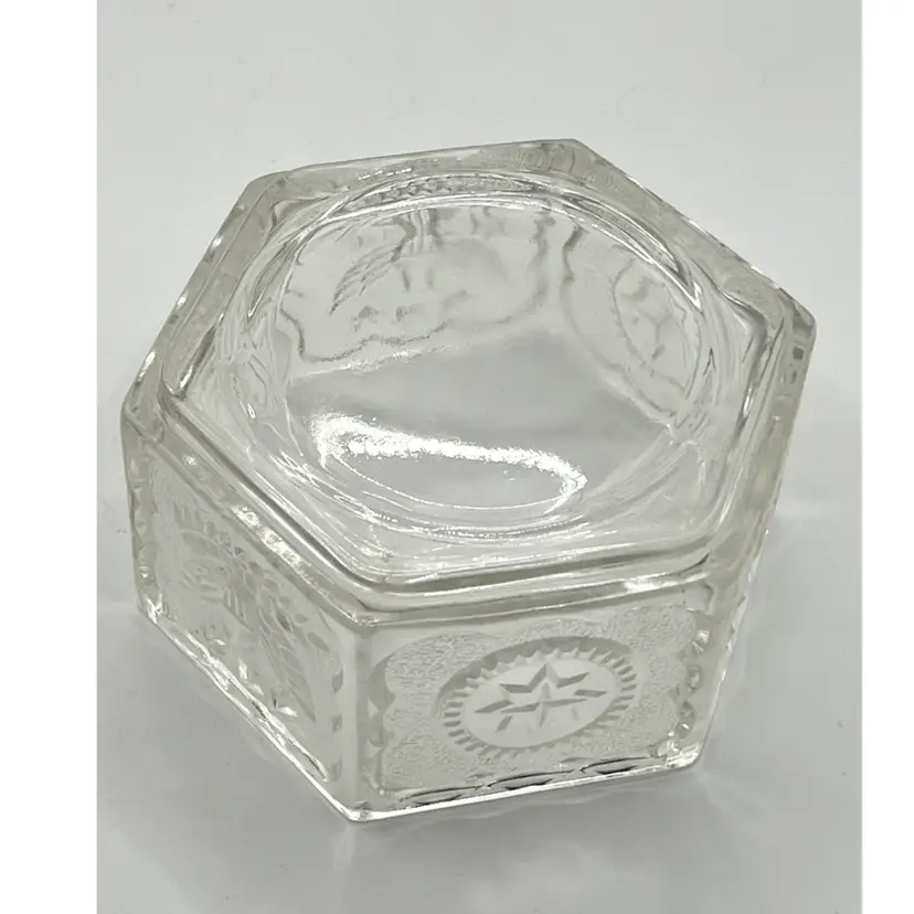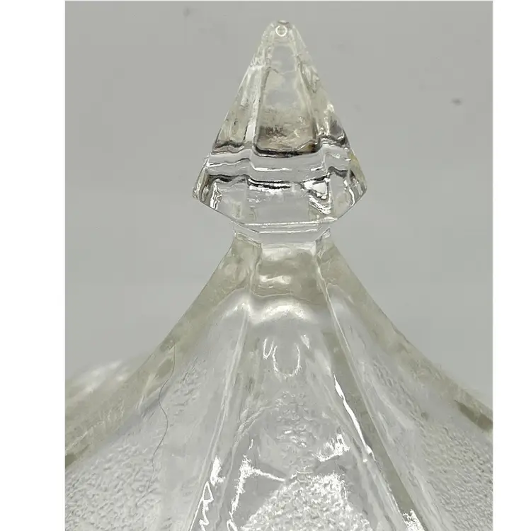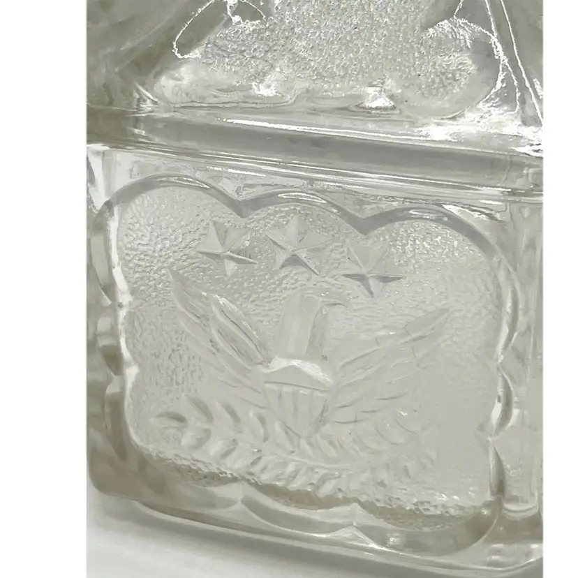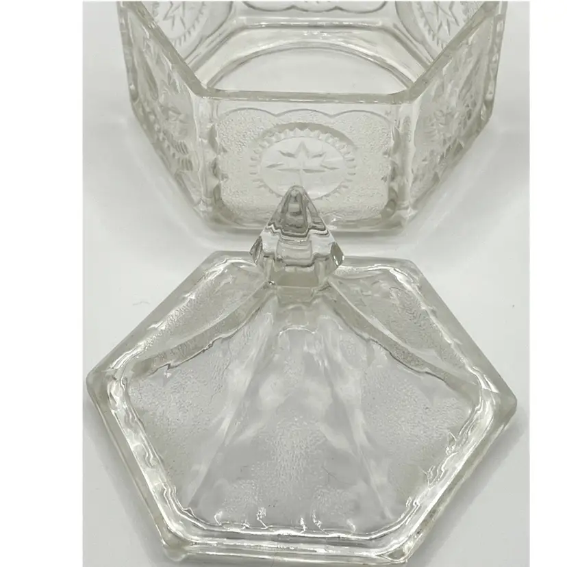 Indiana Glass Pressed Clear Hexagon Candy Dish With Lid Patriotic Eagles & Stars 6 in Height, 4.2 in diameter. No chips