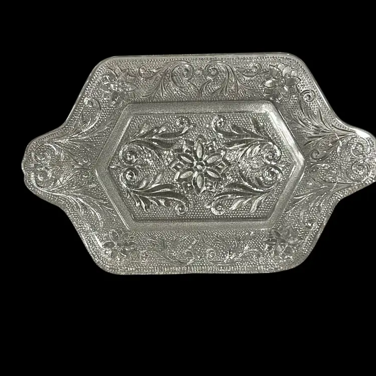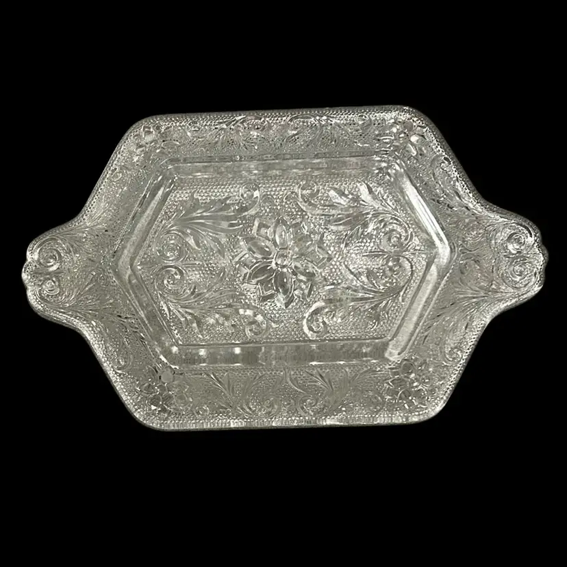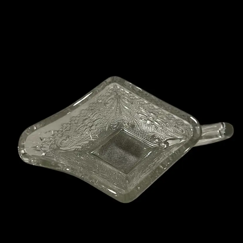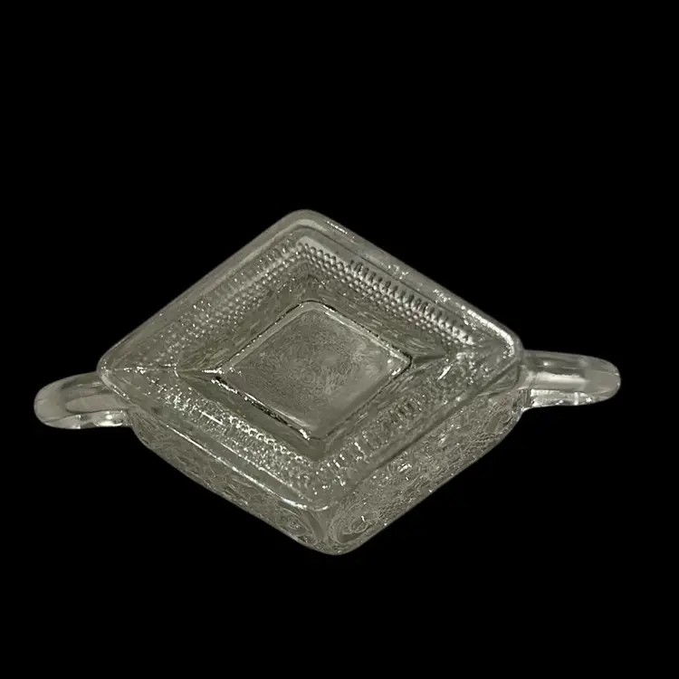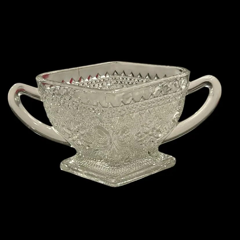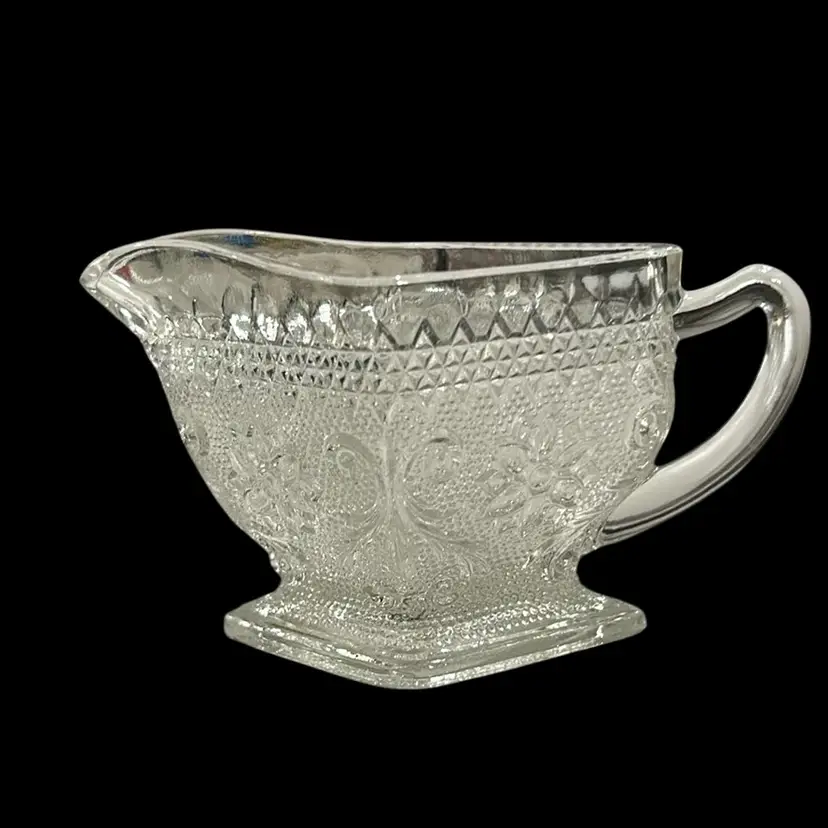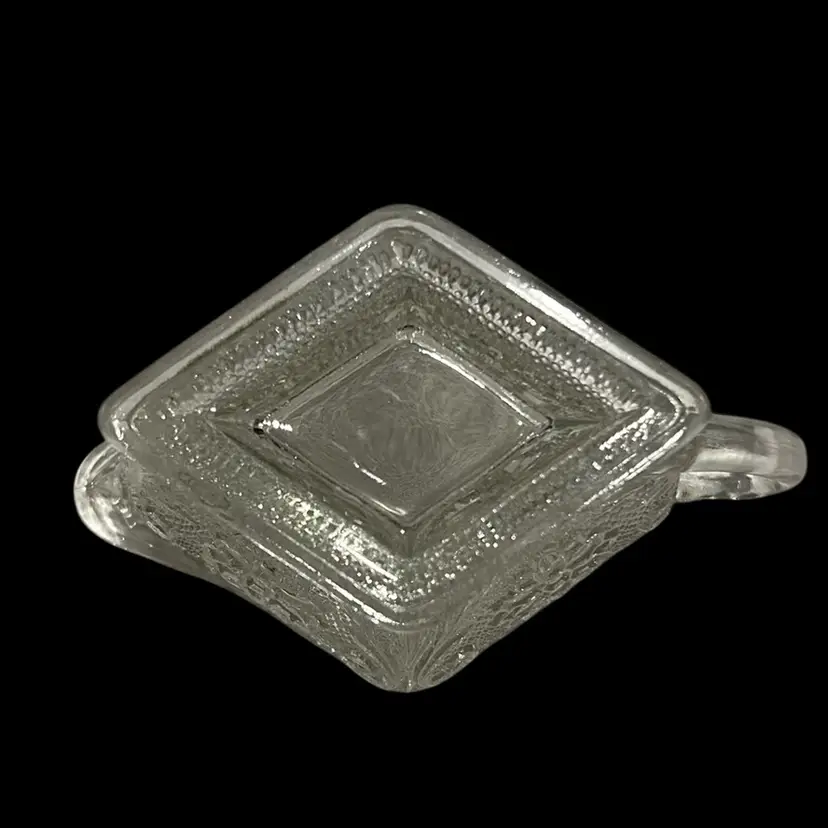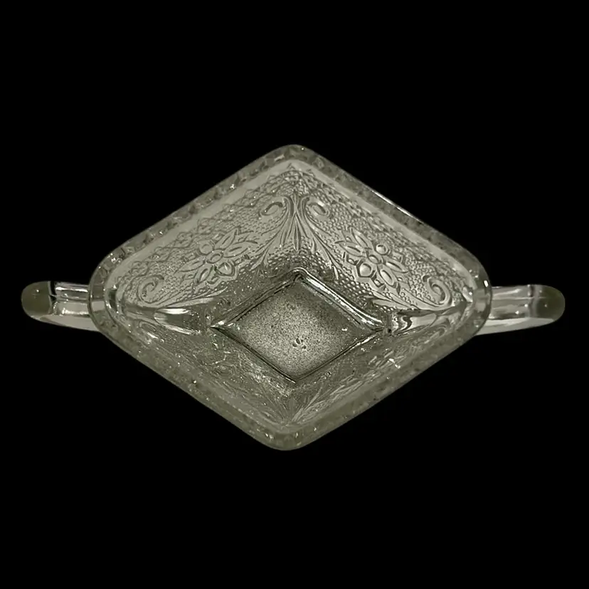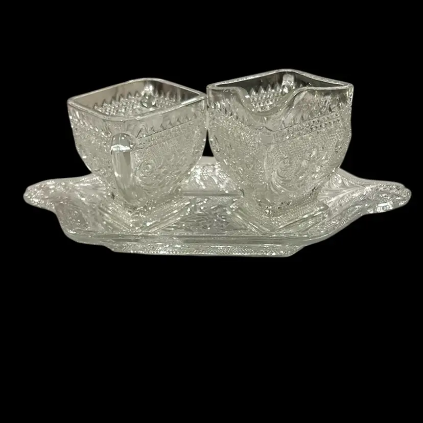 This item is a vintage Indiana glass sugar and creamer set specifically featuring a sandwich clear pattern with a diamond shake design and it includes the tray. The tray is 9 inches long 5 1/2 inches wide. The creamer and sugar bowl are 5 1/half inches wide, and 3 inches tall. There are no chips or cracks.