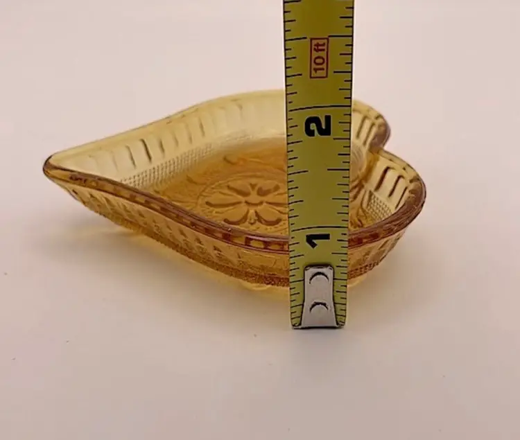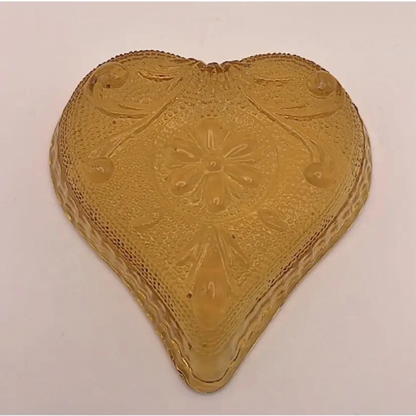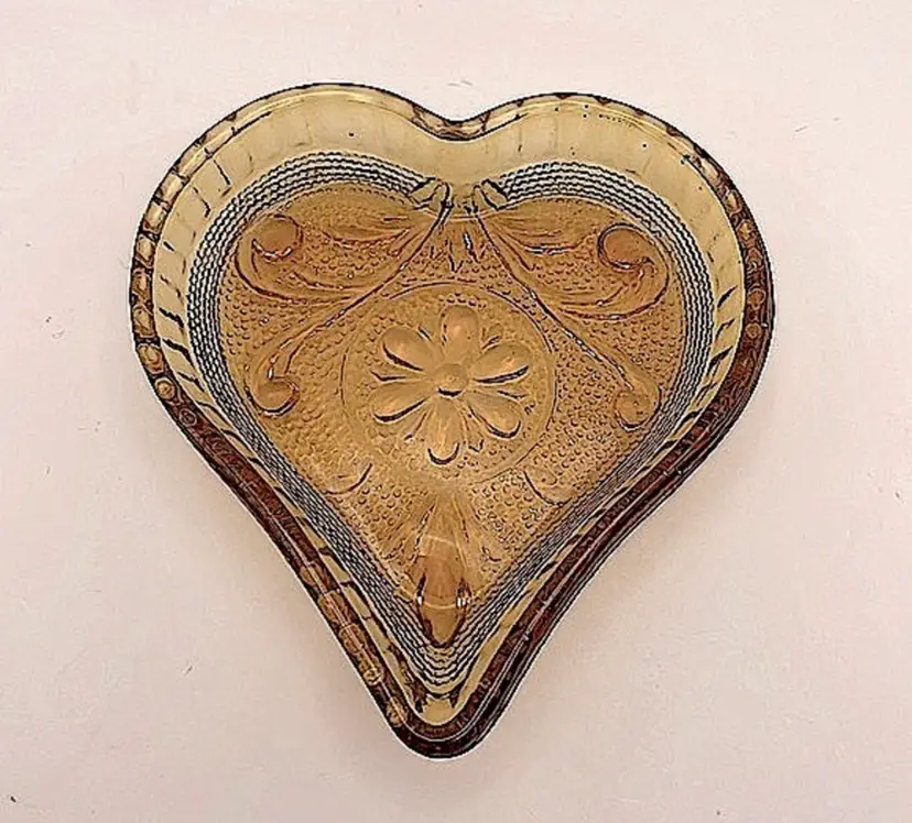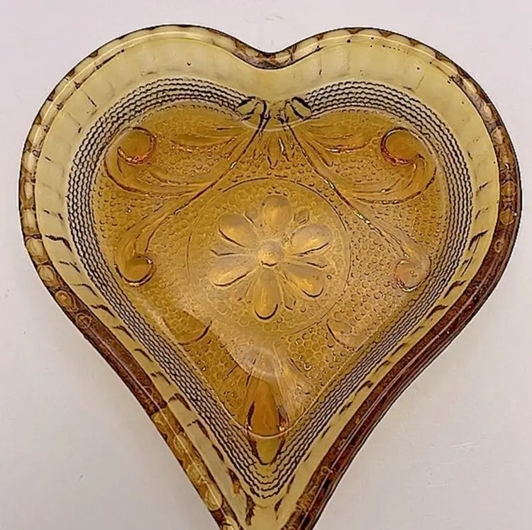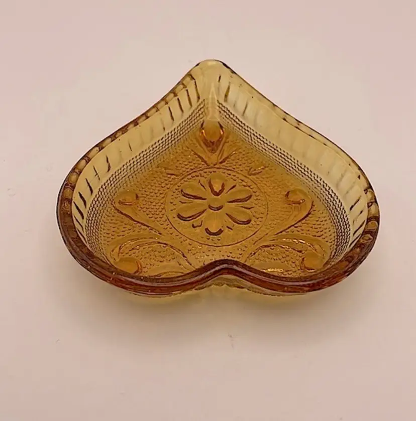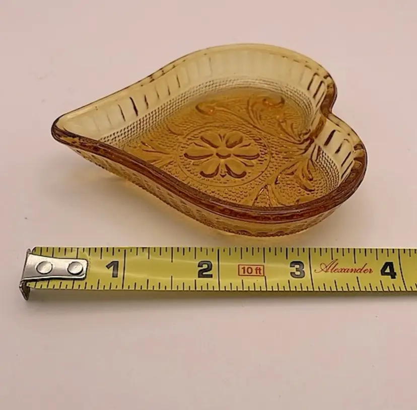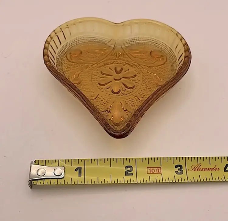 Indiana Glass Tiara Amber Sandwich Heart Shaped Trinket Dish Please see pictures for measurements.