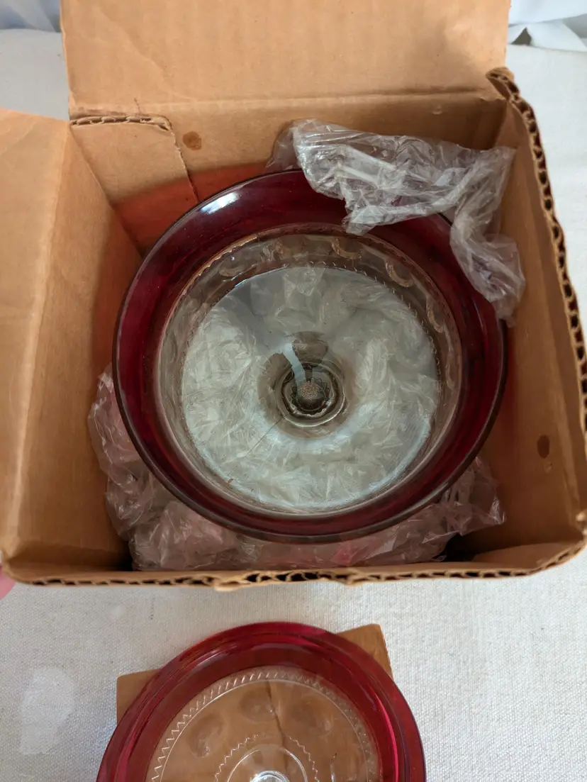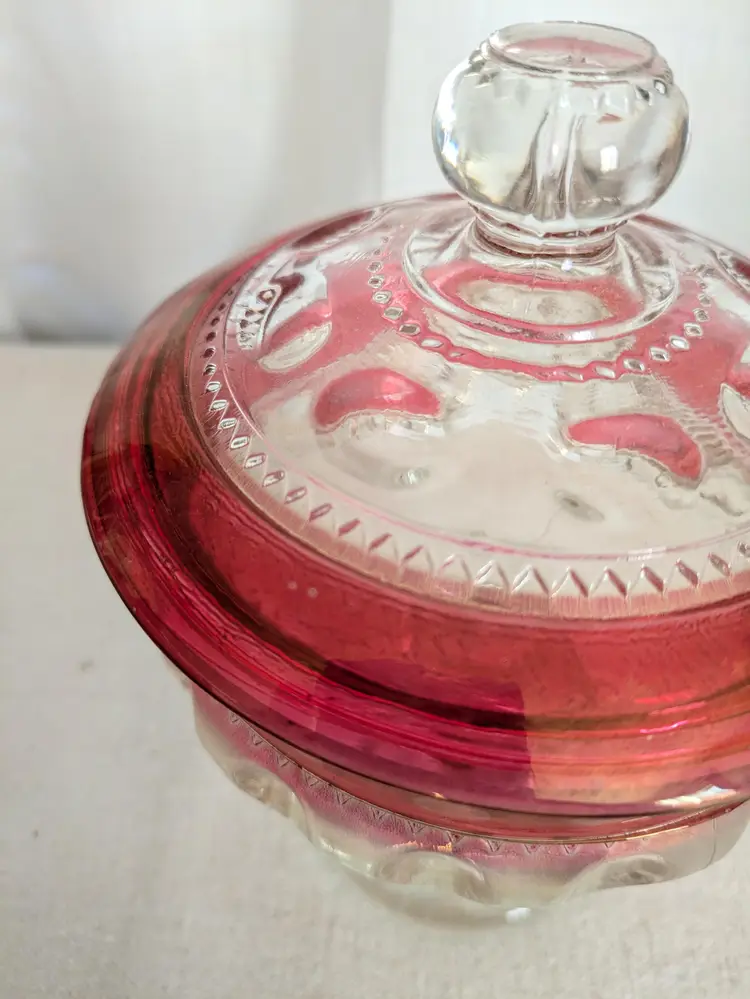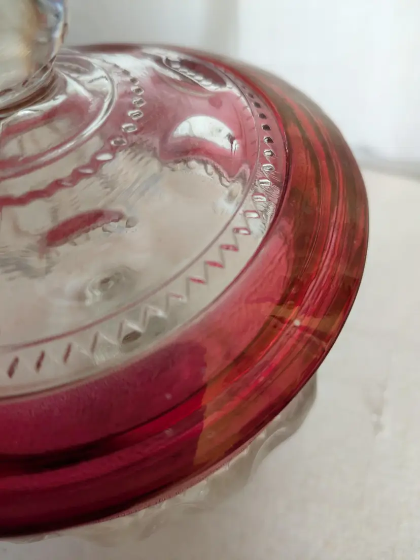 Indiana Glass vintage wedding dish compote with a ruby flash finish. Ideal for displaying candies or small treasures, perfect to fit right in with your holiday decor.