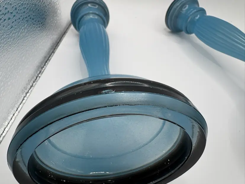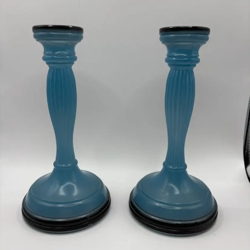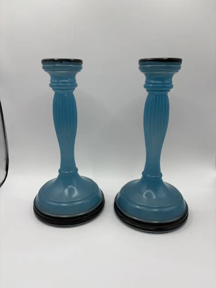Indiana Glass Wedgwood design candle holders Top and bottom trim are in black with middle ribbed blue Measures 8 1/4 inches tall with 4 inch base There is minor chips on each holder base Otherwise in great condition