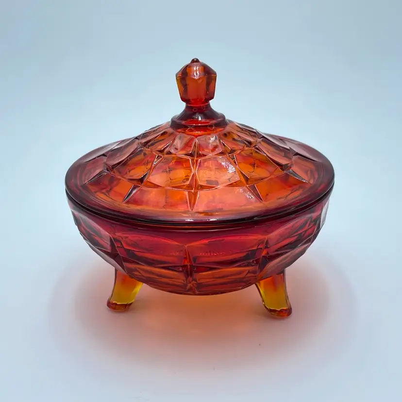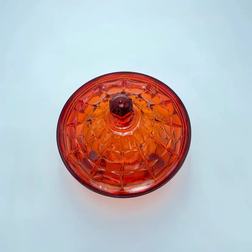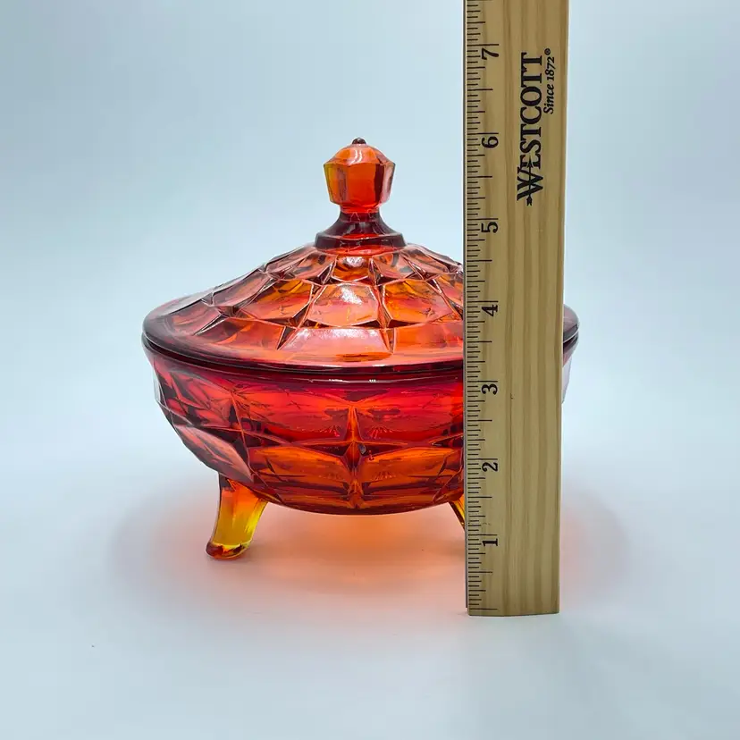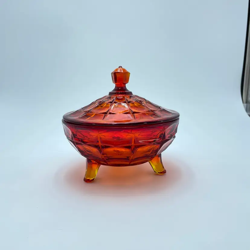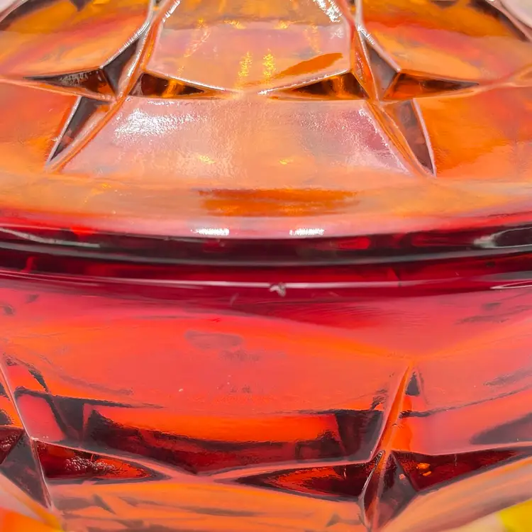 This is a vintage Indiana Tiara Glass constellation sunset amberina candy dish. It glows under blacklight. This dish is more red in natural light! Measures approximately 7" tall including lid x 6.5" in diameter. There is a small chip on the underside of the lid and a small one on the lip of the dish as shown in pictures. No other major flaws. #238