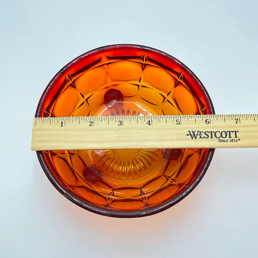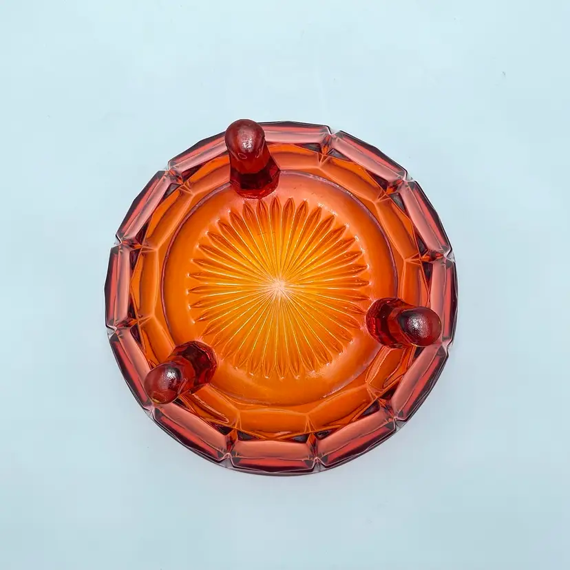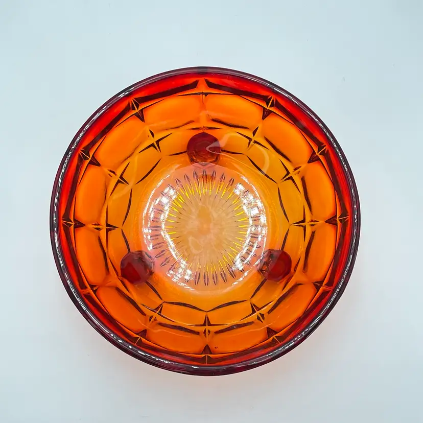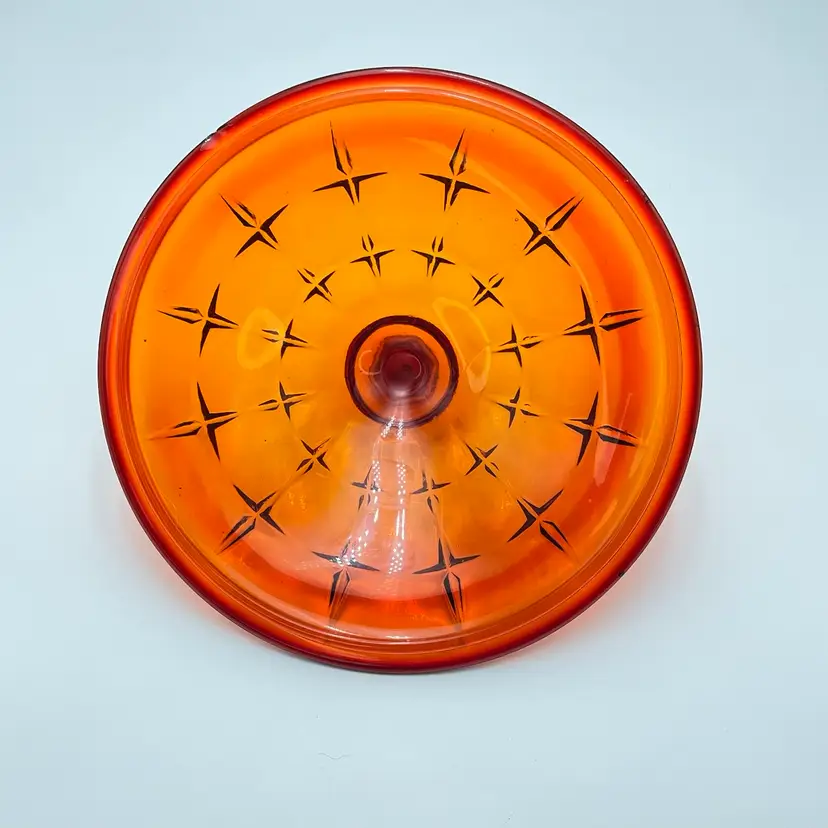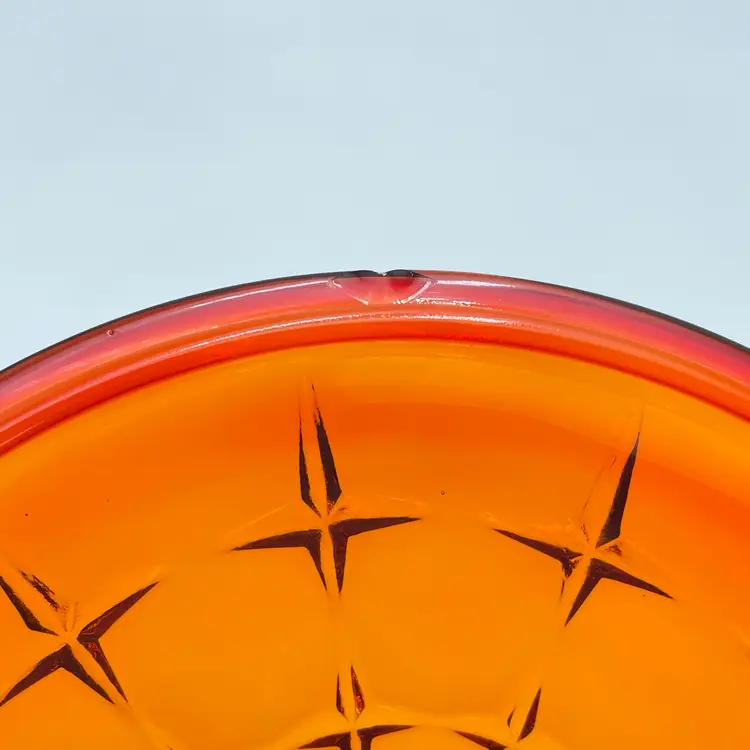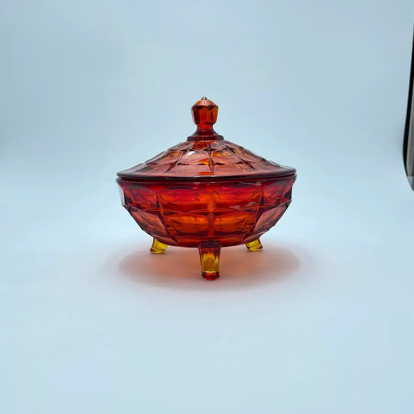 This is a vintage Indiana Tiara Glass constellation sunset amberina candy dish. It glows under blacklight. This dish is more red in natural light! Measures approximately 7" tall including lid x 6.5" in diameter. There is a small chip on the underside of the lid and a small one on the lip of the dish as shown in pictures. No other major flaws. #238