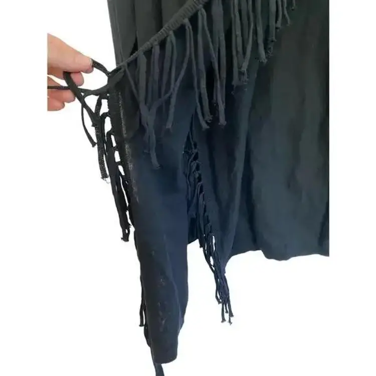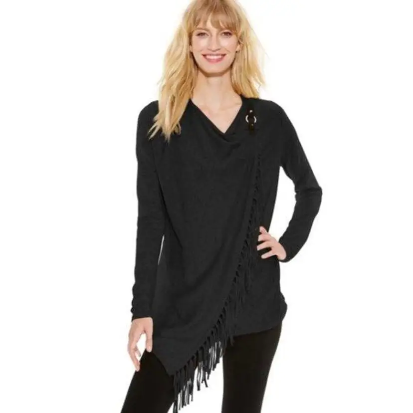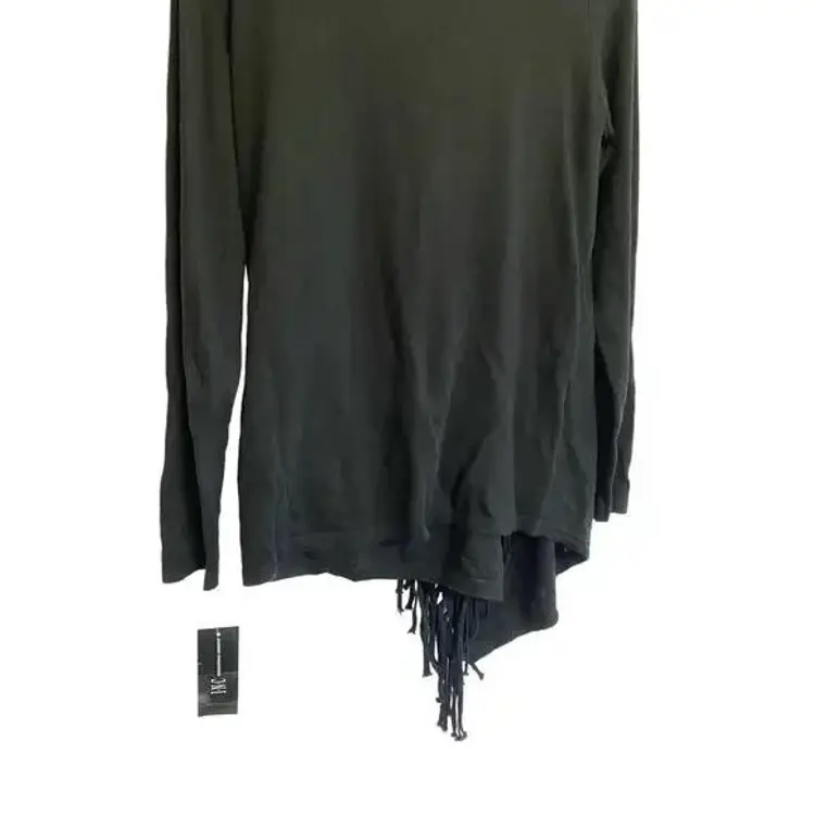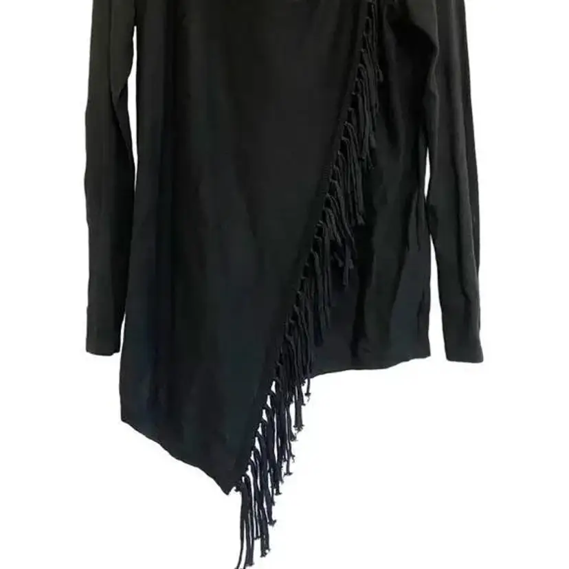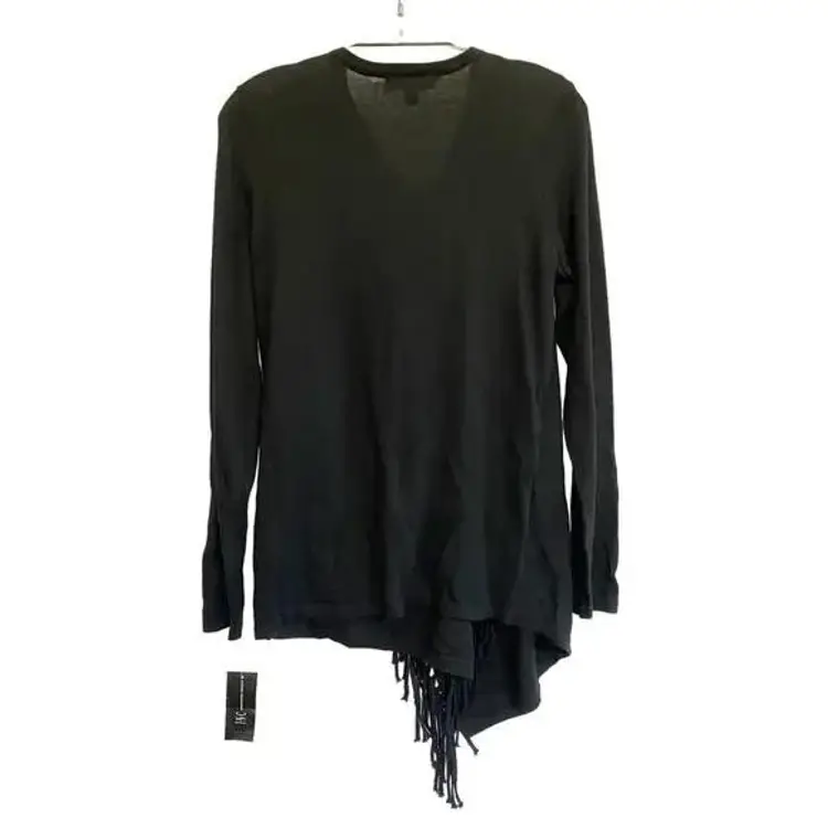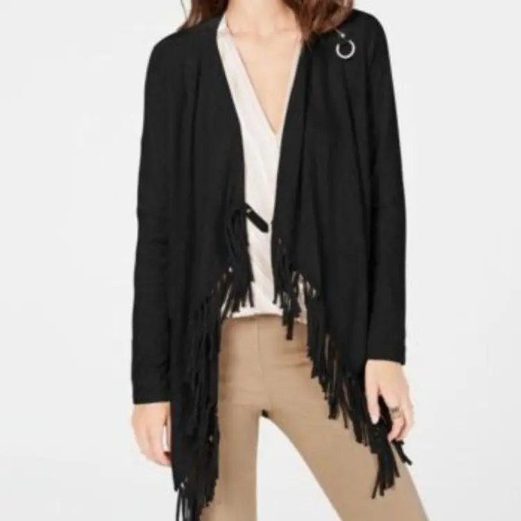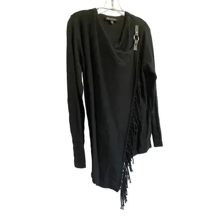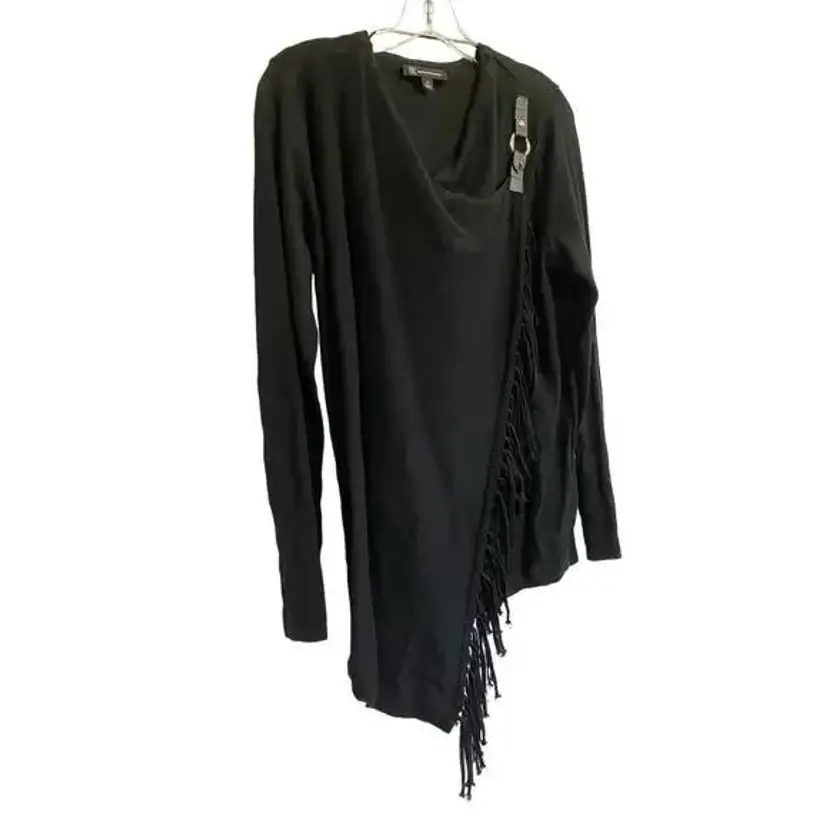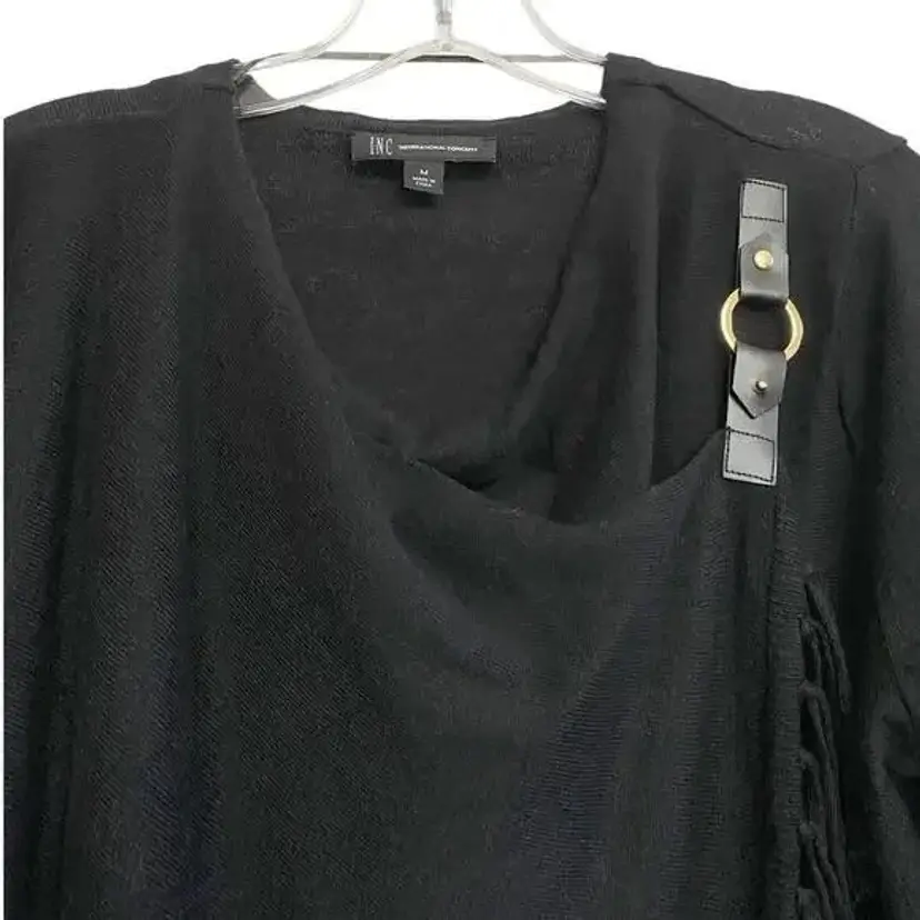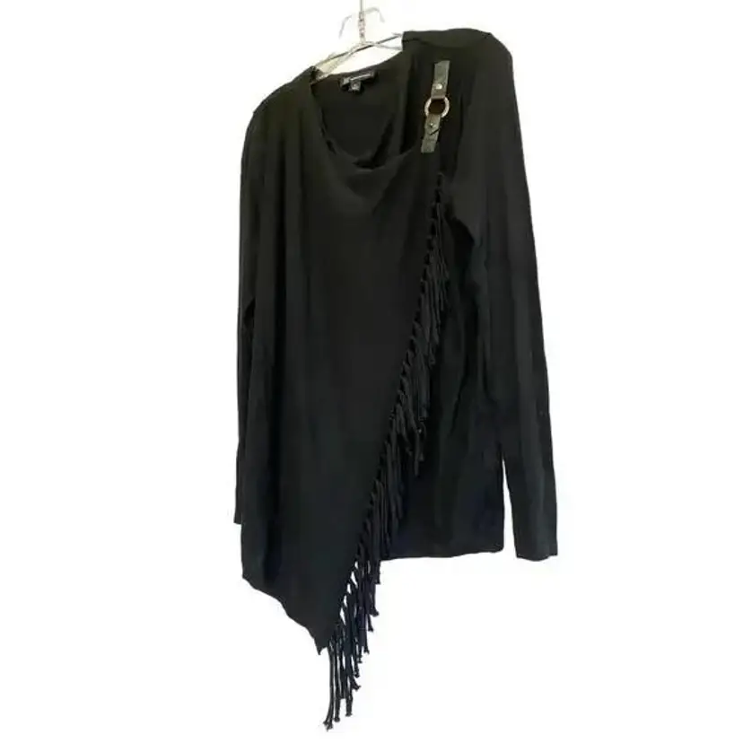 INC international concept Black fringe sweater. Cardigan cross over style with gold suede buckle closure at shoulder. This stylish black fringe cardigan features an open front design with an O-ring detail on the shoulder, perfect for adding a chic touch to any casual or evening outfit. Made from a soft and comfortable fabric blend, it offers long sleeves and fringe detailing along the hem. Ideal for layering over your favorite tops, this cardigan can be dressed up or down for various occasions.