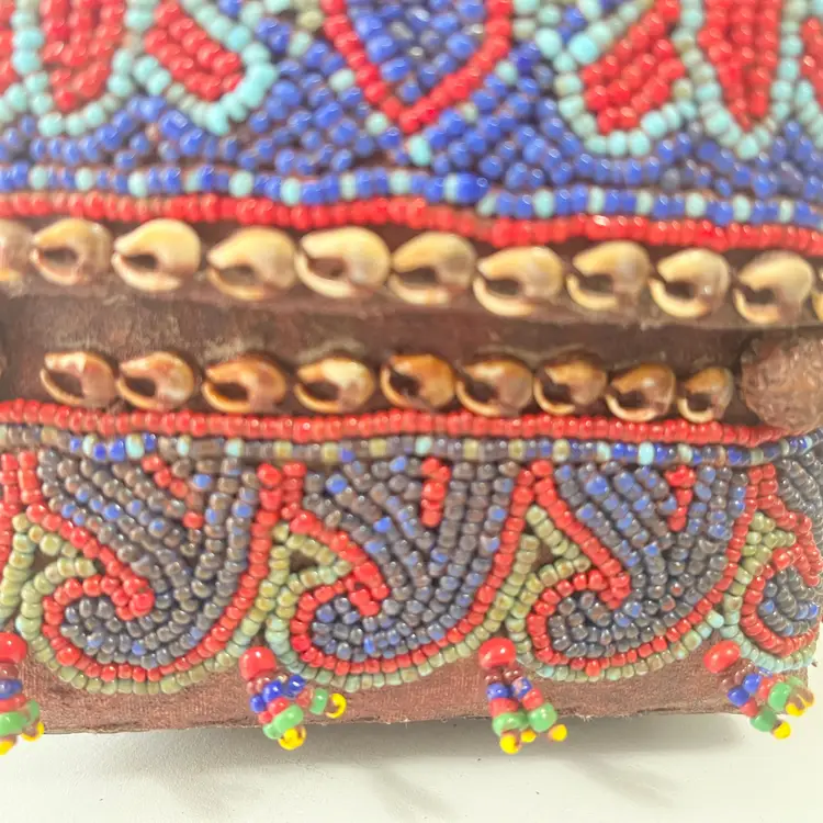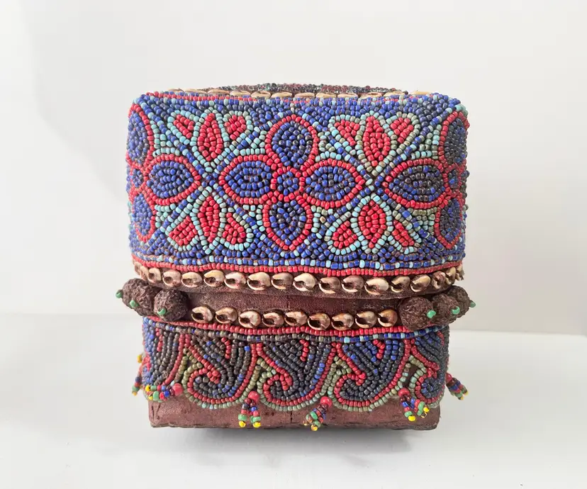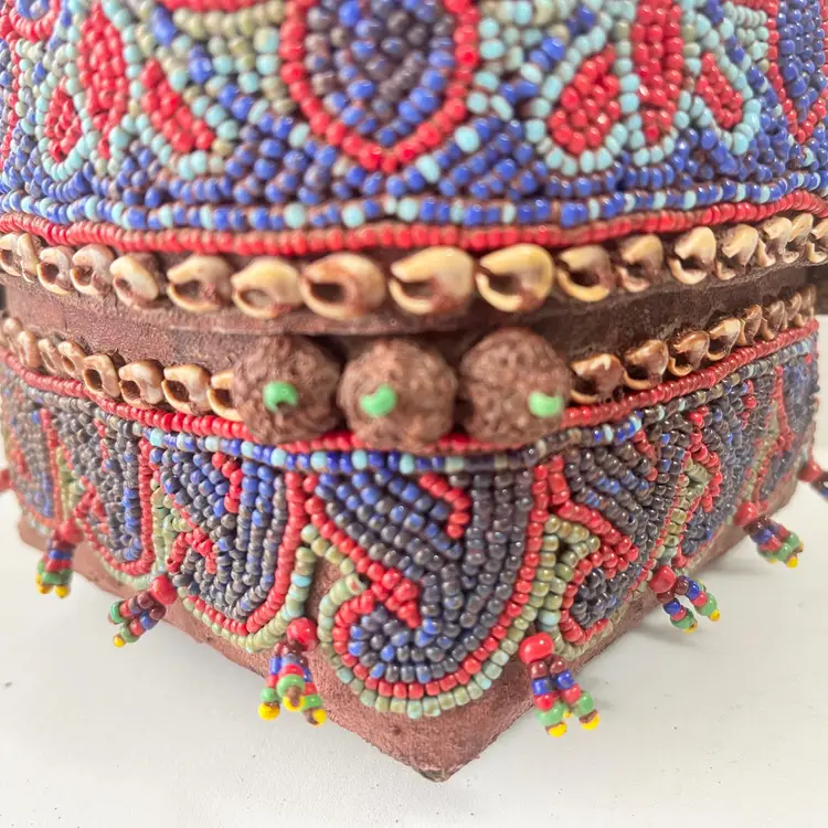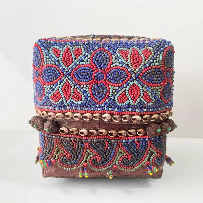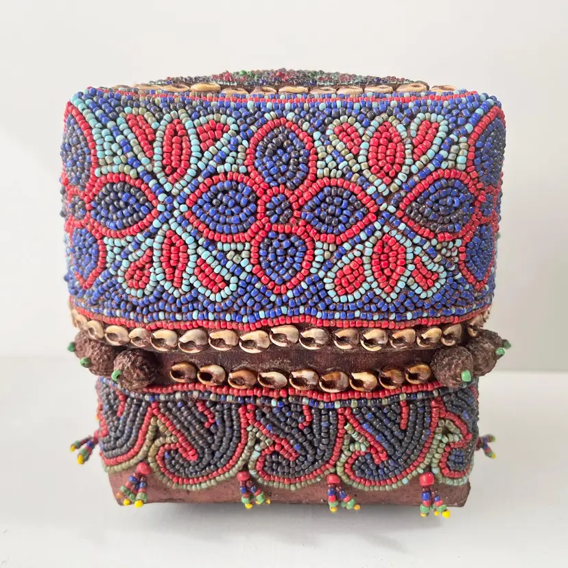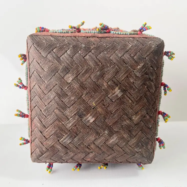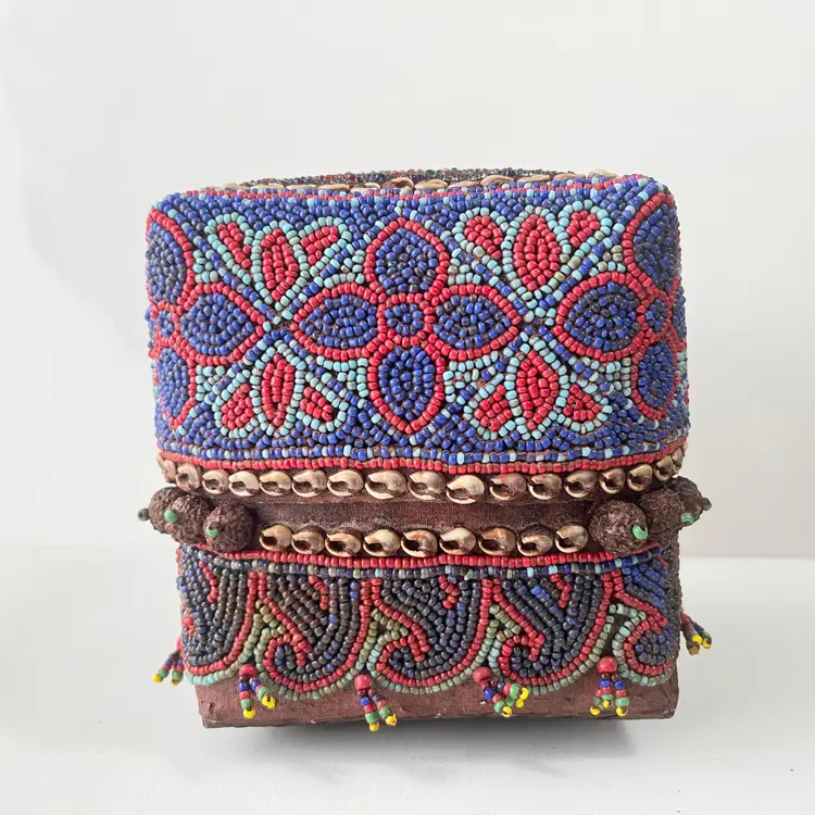 Indonesian Wedding Gift Box Beaded Shell Woven Bamboo Basket Dowry Floral Vtg Island of Sumatra exotically decorated box Great craftsmanship Hand made with attention to detail by skilled artisans A beautiful representation of Indonesian tradition and Asian culture Intricate beadwork with shell embellishments (blue, red and gold beads) Woven bamboo rattan design Made in Indonesia Perfect for bride wedding gifts, jewelry, rituals or interior decor Condition: Used. The beads, shells and bamboo are in good condition. Measures 5 inches x 5 inches x 5 inches Packaged in a plastic sleeve inside a rigid envelope Visit my store to see more vintage ephemera, advertising, novelties, gifts, estate sale and yard sale finds https://district.net/u/finderspickerspaper SKU B6 Bin
