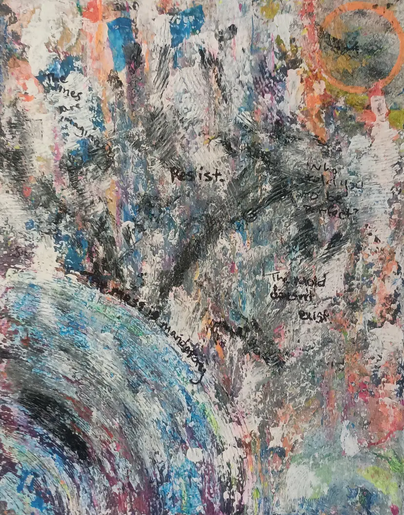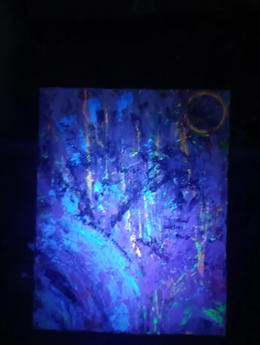 Alcohol ink, acrylic, modeling paste, sharpie on 11x14" stretched canvas. U.V. reactive, abstract