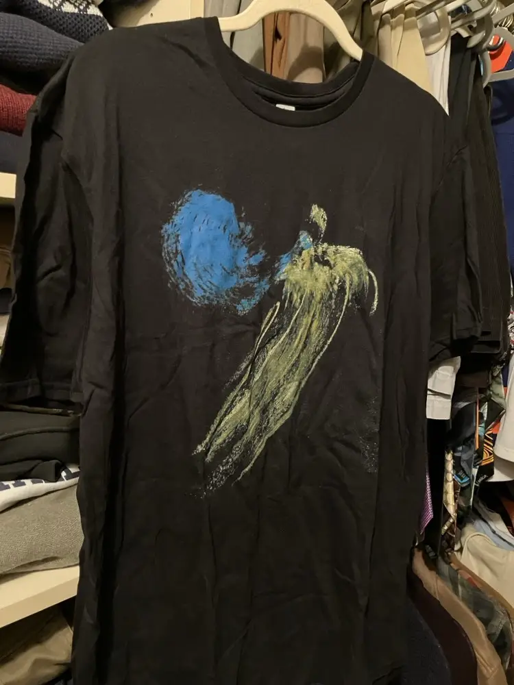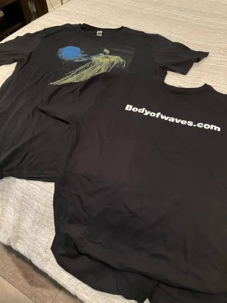 Striking Black High Quality Soft Cotton Tees from Gildan. These Tees contain my abstract image representing creative force and the infinite nature of life emerging from the formless into form on the front; and, my website: Bodyofwaves.com on the back.