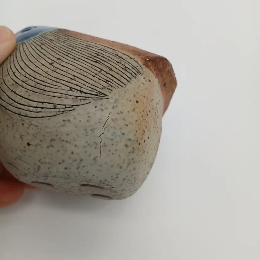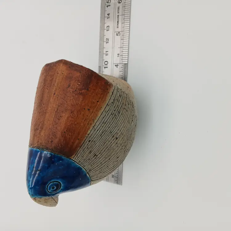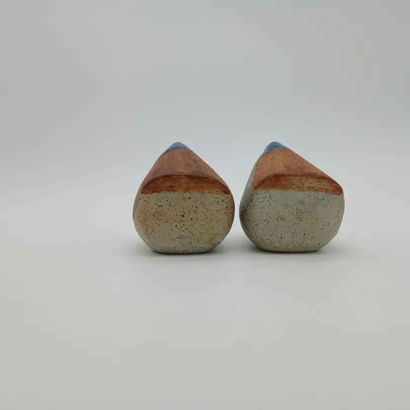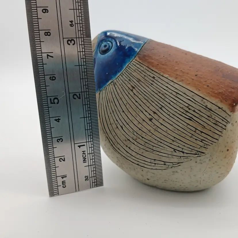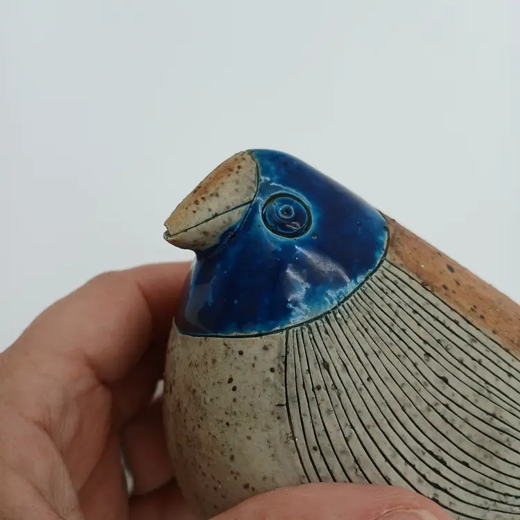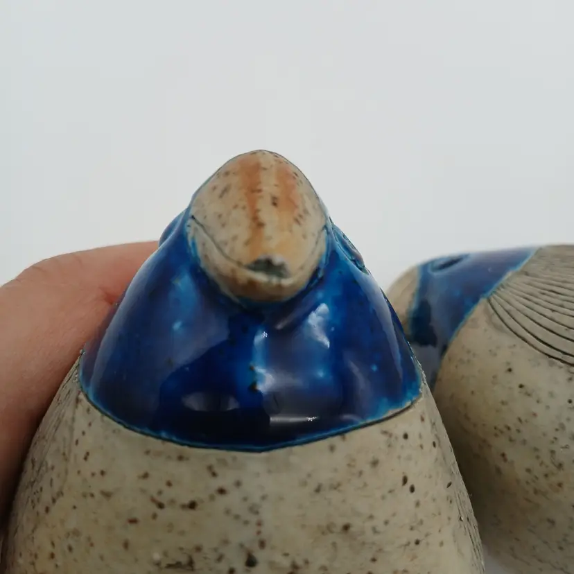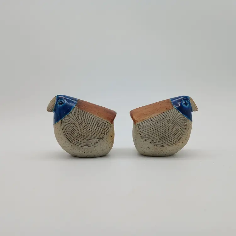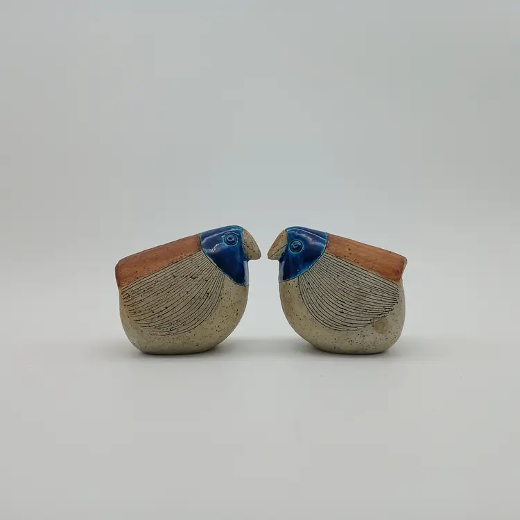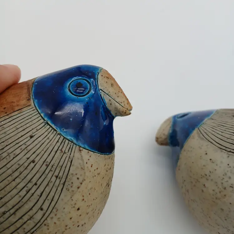 Amazing and rare adorable stoneware modern tropical bird figurine with striking, vibrant turquoise head and eyes, and spotted chamotte base. These birds were intricately sculpted with feather details and rusty brown upper. Handpainted by Inger Persson for Rorstrand Atelje Series, these birds are true collectors pieces. Both of the birds are in excellent vintage condition. One of the birds has what is either a very small chip or a "flaw" from the creation process. The other bird has a small spot of surface crazing (?) not really sure how to describe it but both of these are shown clearly in the photos. They are both signed on the bottom by the artist. The birds are about 3.25" tall and about 3.5" wide at the bottom.