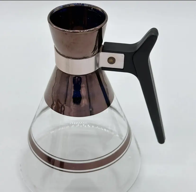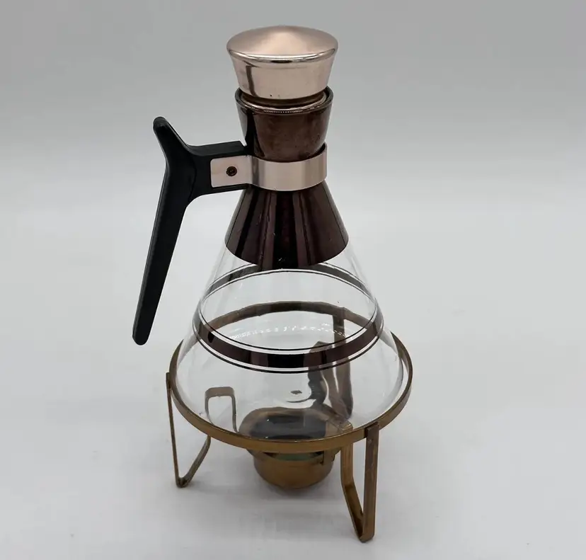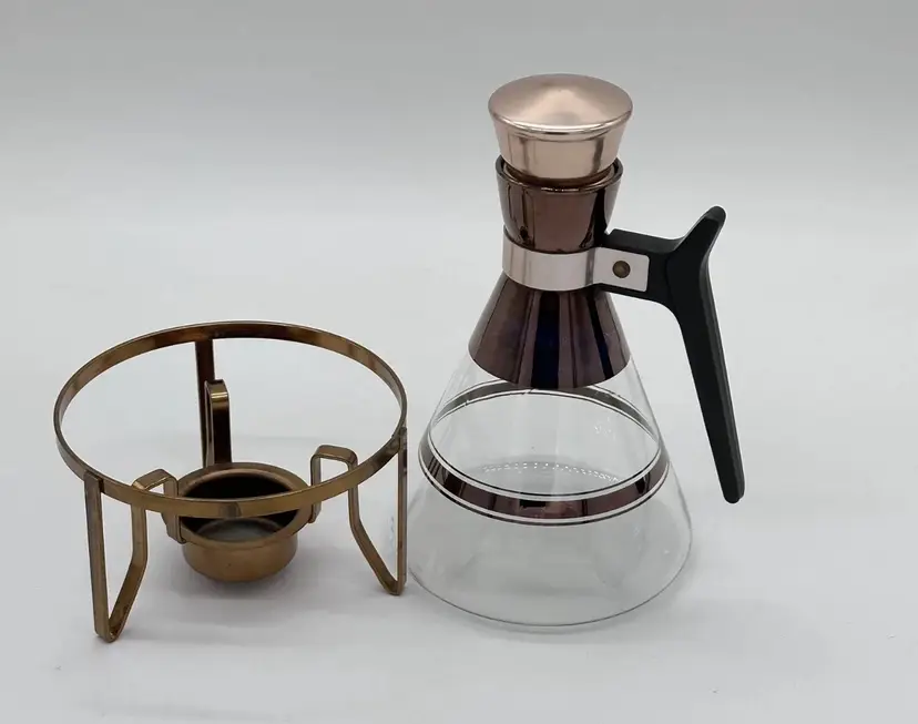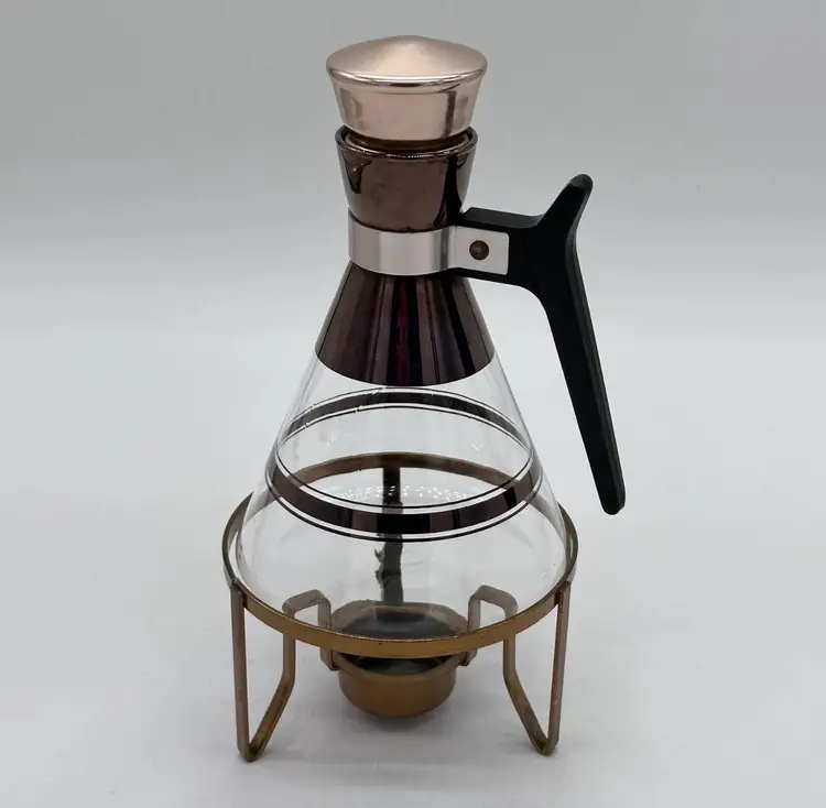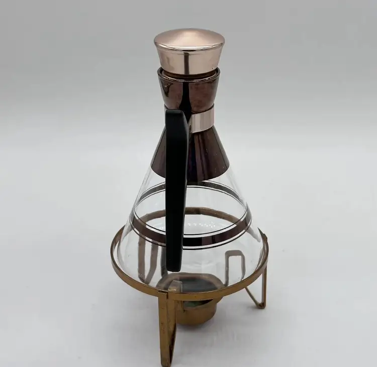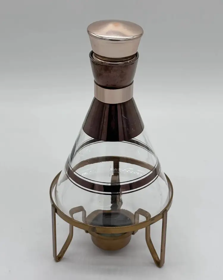 Vintage Inland Glass Carafette Carafes and a coffee warmer. The sleek and stylish design of the carafe make it a perfect addition to any mid-century modern collection. Made in the United States in the 1960s. Condition is used and in good condition. There is wear and scratches on the copper coloring on the glass. There is scratching and patina on the copper color of the metal base. The cork part of the stopper has some staining. Measures approximately 9 inches tall and 4 3/8 inches in diameter at the base.