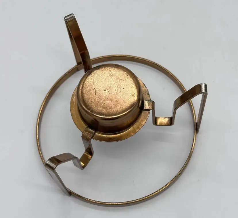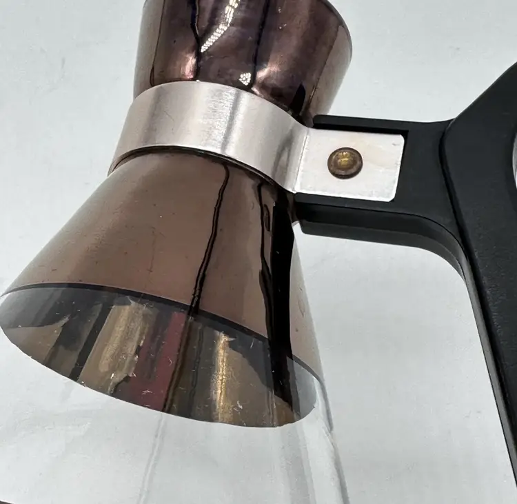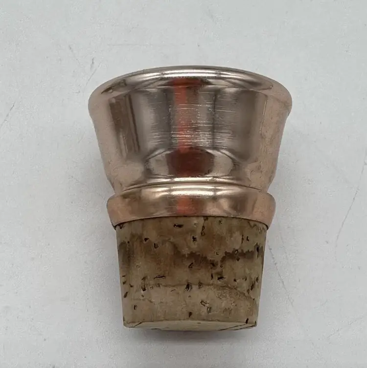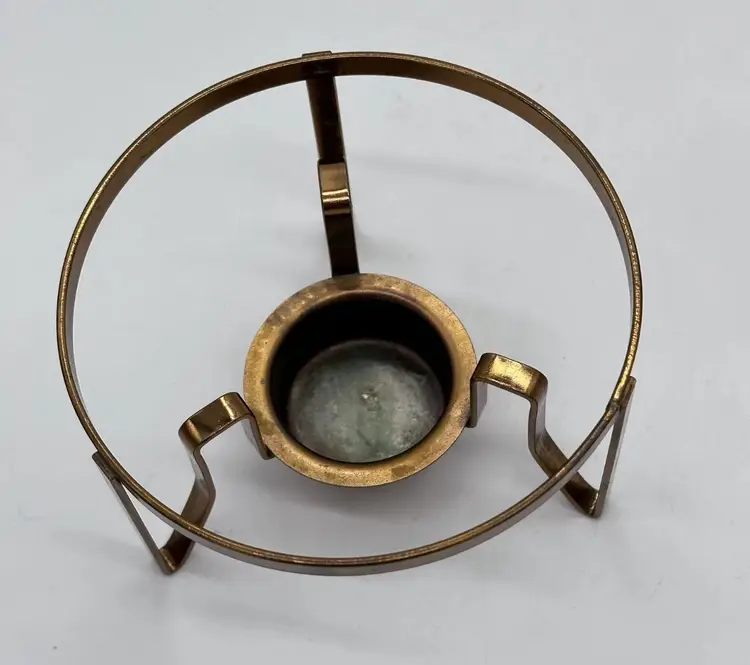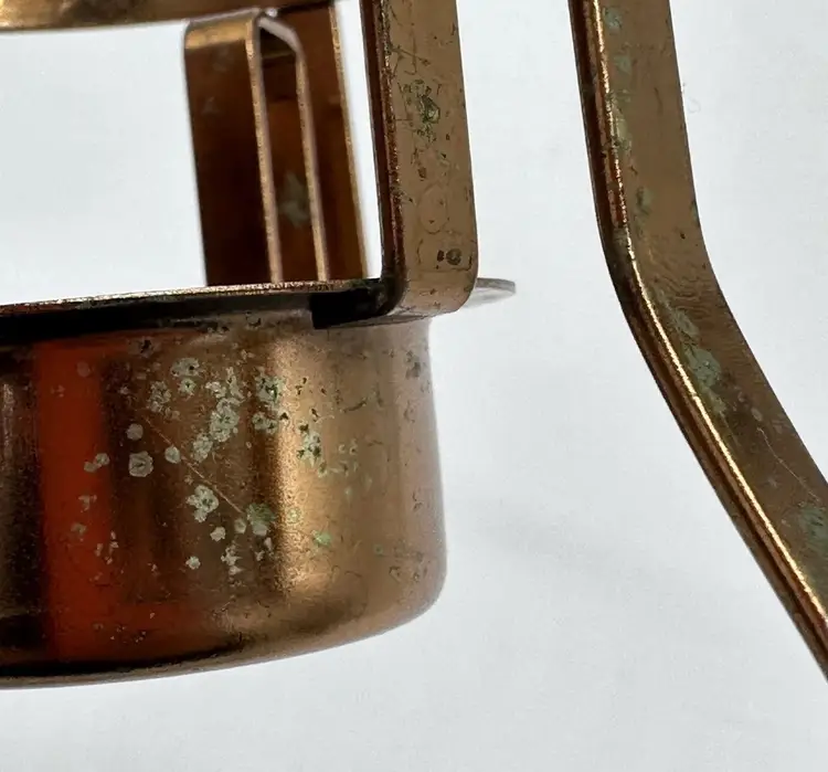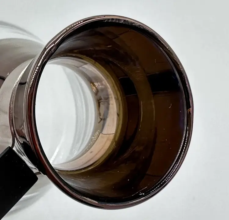 Vintage Inland Glass Carafette Carafes and a coffee warmer. The sleek and stylish design of the carafe make it a perfect addition to any mid-century modern collection. Made in the United States in the 1960s. Condition is used and in good condition. There is wear and scratches on the copper coloring on the glass. There is scratching and patina on the copper color of the metal base. The cork part of the stopper has some staining. Measures approximately 9 inches tall and 4 3/8 inches in diameter at the base.