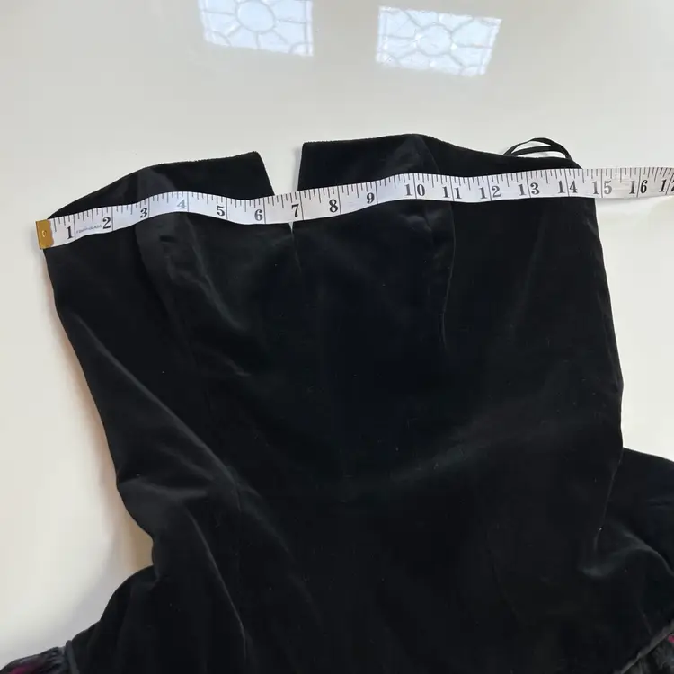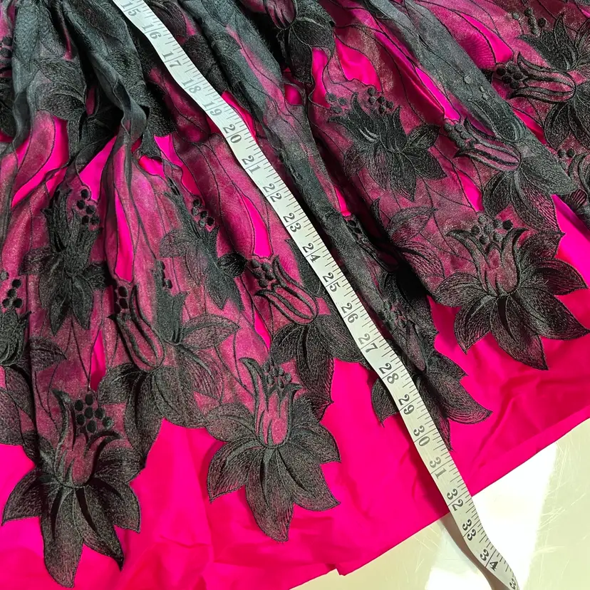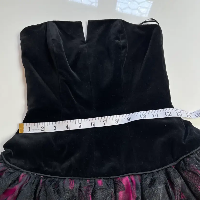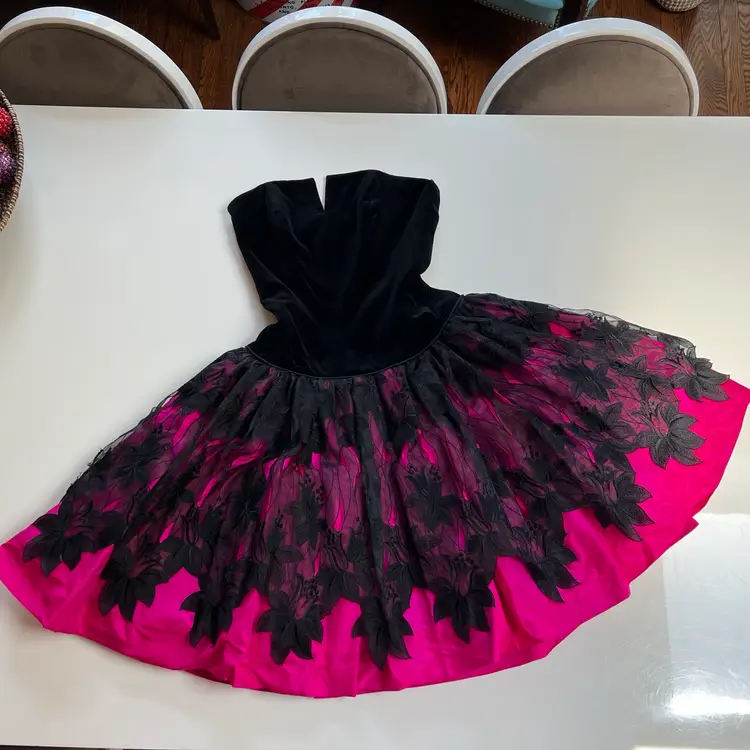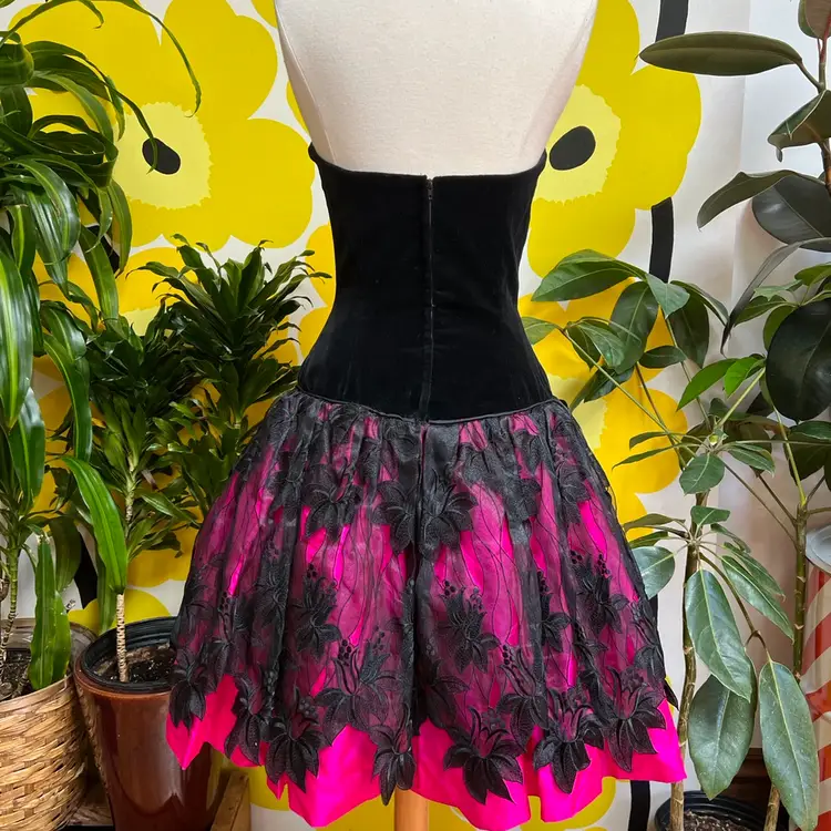 Bright neon pink and black velvet- the photos do not do this baby justice! Boning in corset bodice and several layers of crinoline and fabric in skirt for the petticoat fit and flare loook—- super flattering!