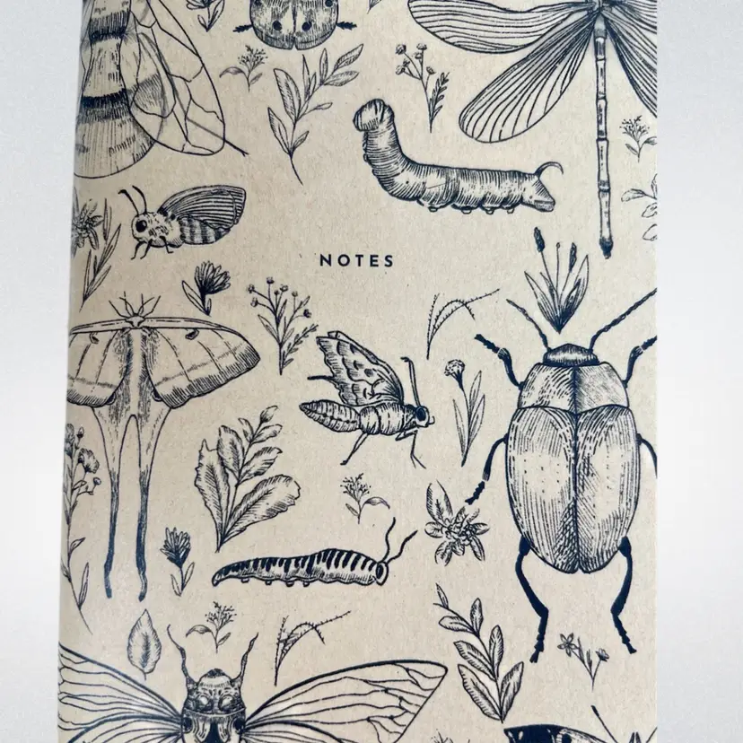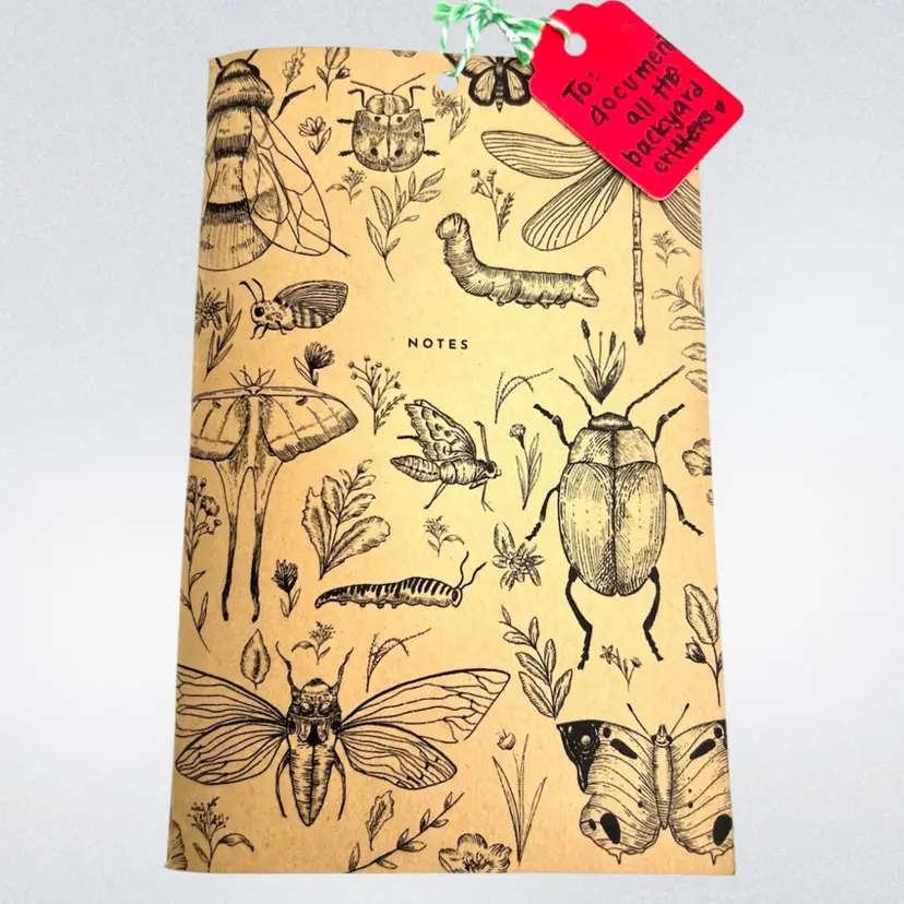 Insects Bugs Brown Paper Blank Field Notes Journal Notebook Both Covers have Bees π Dragonflies Moths Caterpillars π Beetles πͺ² Butterflies π¦ Plants π± Leavesπ 8β x 5β Weighs 4 ounces Condition: Blank, Looks never used It must have been a gift due to a heart cut out on back cover with a note & also has a gift tag on front cover.