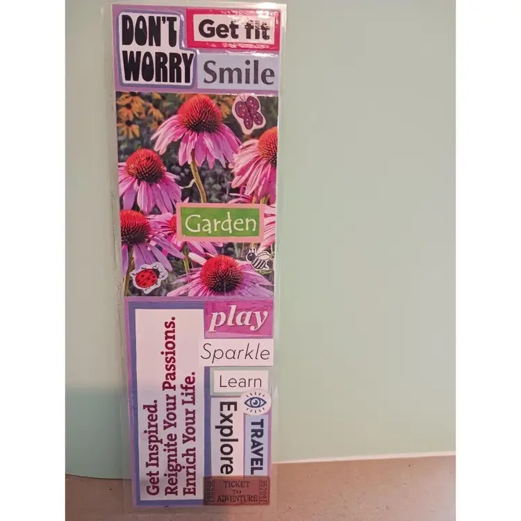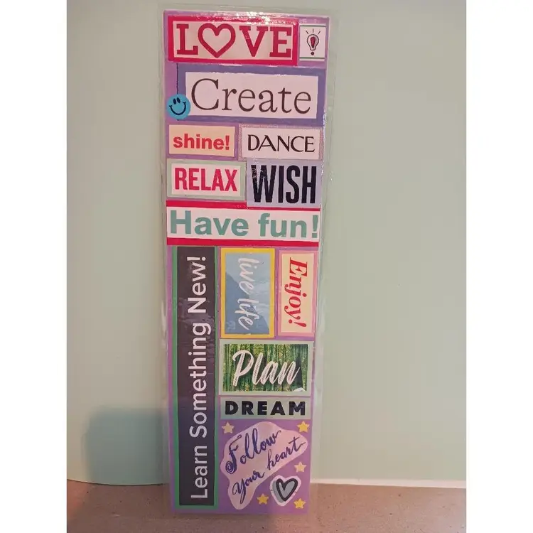 I create bookmarks and vision boards from words and pictures cut out of magazines. Some of the magazines date back to the 1940s! It is my goal to use only recycled found materials, and not buy anything. Occasionally I can't find a word, like NikNax, and have to cheat and type it and print it out.