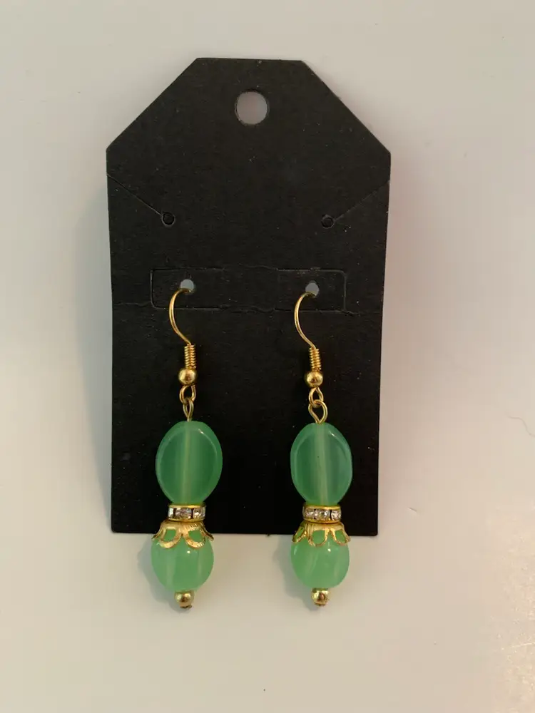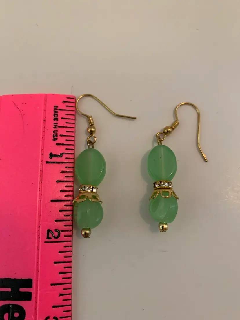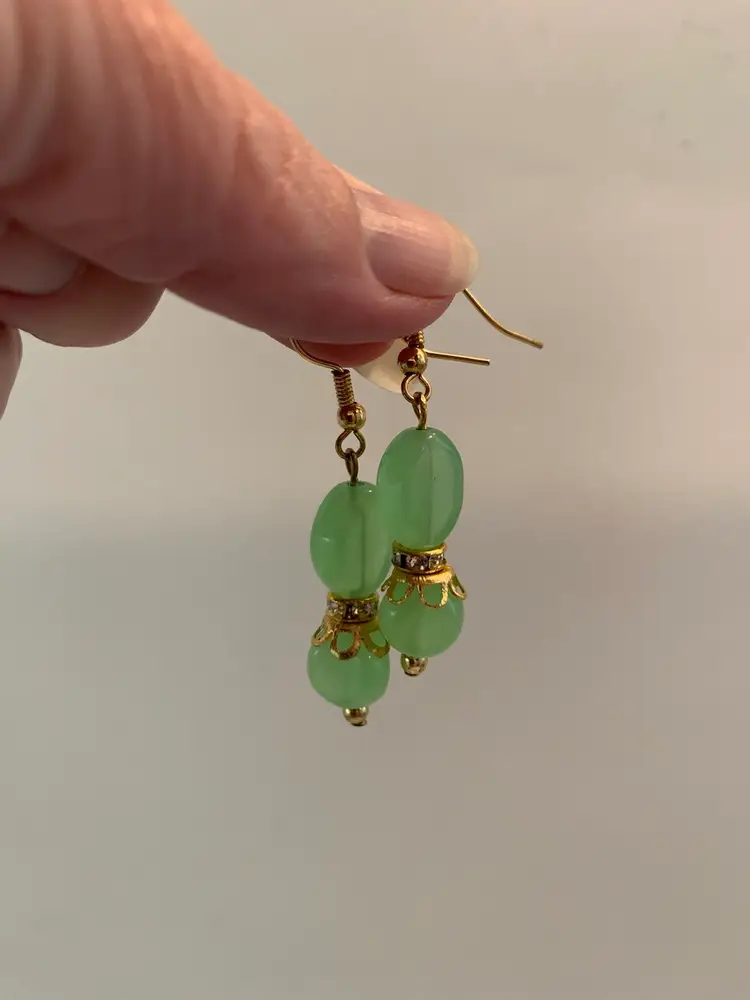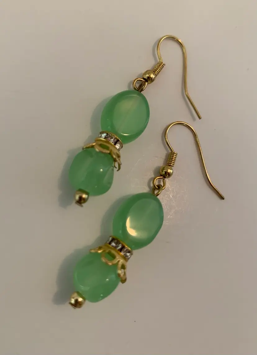 Handmade earrings made from jadeite green glass beads, vintage gold toned bead caps, rhinestone spacer beads and gold toned fish hook earring findings.