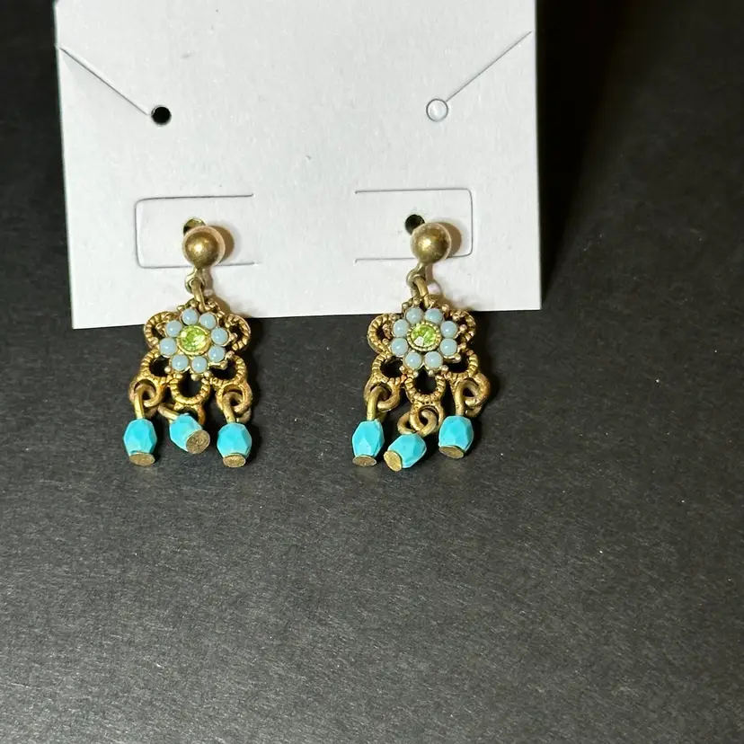 These earrings are vintage Avon faux turquoise dangle earrings featuring a boho design. Faux turquoise, dangle earrings with a bohemian aesthetic. Crafted in the United States, likely during the 1980s. Intricate filigree with blue accents and a center stone.