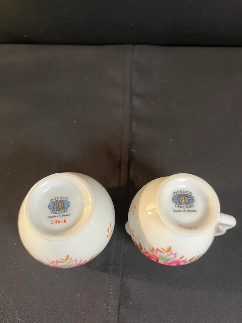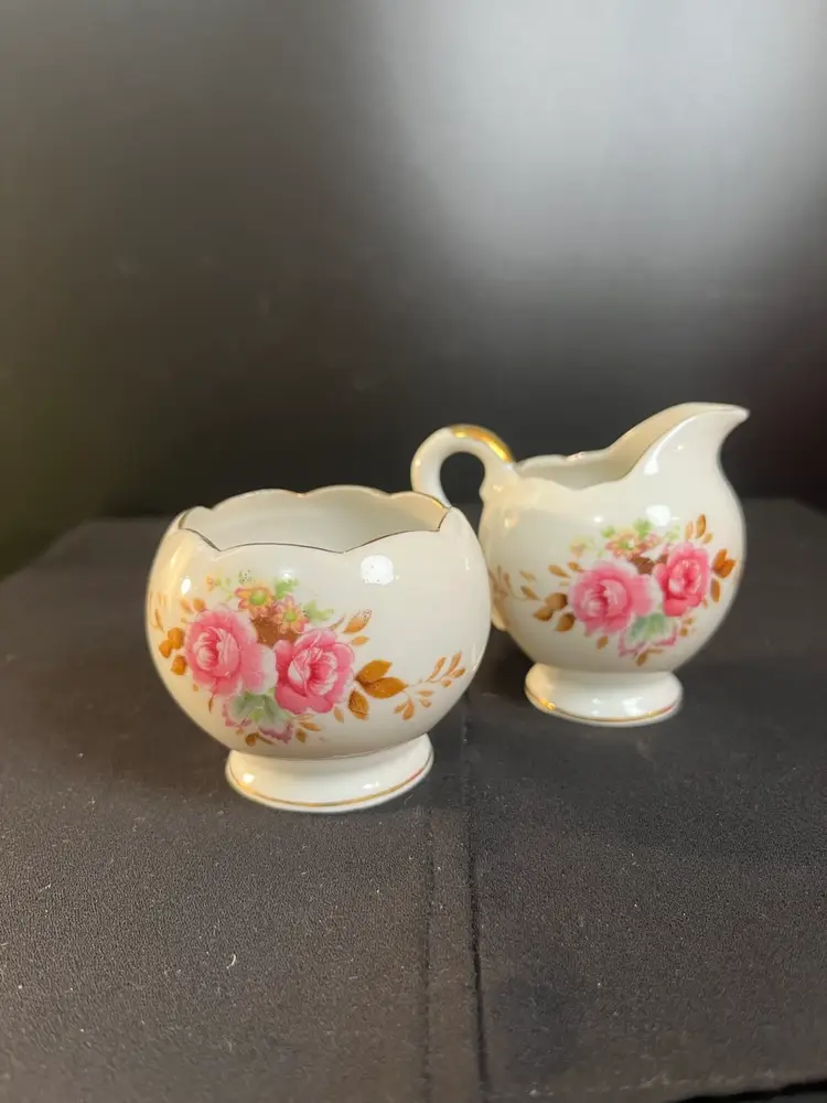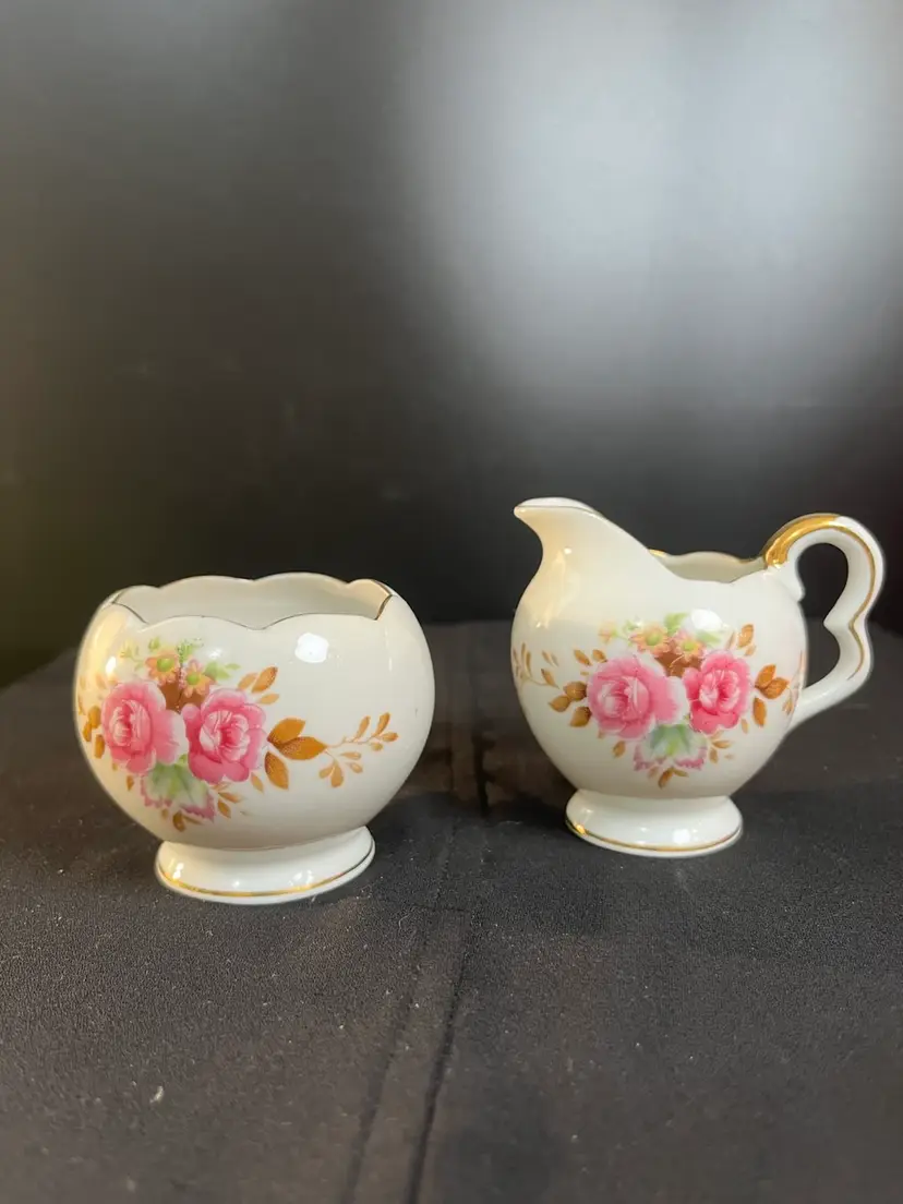 Smalls....Cute set that is in perfect vintage condition. There are NO call outs. Stamped makers mark w/ Logo and the item number is: 5/9618 on bottom of both pieces. Creamer is approx 2.5"H, 2.75" L, 2 1/8"Deep. Sugar-ruffled rim (was meant NOT to have a lid) 2"H, 2 1/4" Diameter. Together the pieces weigh 3.3 Oz