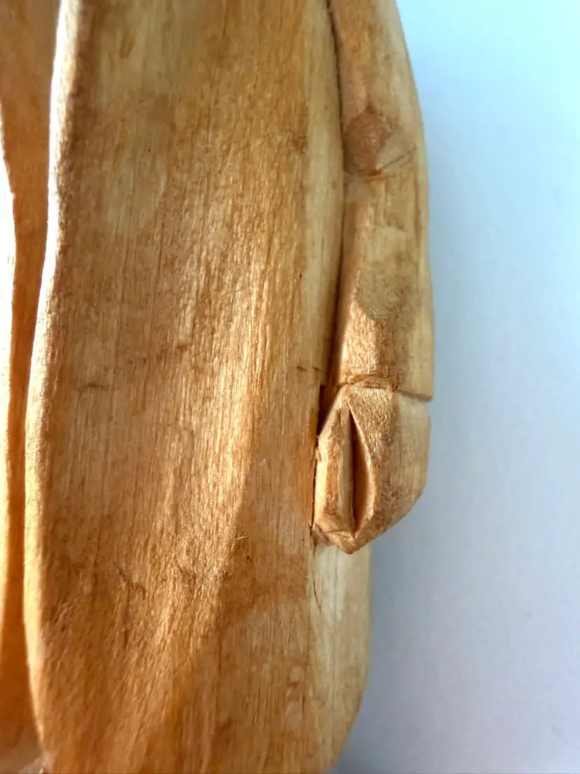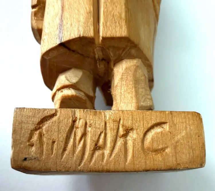 This carving is made from a soft and light piece of wood. The artist signed his piece: MARC