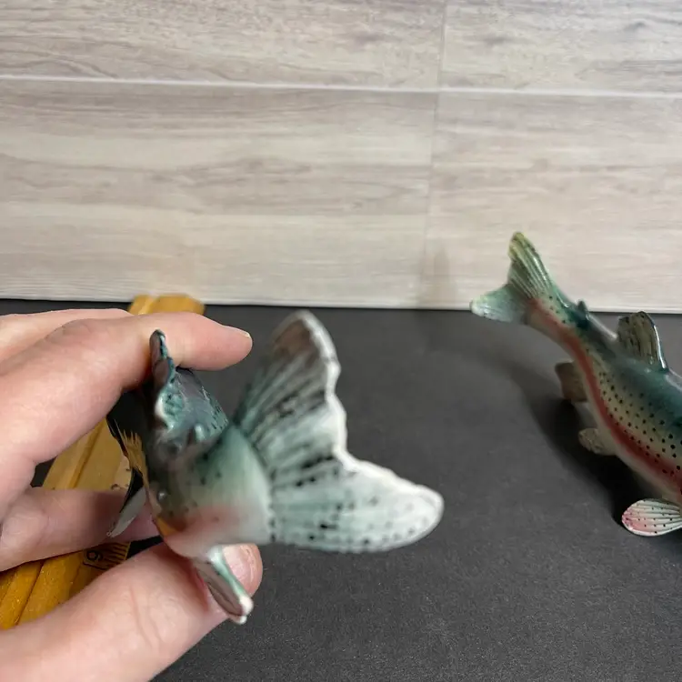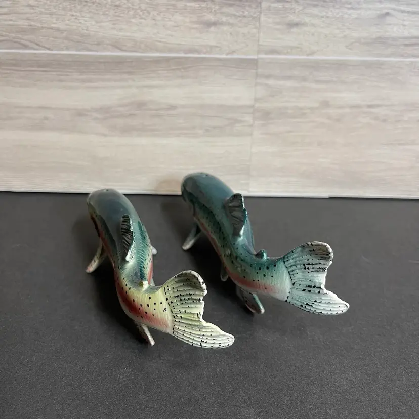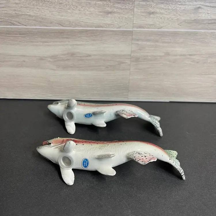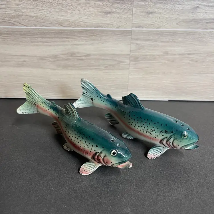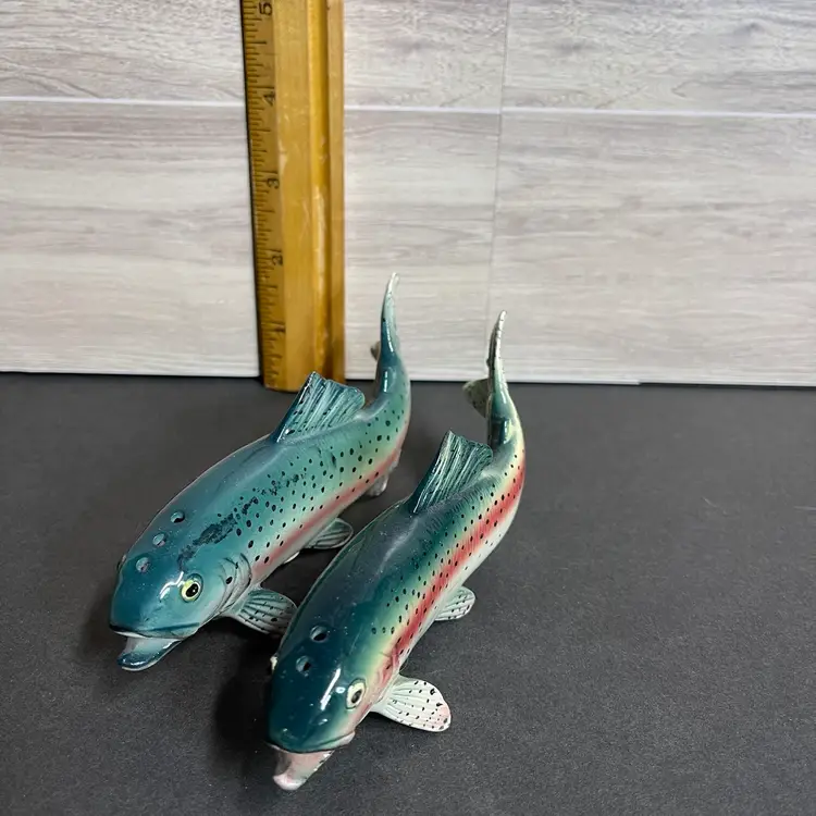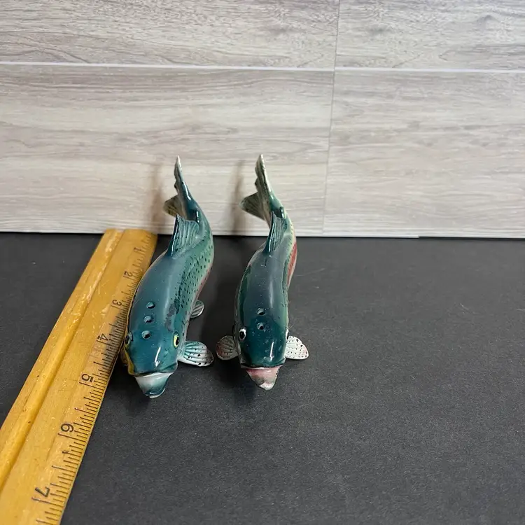 Made in Japan each fish is 2” tall, 1” wide and 5.5” long the pepper shaker (3 holes) has a tiny chip on its tail.