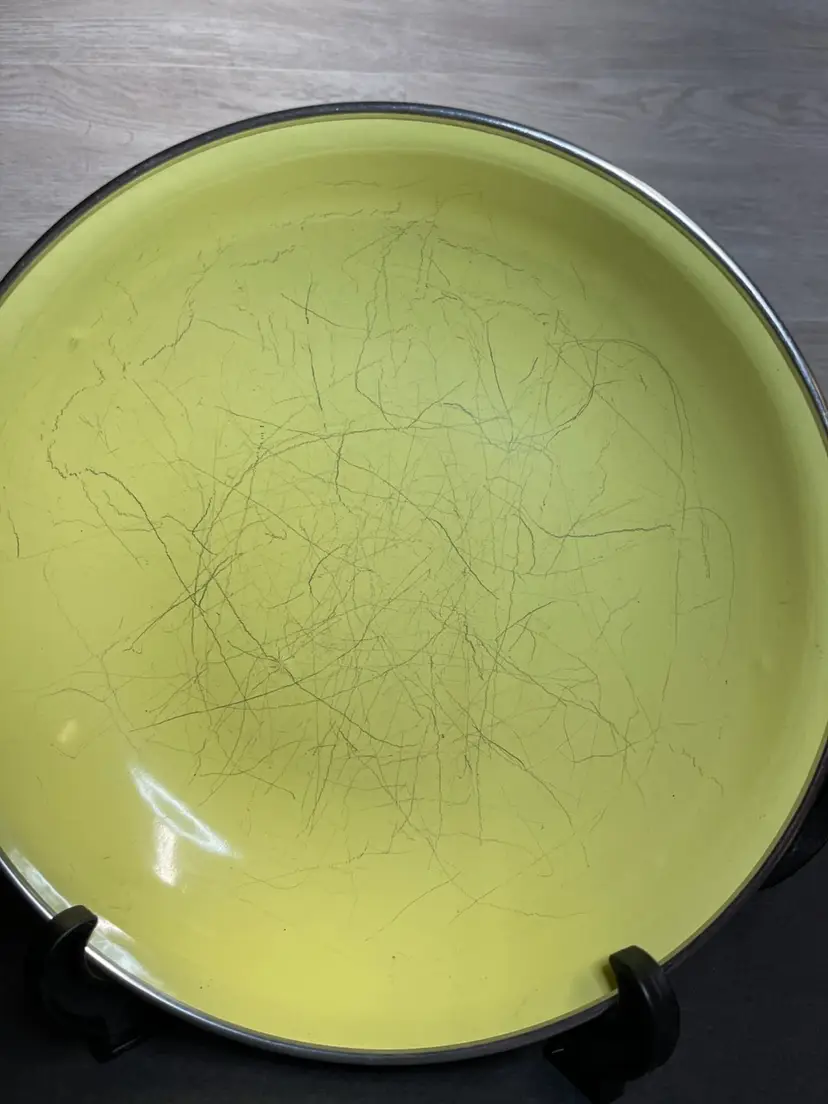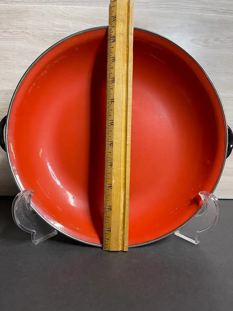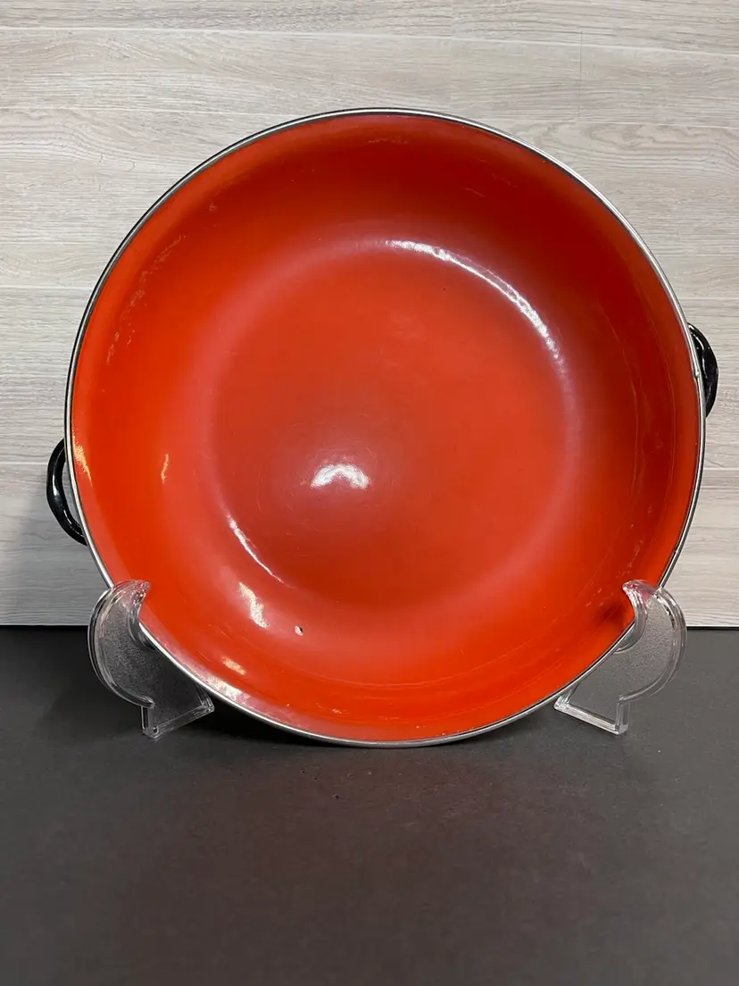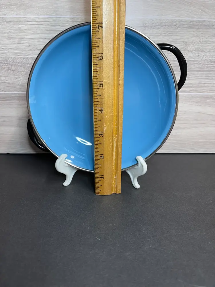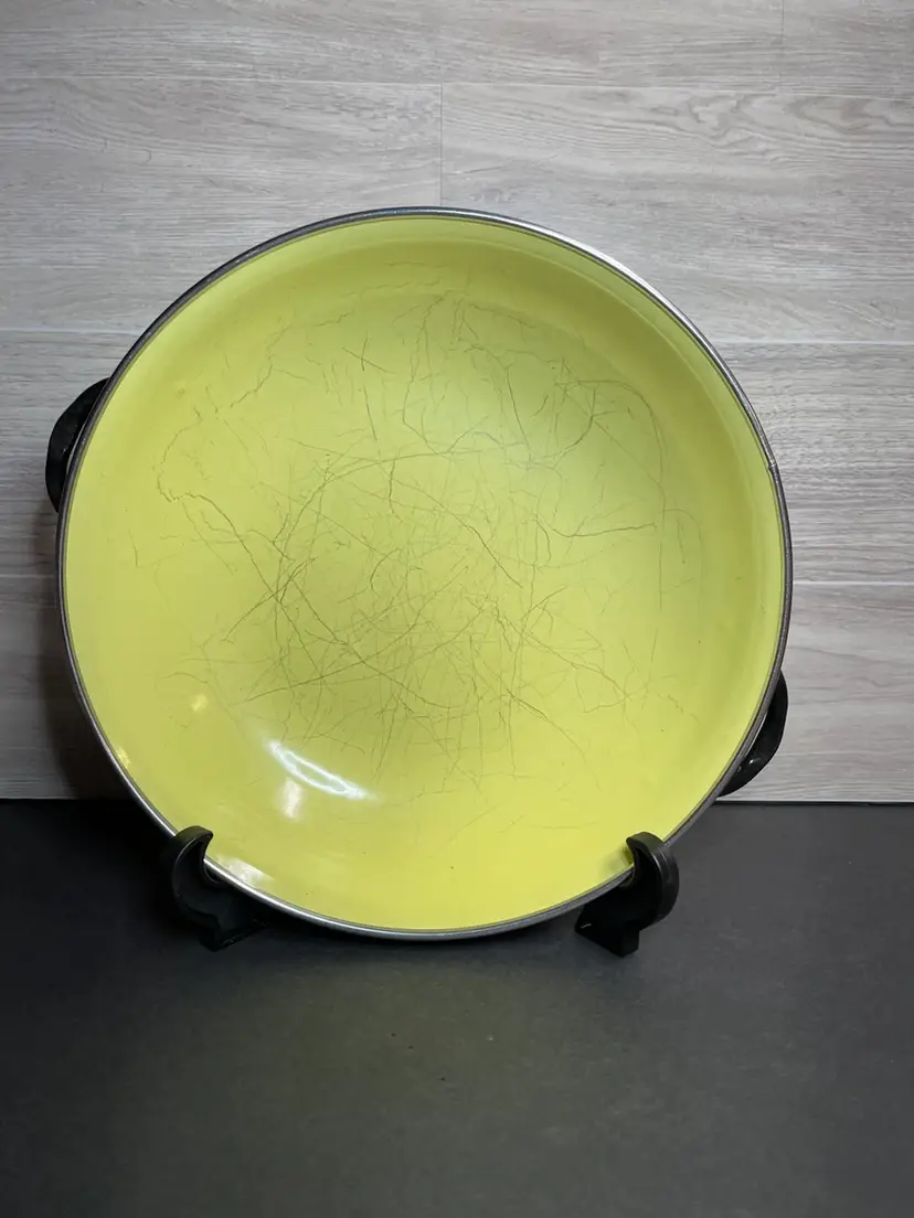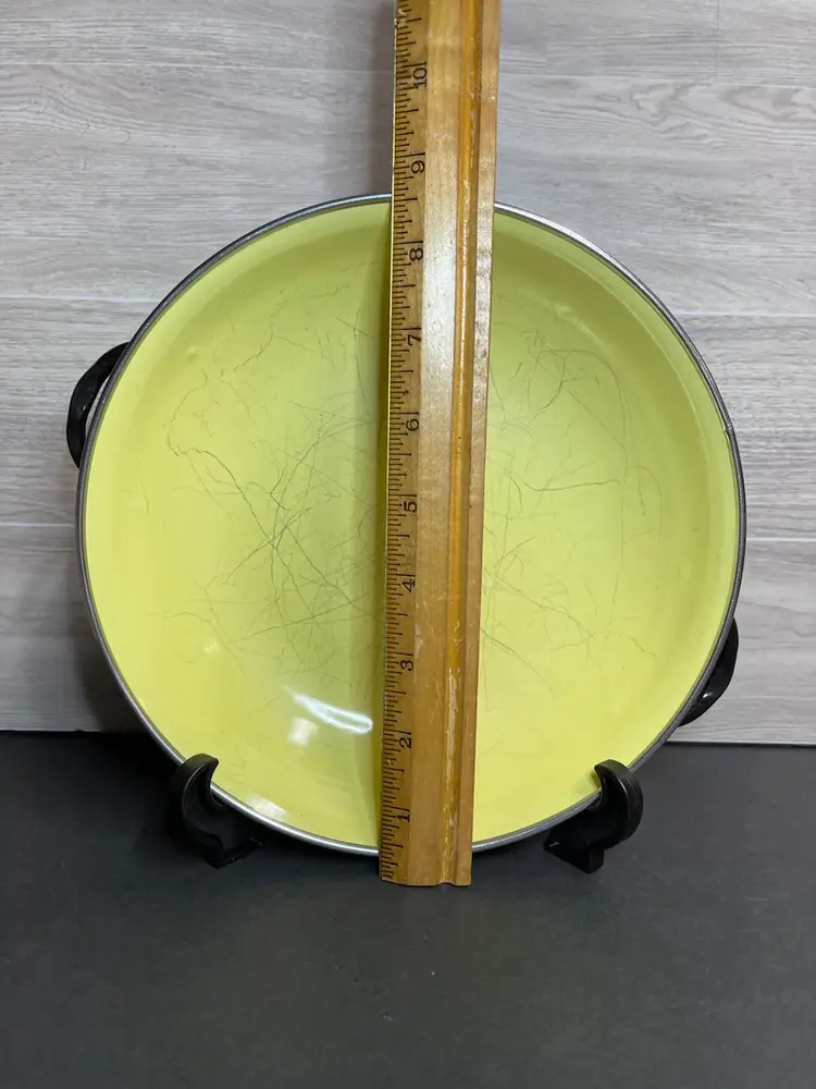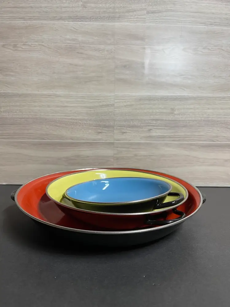 Includes 3 pans 10.5” Red, 8.5” yellow and 6.25” blue, the red one has a tiny ding and the bottom shows some wear and the yellow has substantial scratches but no chips.