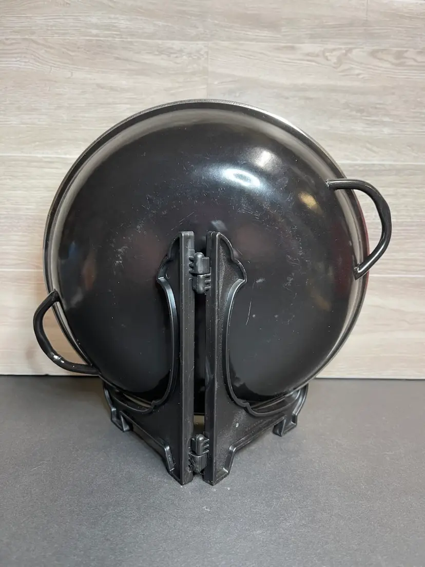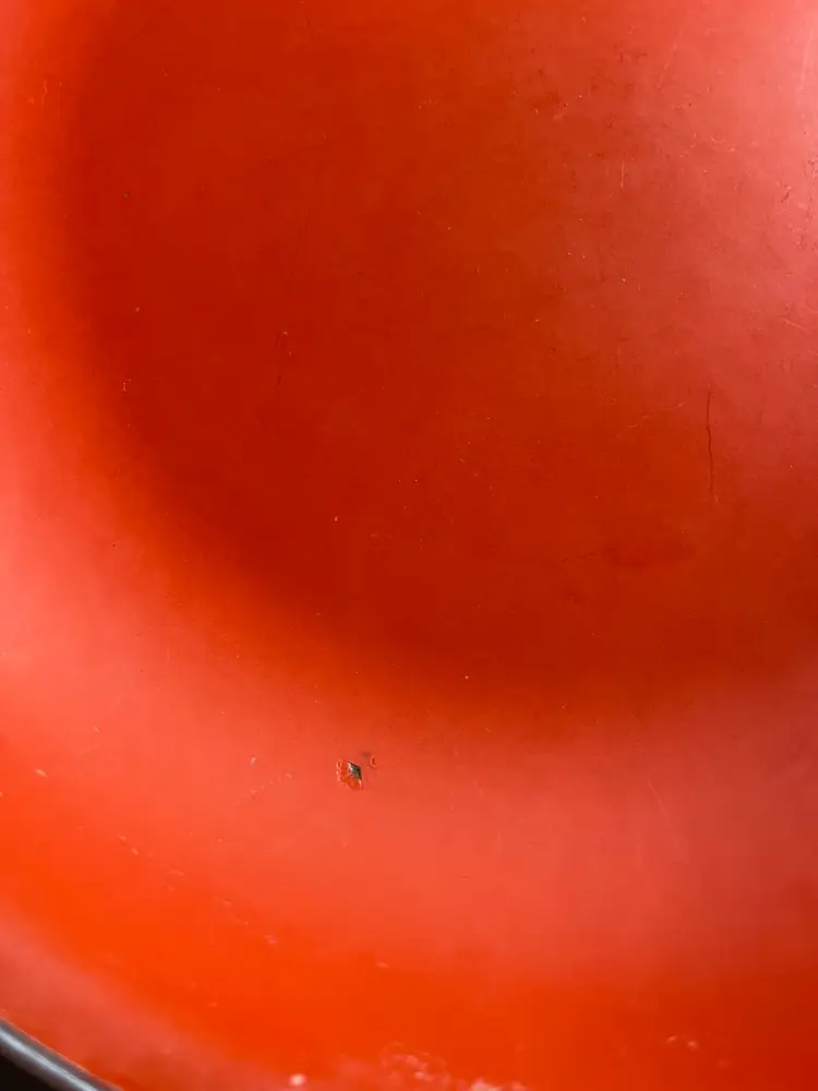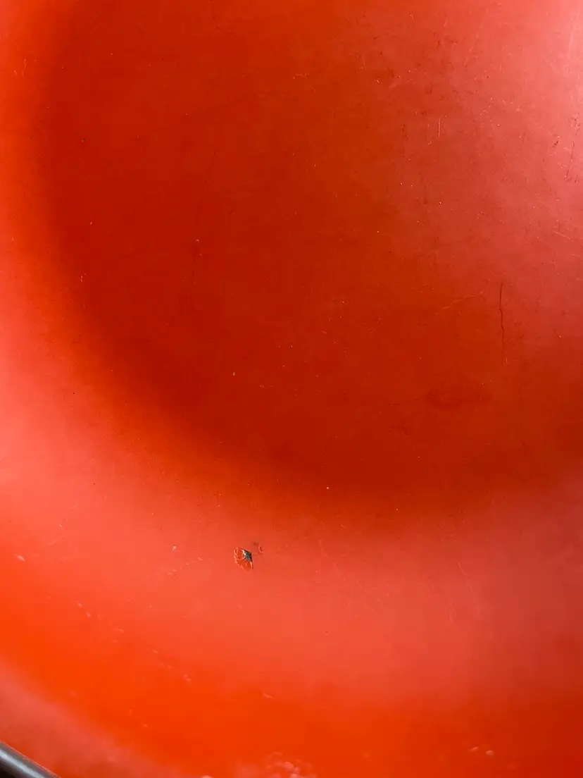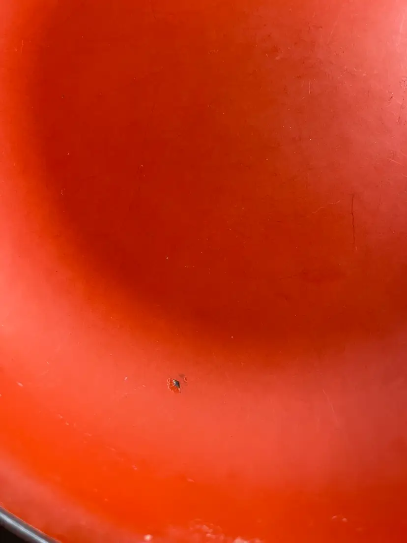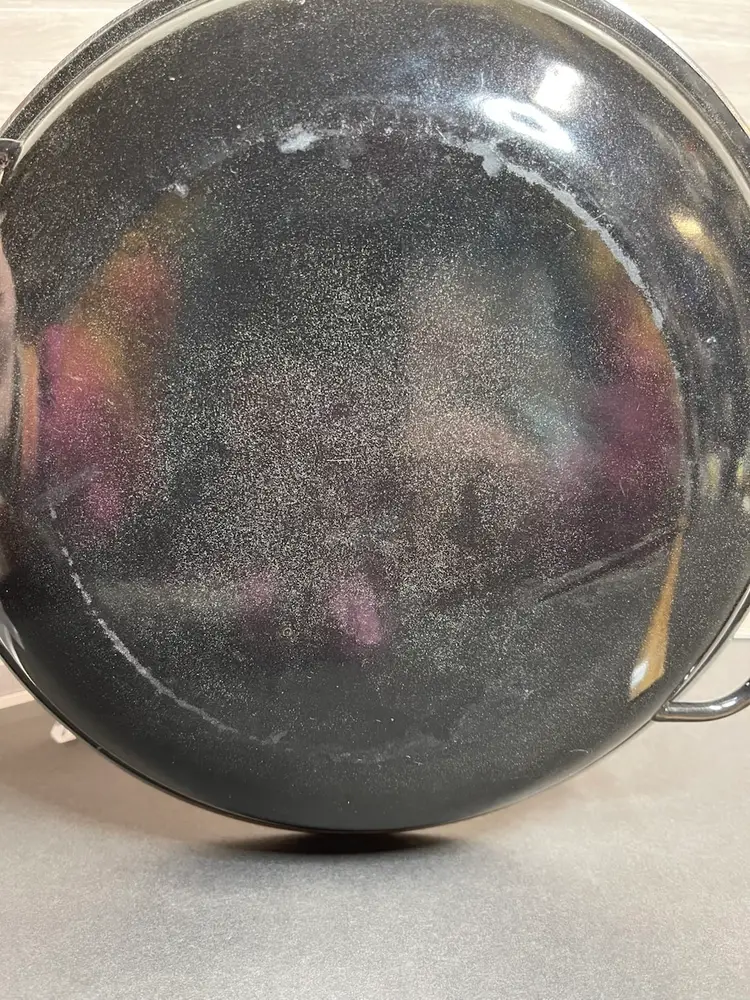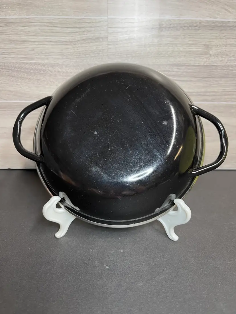 Includes 3 pans 10.5” Red, 8.5” yellow and 6.25” blue, the red one has a tiny ding and the bottom shows some wear and the yellow has substantial scratches but no chips.