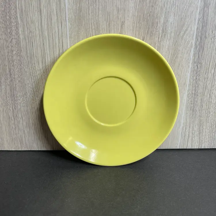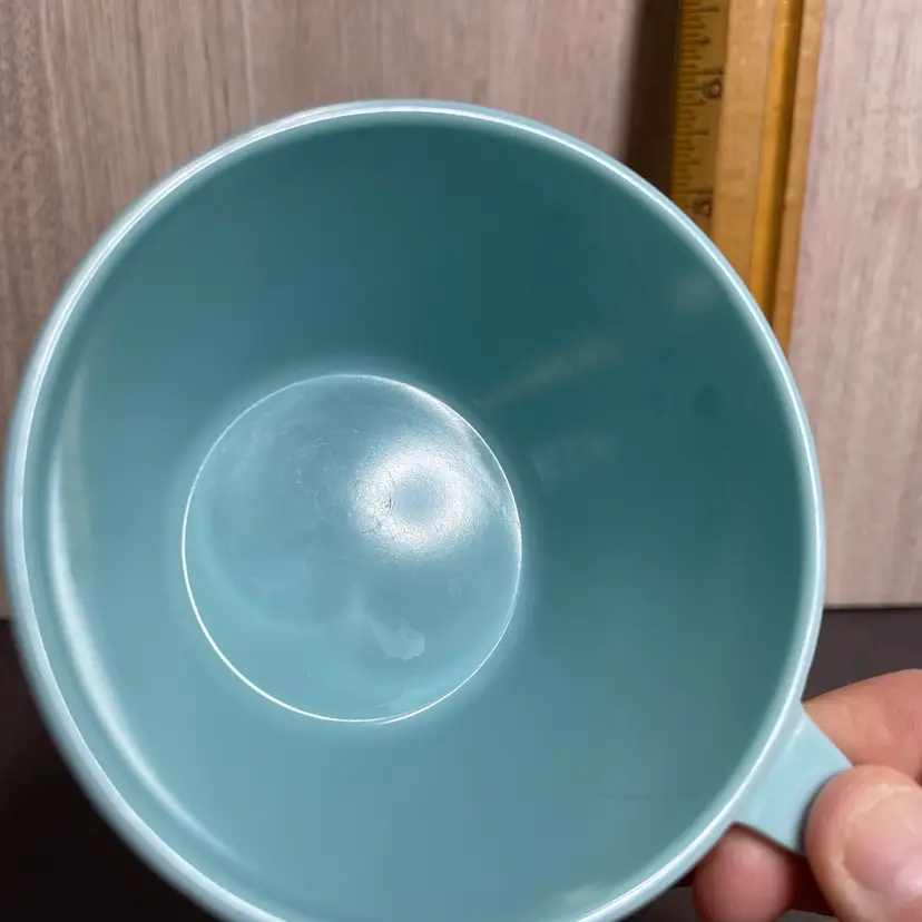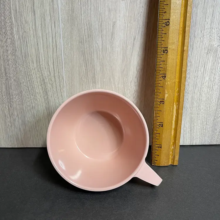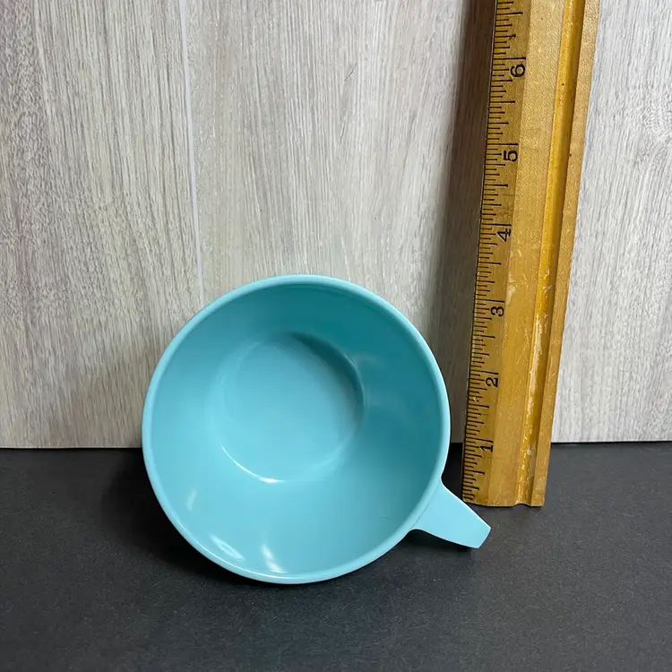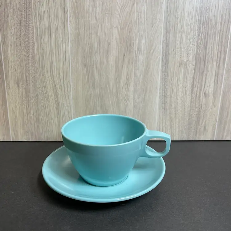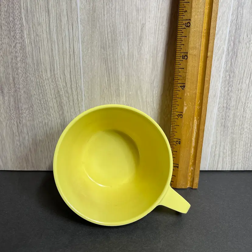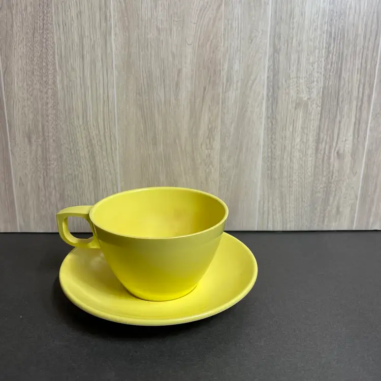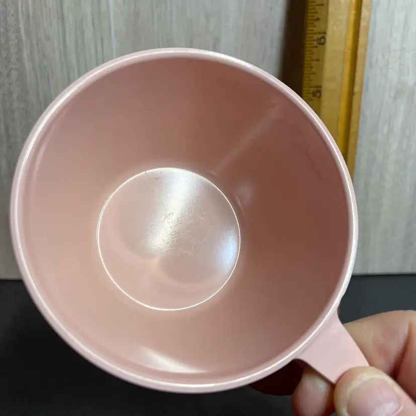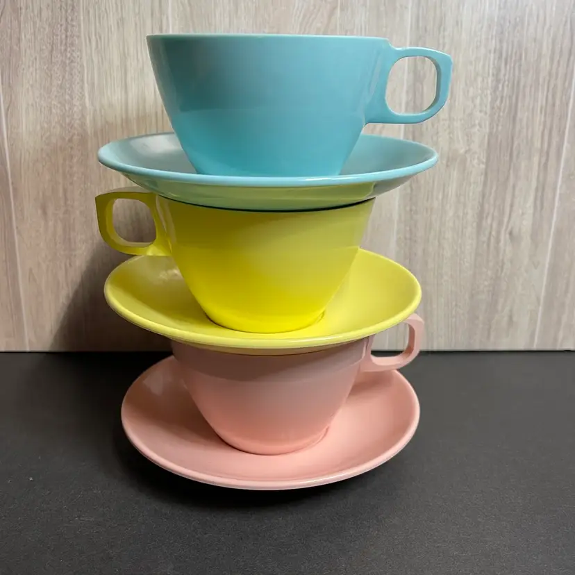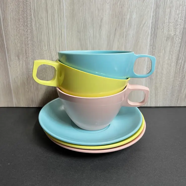 Includes 3 cups and 3 saucers; pink, blue and yellow. The yellow has minor discoloration inside the cup otherwise the rest are in very good condition.