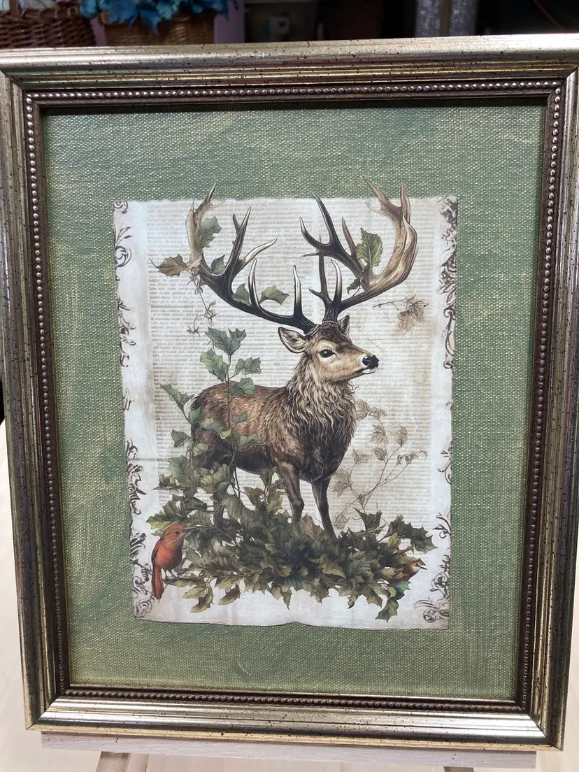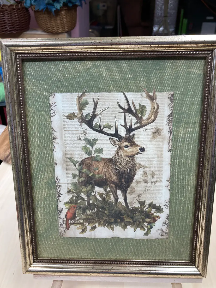 Woodland Deer-Stag- Reindeer IOD Transfer on Canvas Board Hand Made New Without Tags One-of-a-Kind 8 x 10 Gold Beaded Wood Frame Sealed with Poly Vine Matte Finish Ready to Hang, Saw Tooth Hanger installed on back Acid-Free Scrapbook paper glued on back to seal and protect from dust, dirt, critters Farmhouse Decor, Vintage Look Man-Cave Worthy!