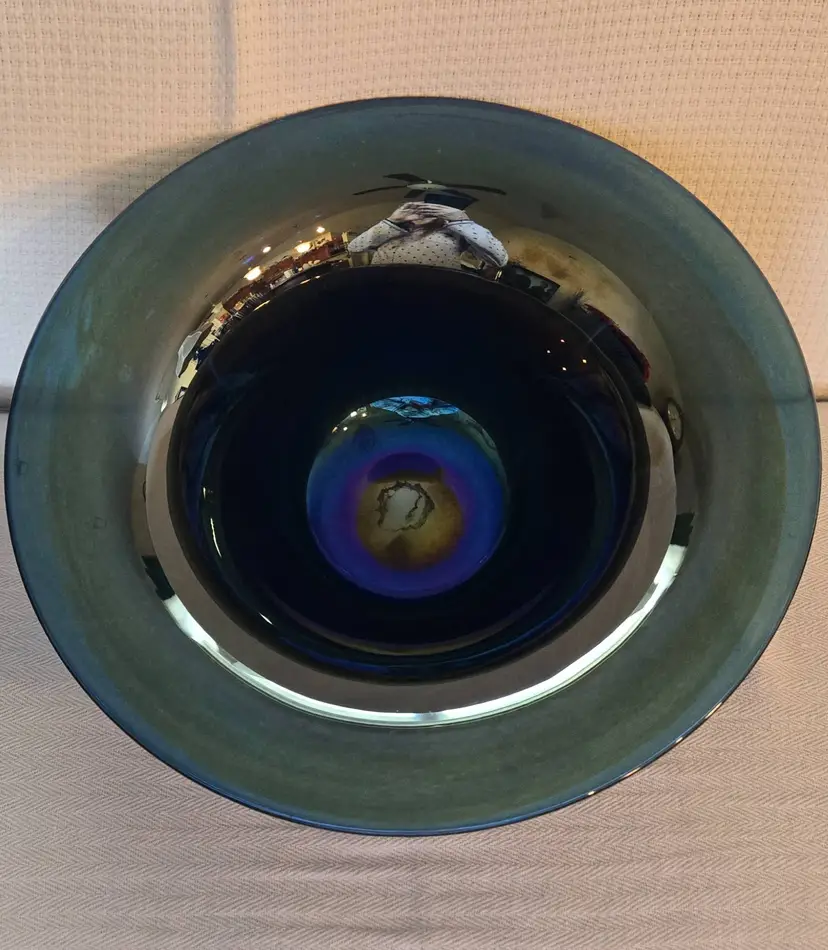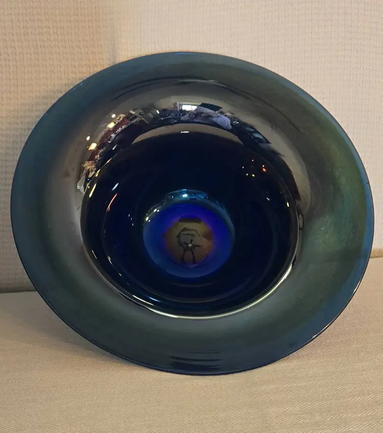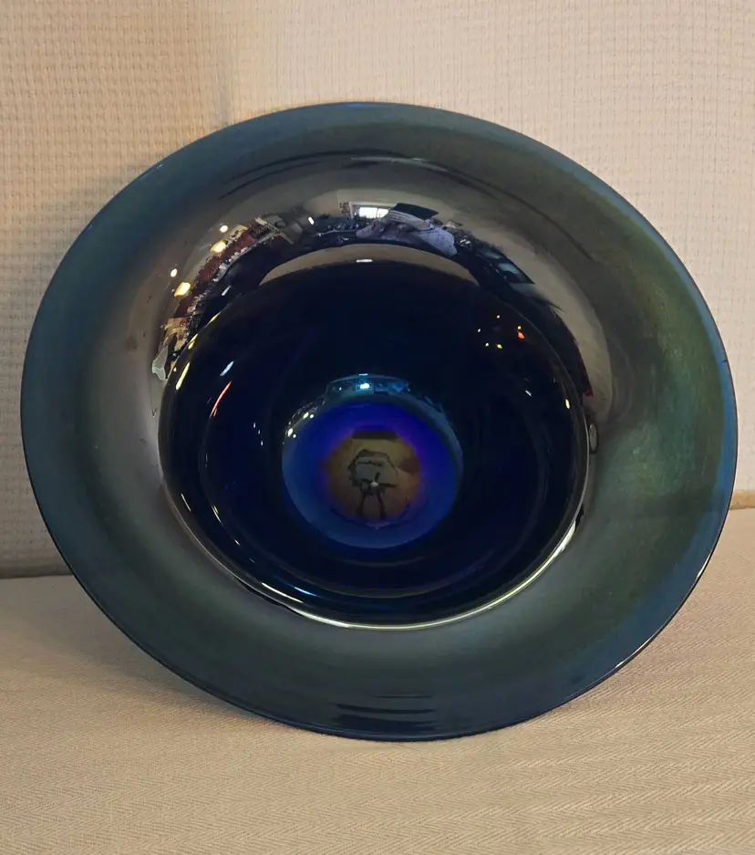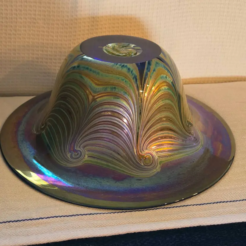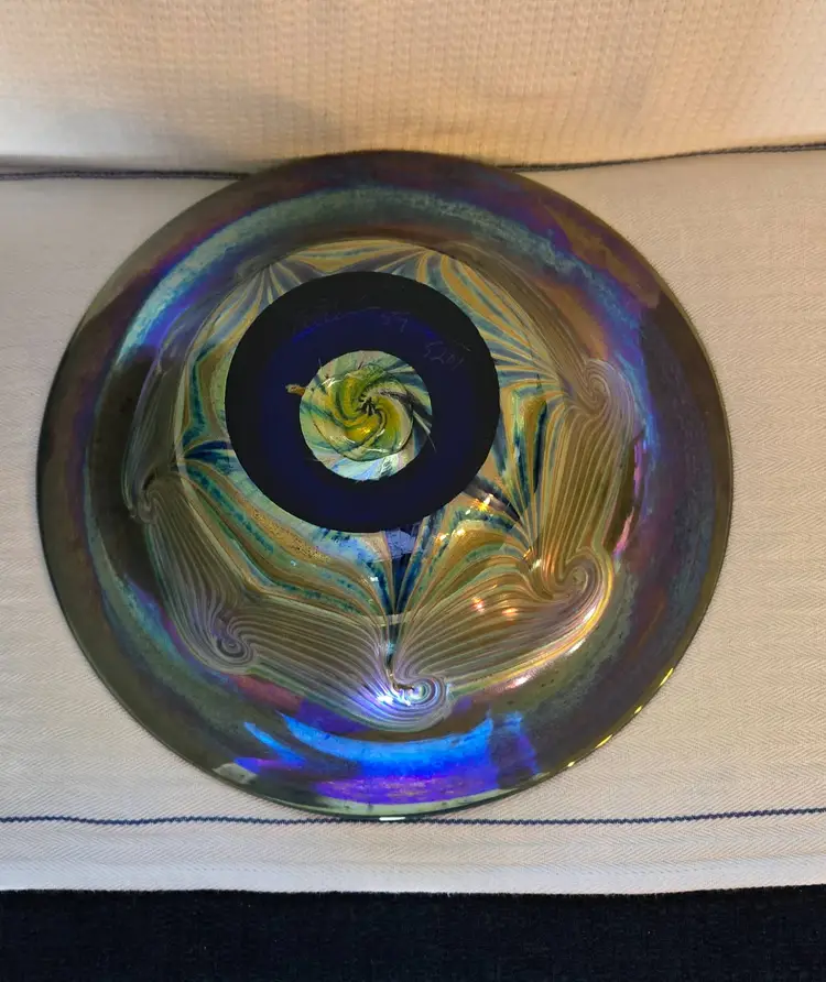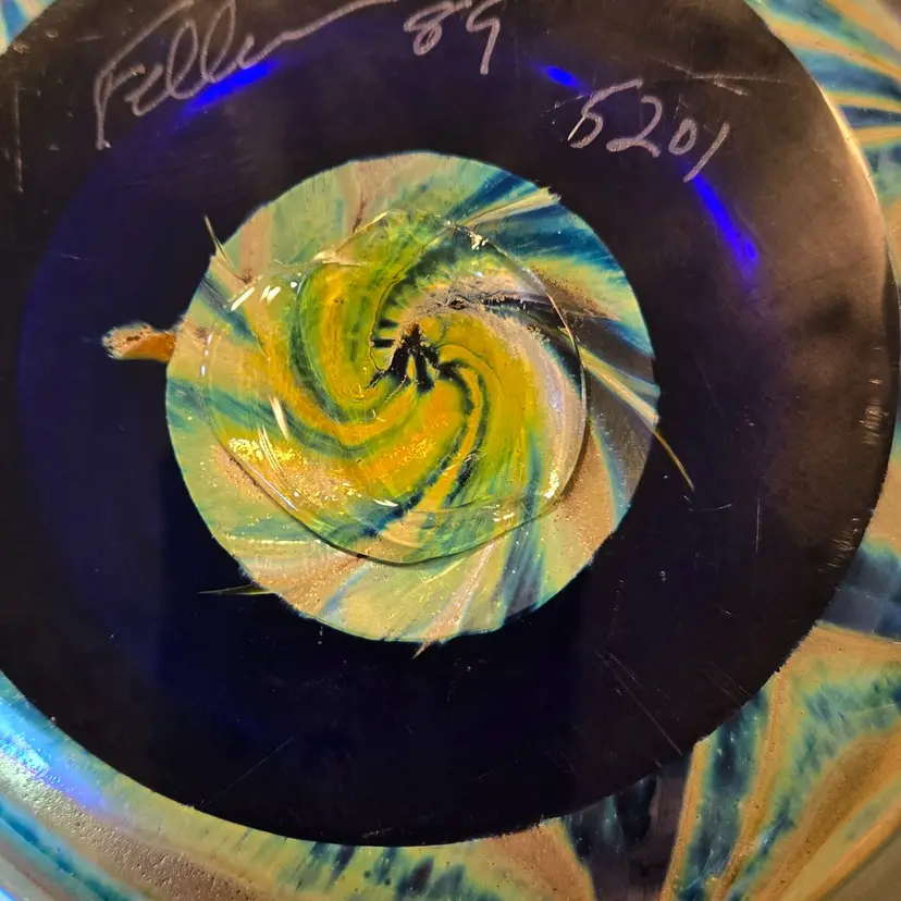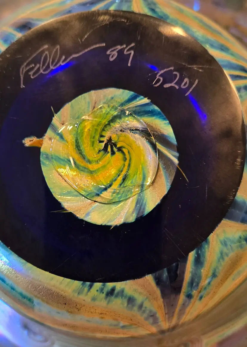 Featuring a pulled feather or swirl design A wide mouthed, thick walled bowl with a cobalt blue inside, and a green, blue, and gold swirl on the outside. Signed by Stephan Fellerman and dated '89. It is also numbered 5201. Measures 4 1/2" tall and 12 1/4" from rim to rim. In excellent condition. No chips, cracks, or repairs.