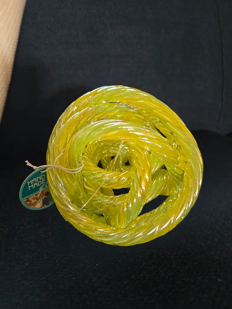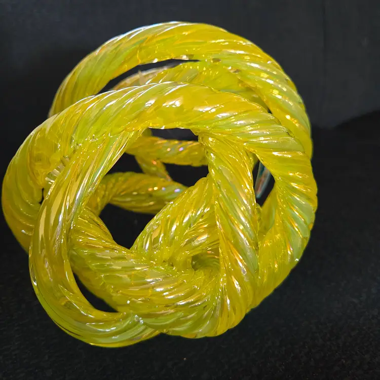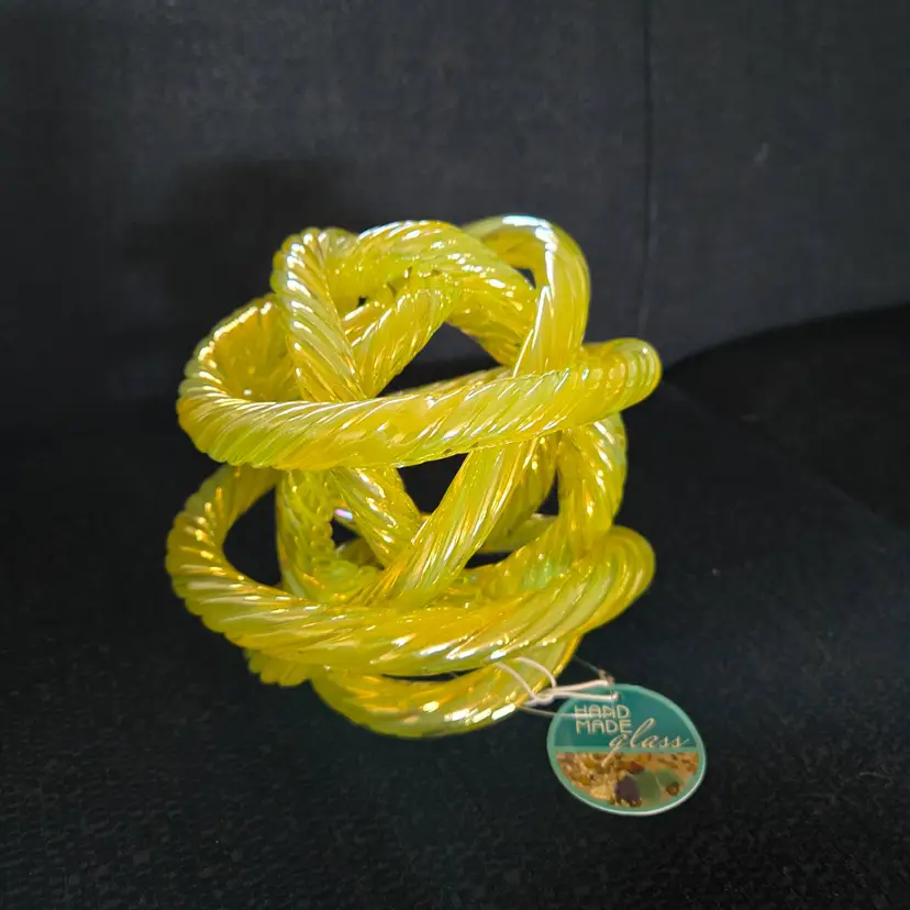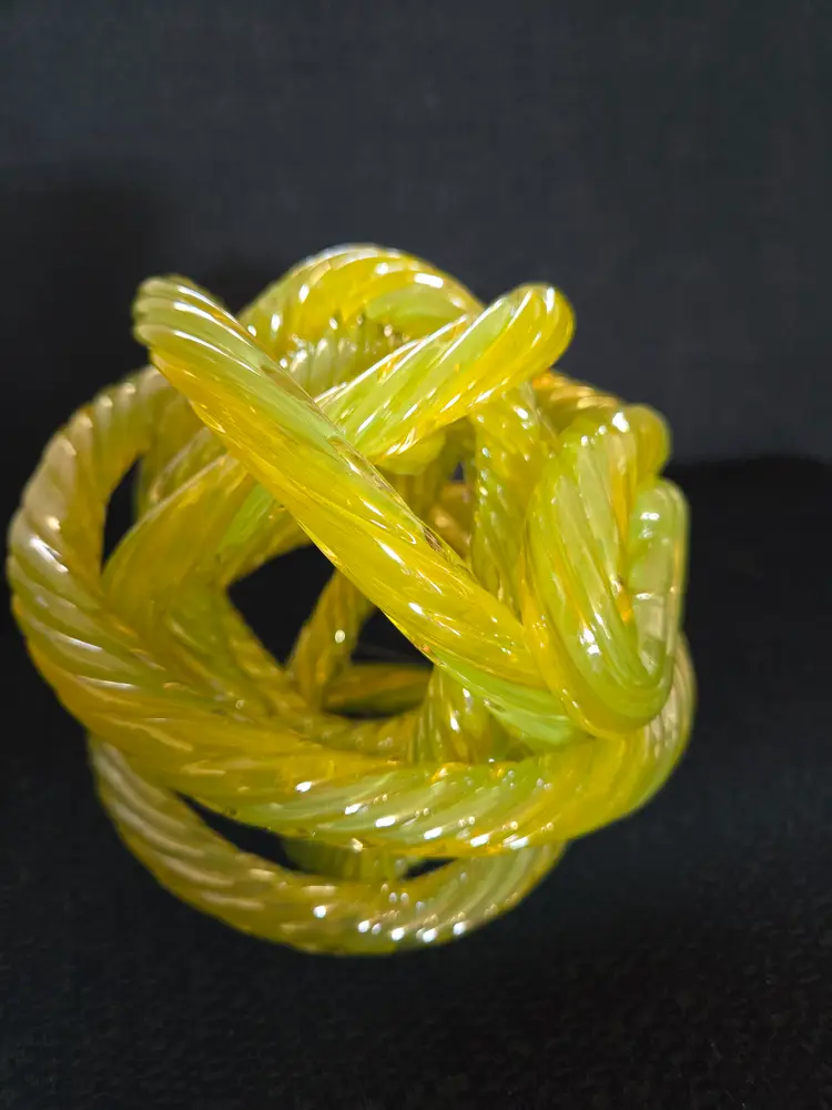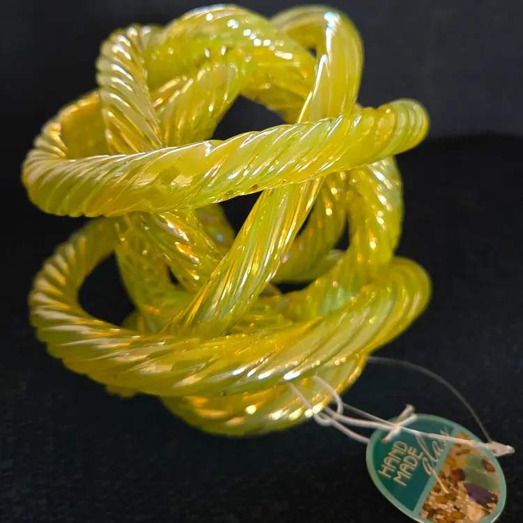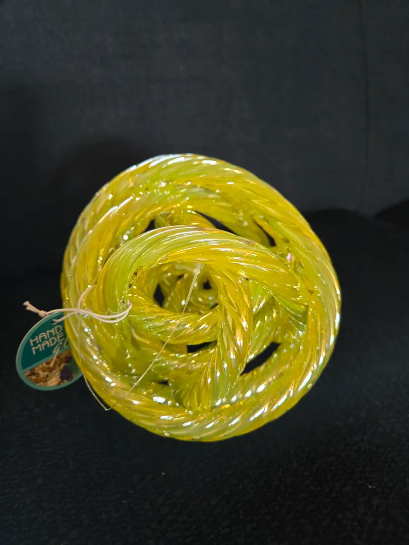 This sculpture is a vibrant, translucent yellow-green or chartreuse. Can be used as a paperweight or table decor. It has a tag on it that says Handmade Glass. Measures approx. 5" wide and 5" tall. A fun piece and very pretty. No chips, cracks, or repairs.