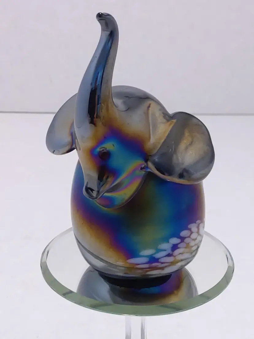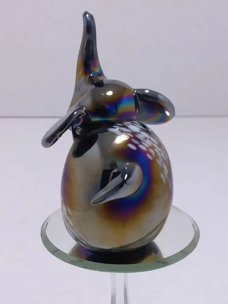 Beautiful iridescent figurine. Trunk up means good luck ! Approximately 3" tall.