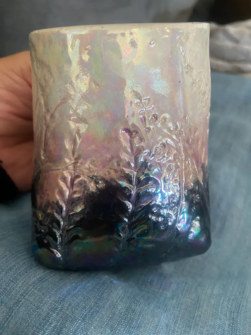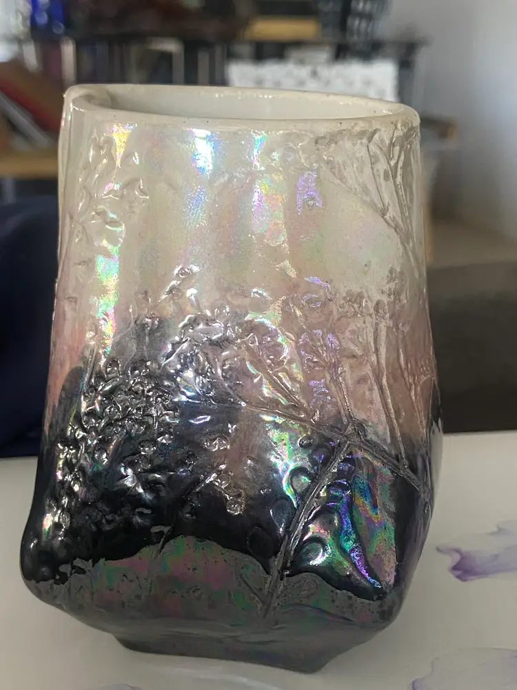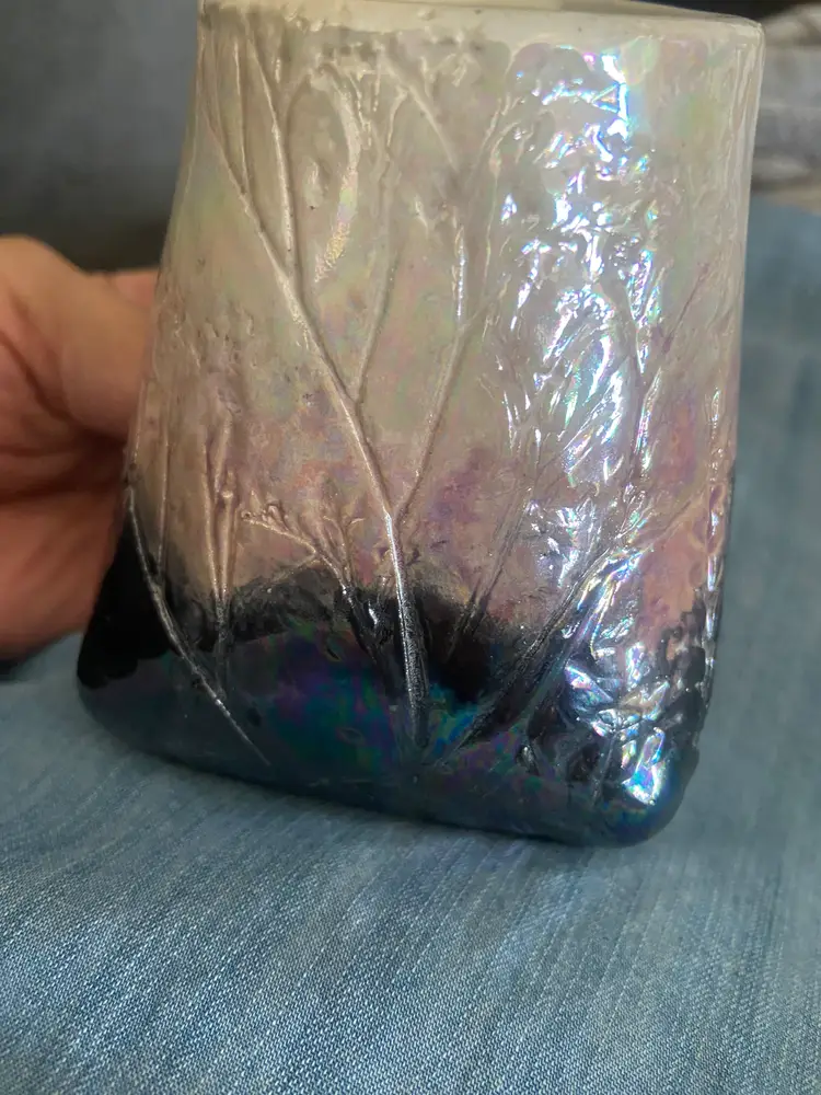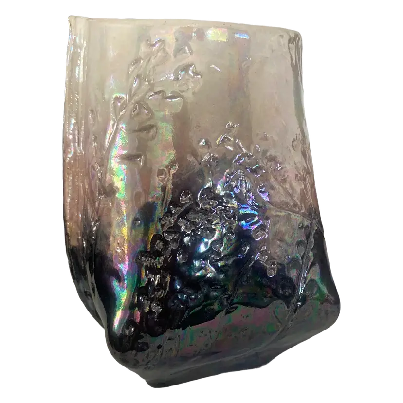 This iridescent ceramic vase stands at 4.5" tall and is adorned with a stamped fern leaf logo. Handmade with a unique multicolor finish, this small vase is not only decorative but signed by the artist as well. The vase is lightweight at 11 oz, making it easy to carry and display in any room of the house. Its intricate design and high-quality material make it a standout piece for any collection of decorative items.