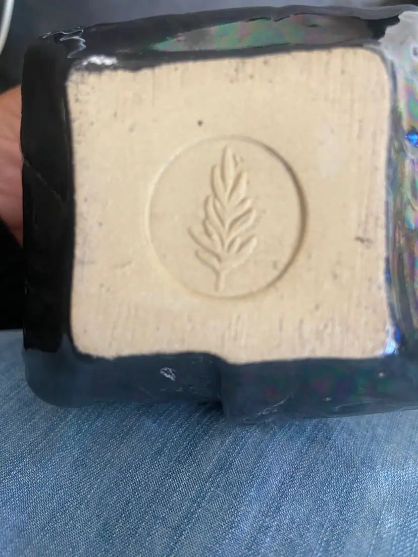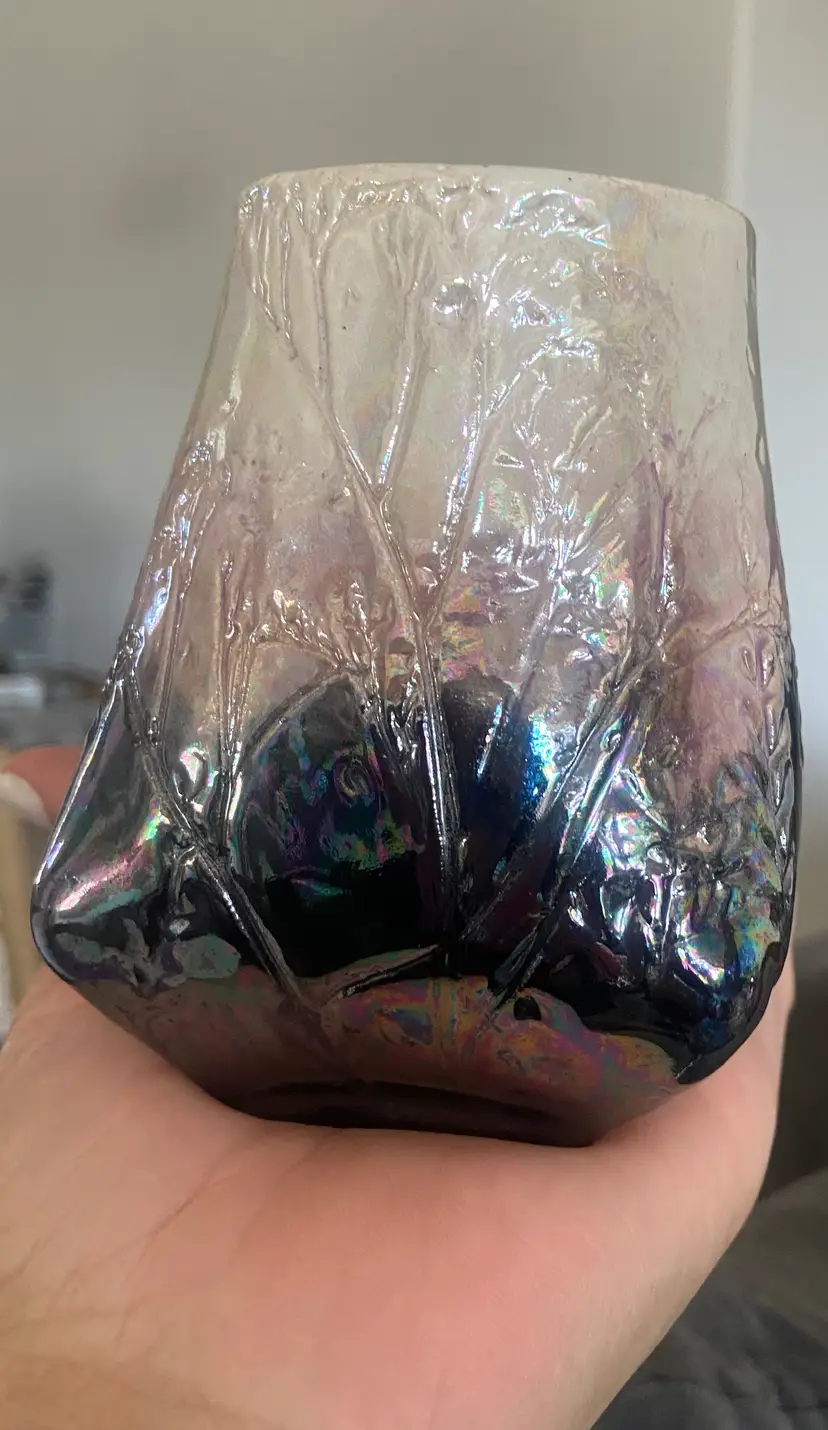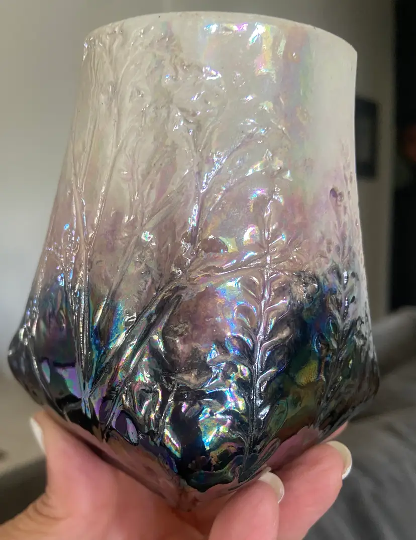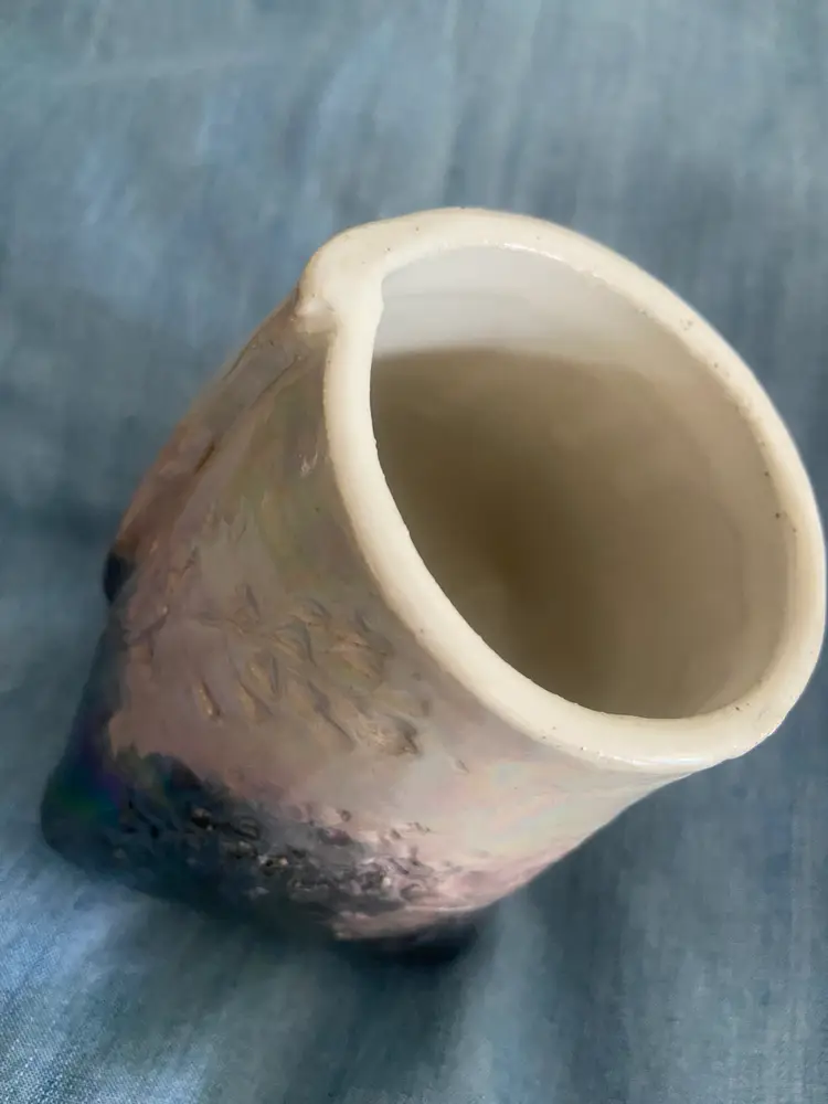 This iridescent ceramic vase stands at 4.5" tall and is adorned with a stamped fern leaf logo. Handmade with a unique multicolor finish, this small vase is not only decorative but signed by the artist as well. The vase is lightweight at 11 oz, making it easy to carry and display in any room of the house. Its intricate design and high-quality material make it a standout piece for any collection of decorative items.