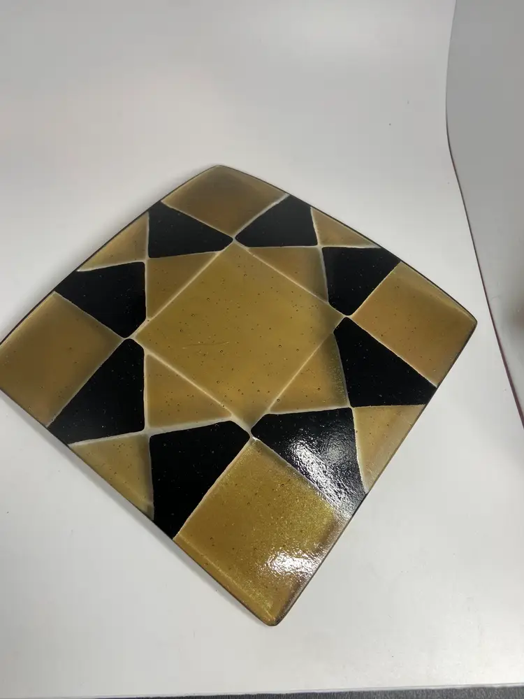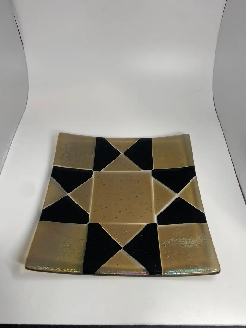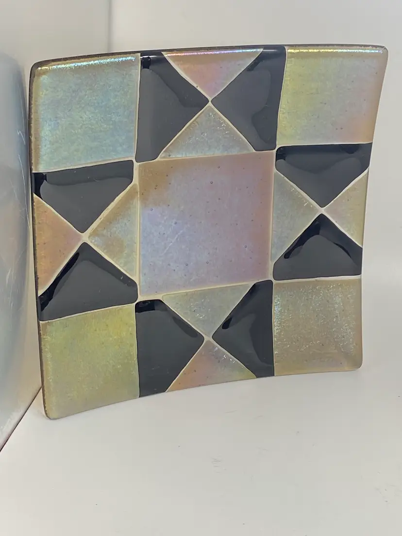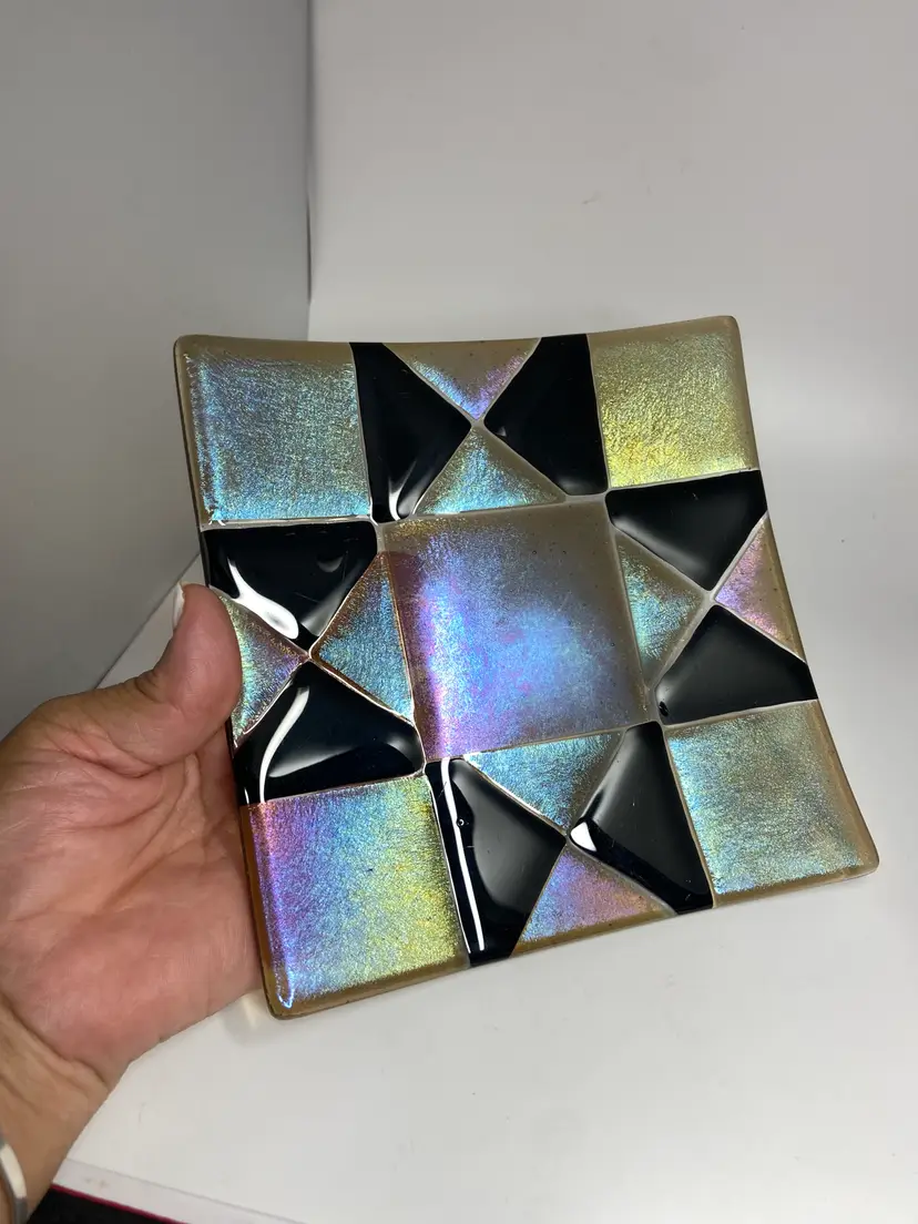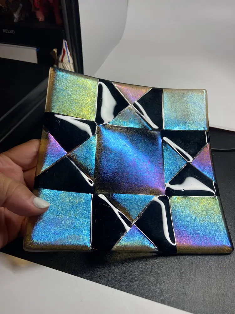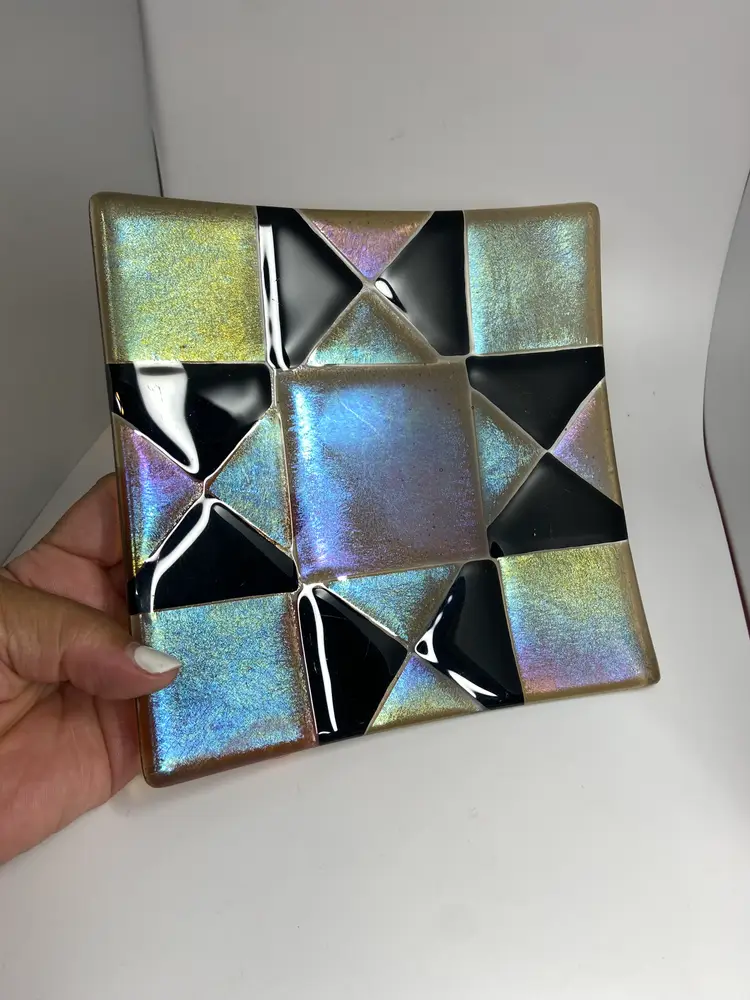 Irridescent Fused Art Glass Decorative Dish with Geometric Design