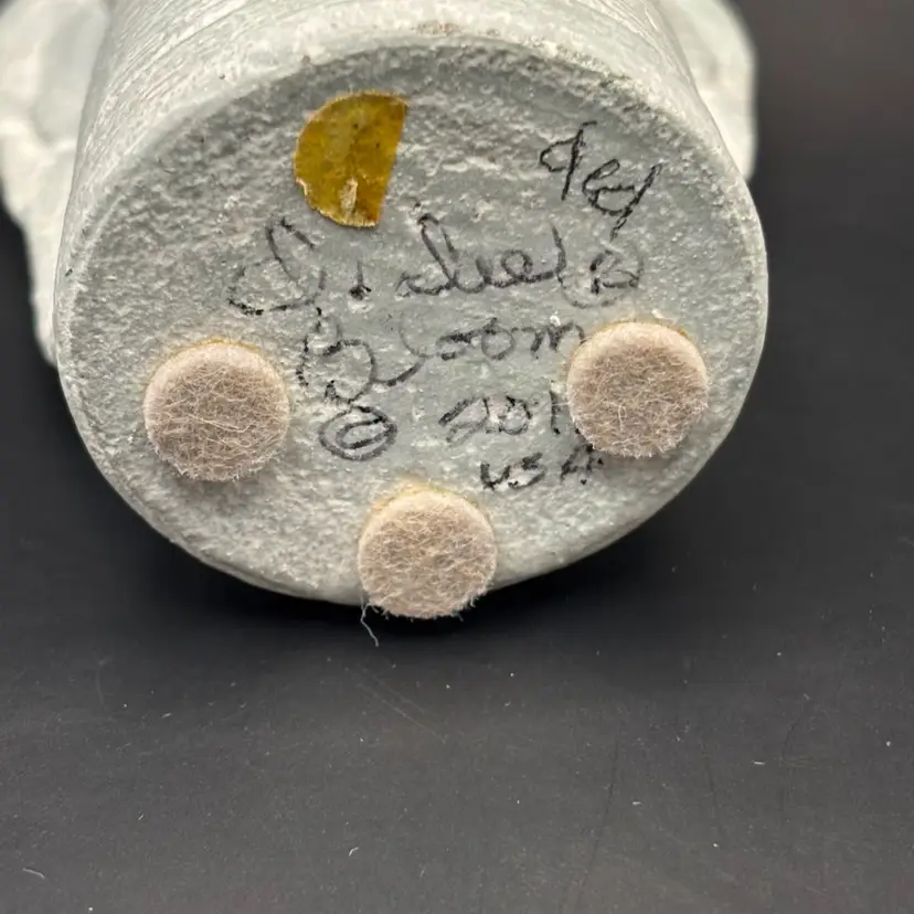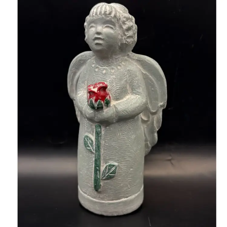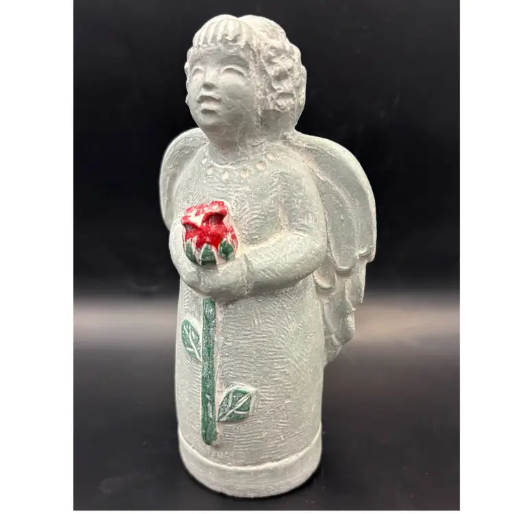Isabel Bloom cement sculpture of an angel holding a red rose. A unique Bloom sculpture. Beautiful addition to your collection. 5-1/2" tall and 3" wide. Signed and dated 2011. Excellent condition. No chips or cracks.