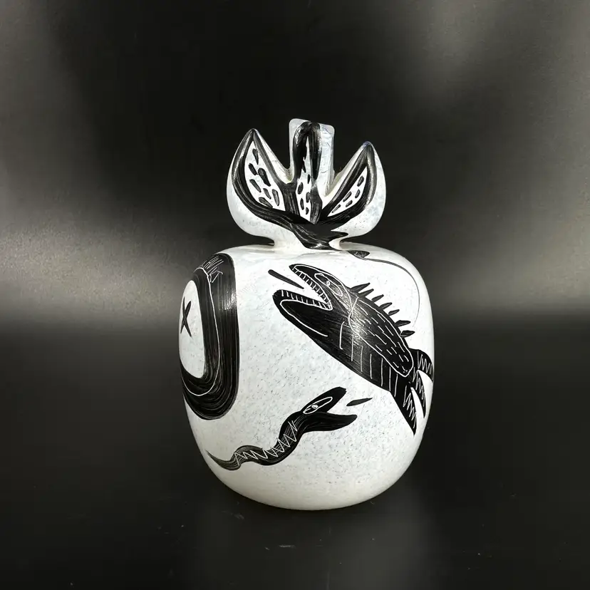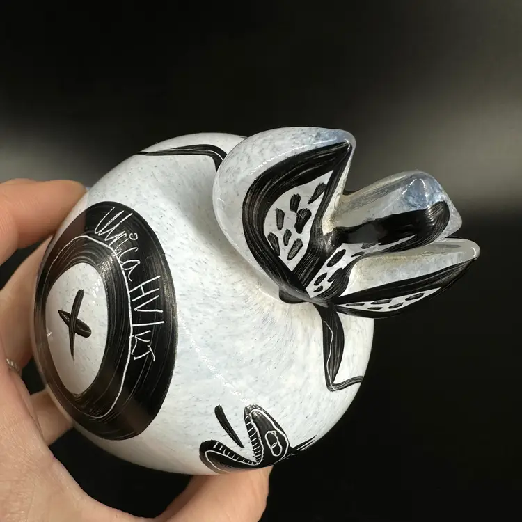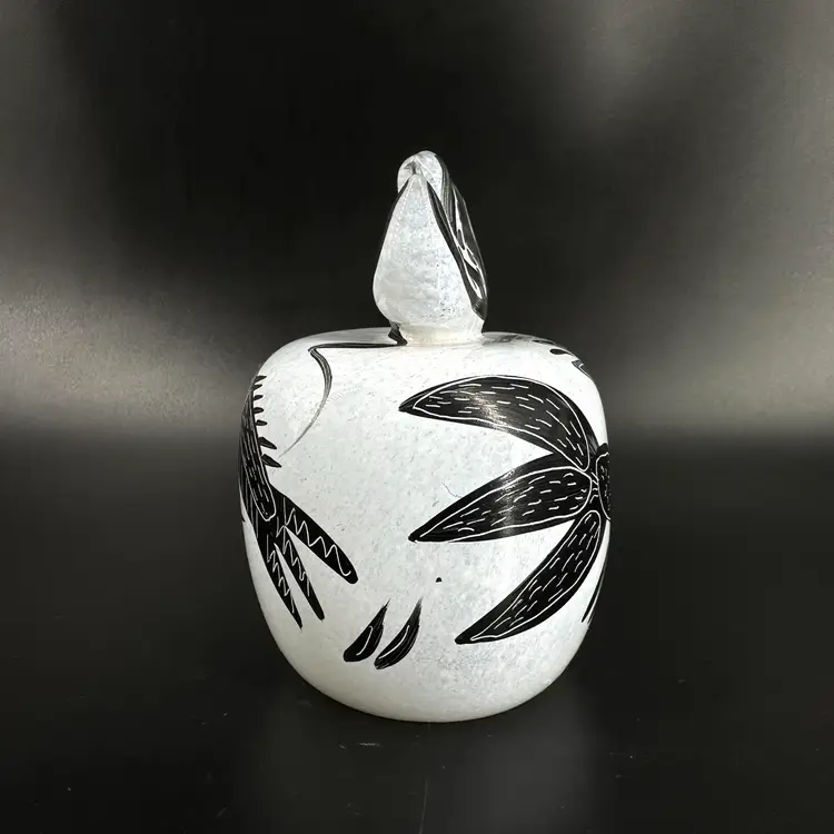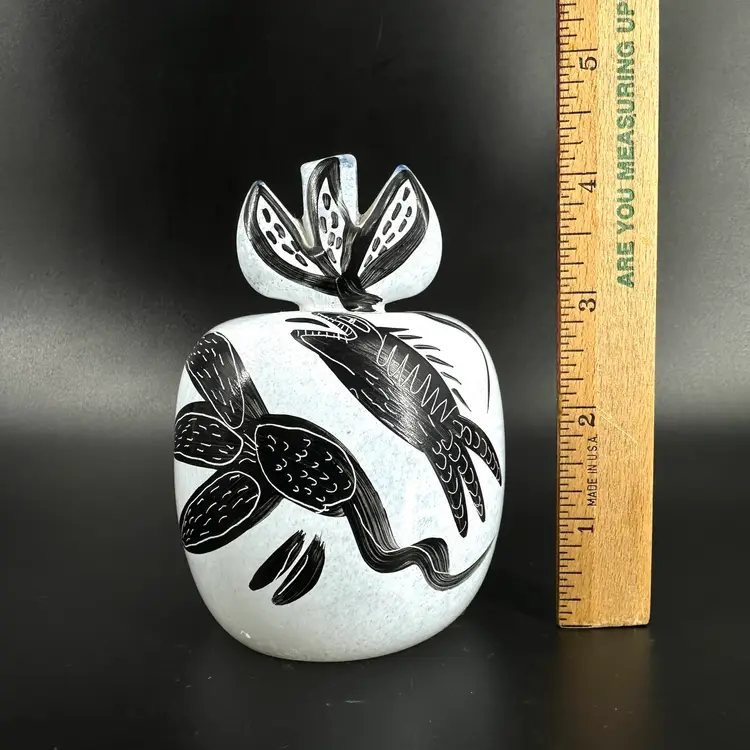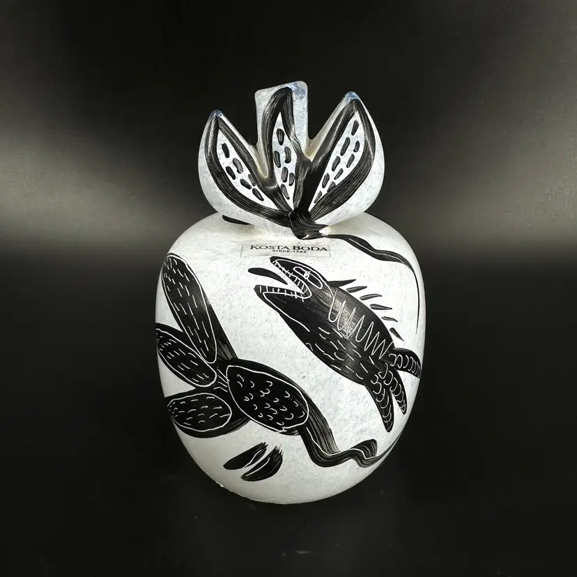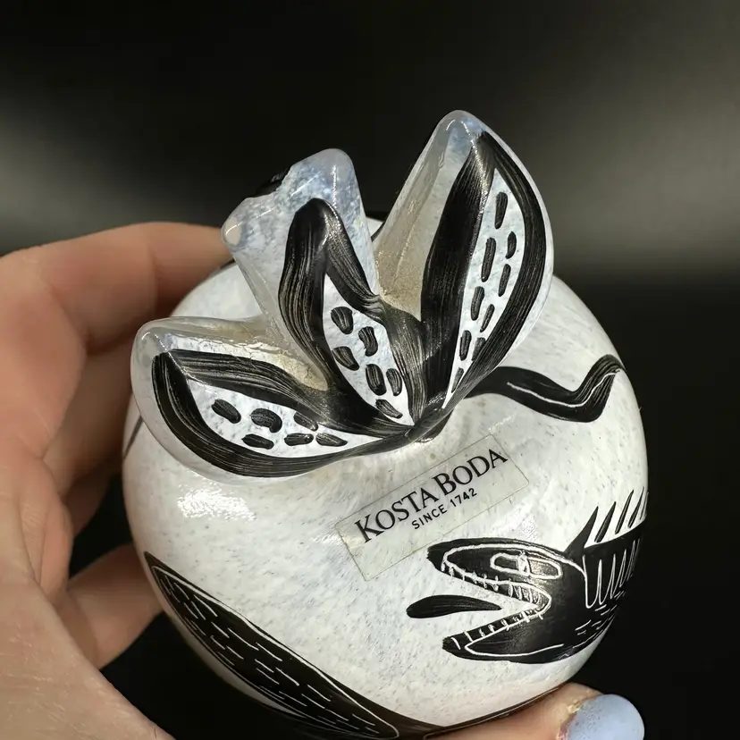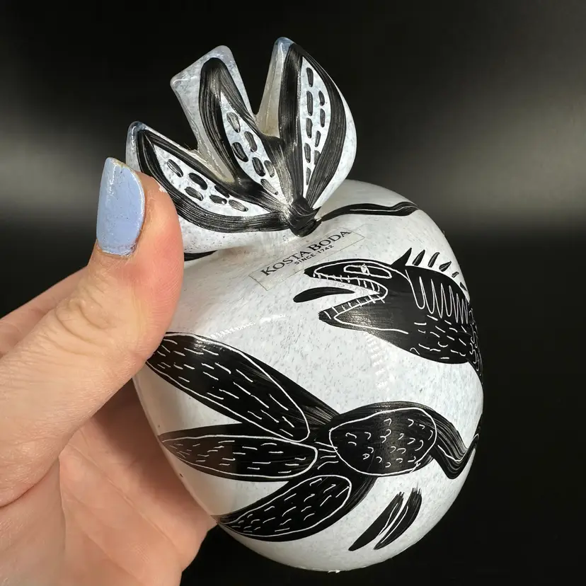 Kosta Boda paperweight featuring handpainted designs by artist Ulrica Hydman from the “Caramba” series. No chips or cracks. “KOSTA BODA” sticker intact. Measures approximately 4.25” tall by 2.75” wide.