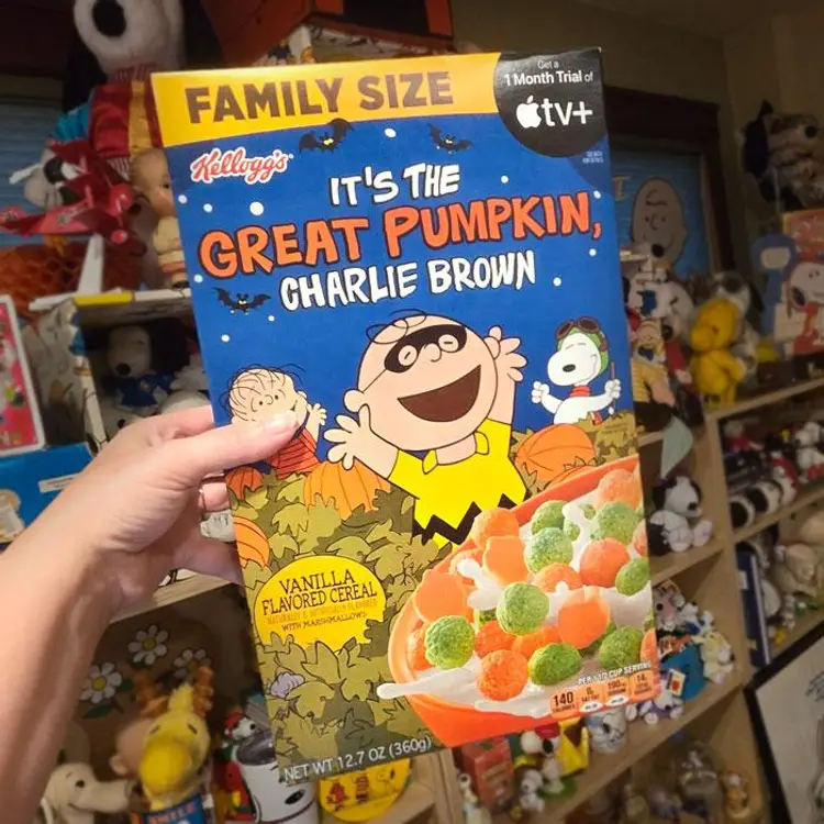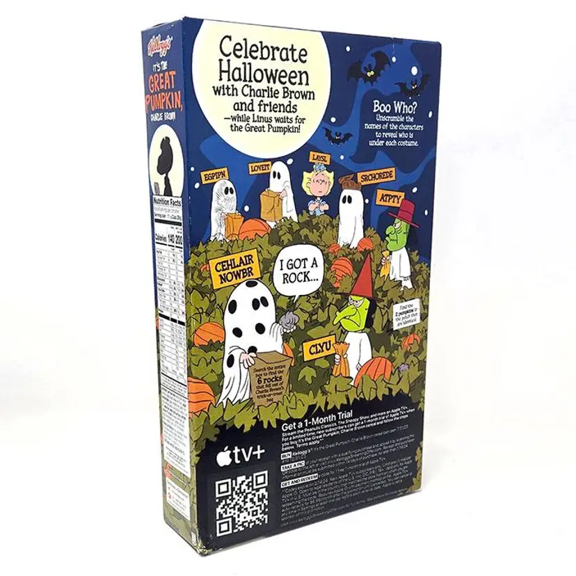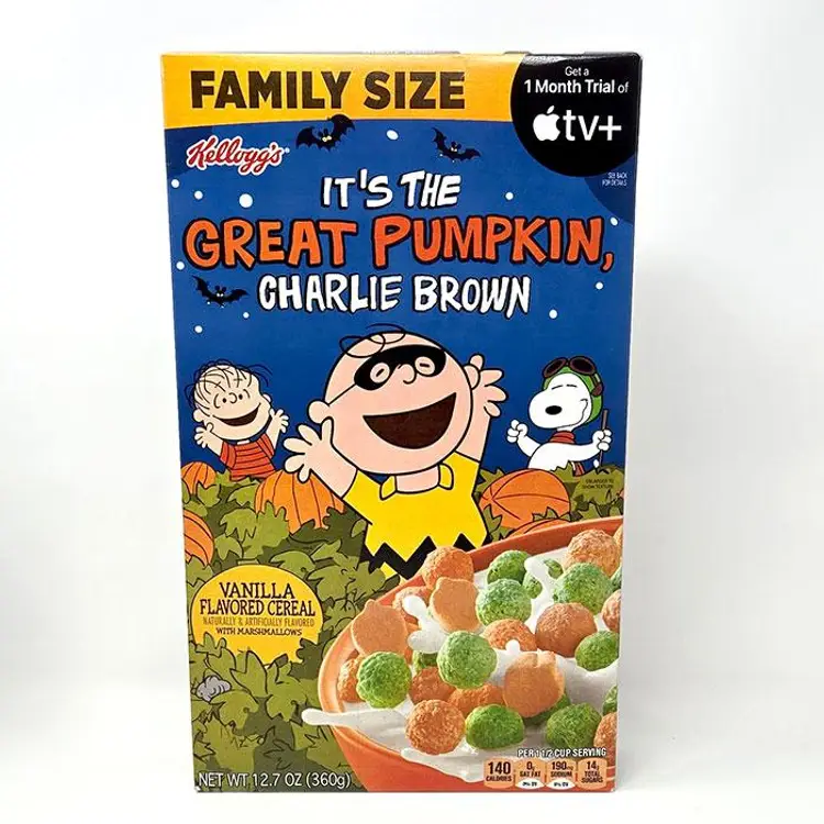 Celebrate Halloween with this family-sized box of 'It's the Great Pumpkin, Charlie Brown' cereal. Made in 2023, this box is still sealed with its original contents and is ready for display. Eat at your own risk. A great addition for your Peanuts collection!