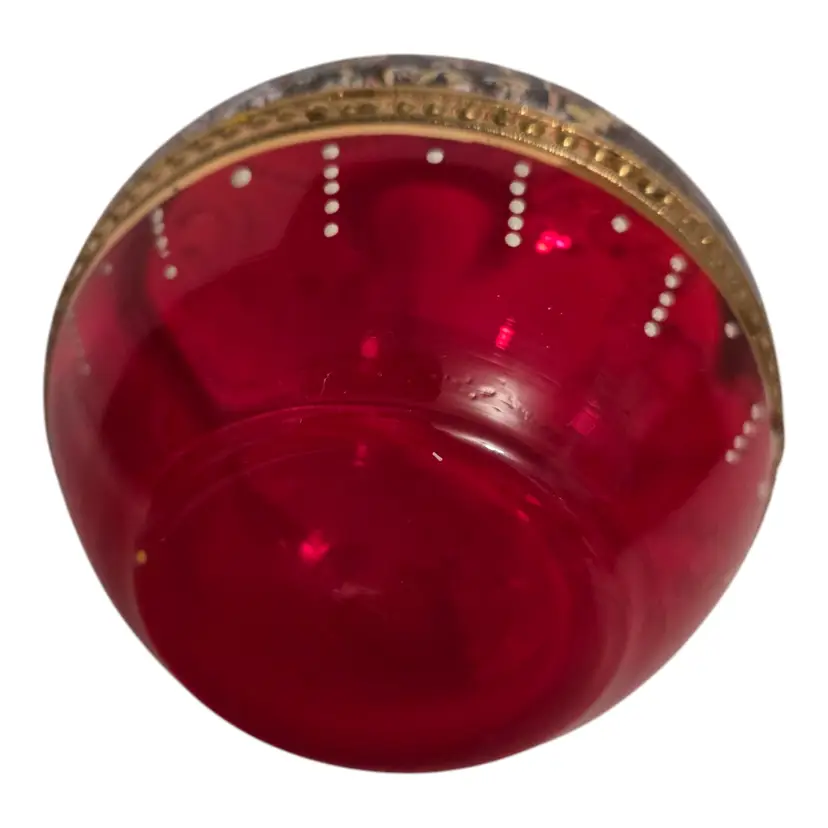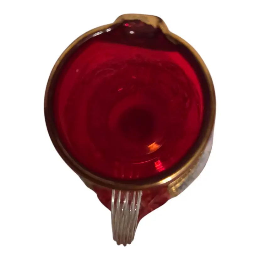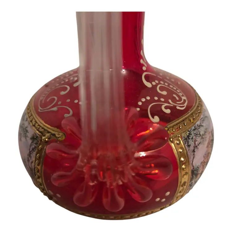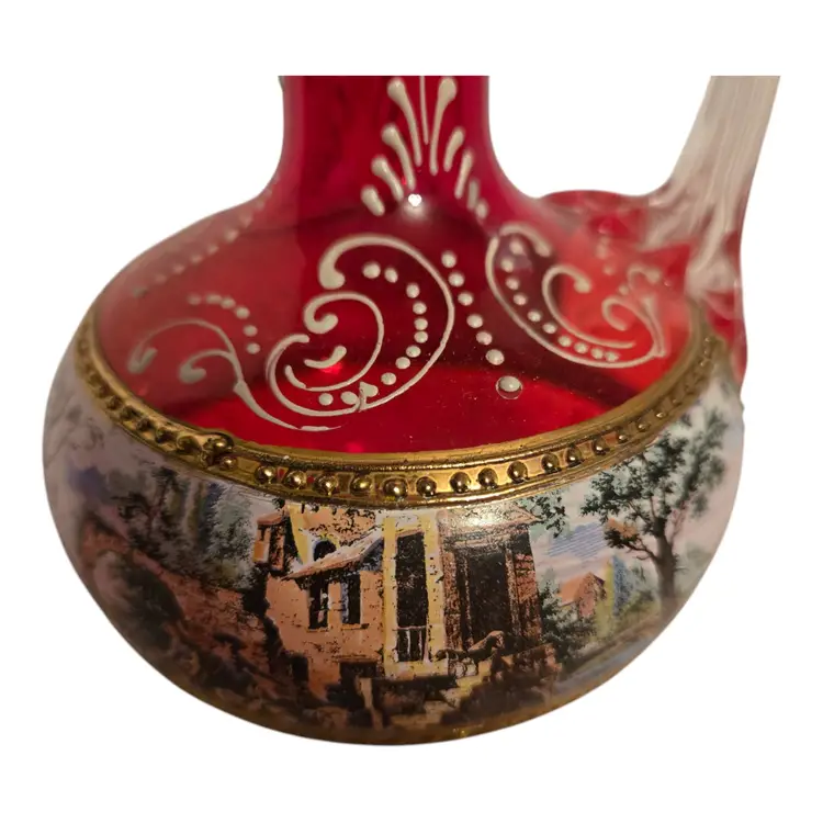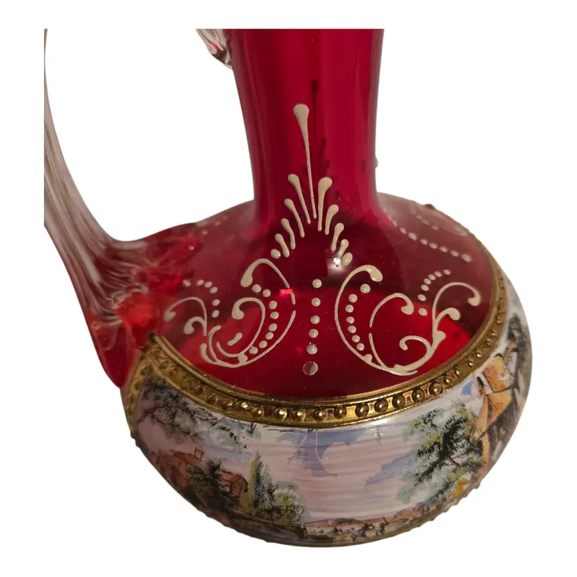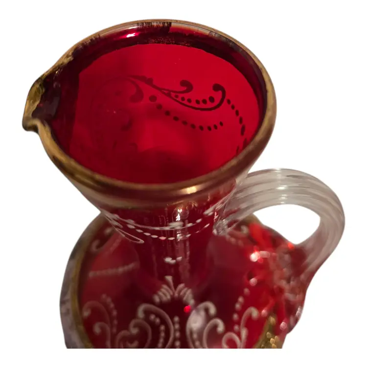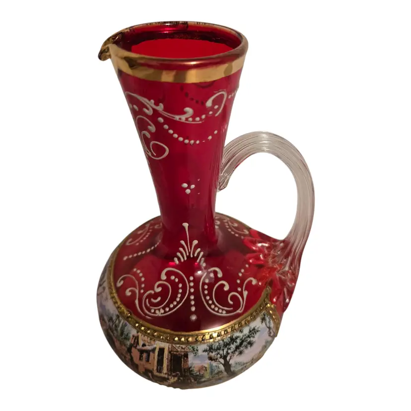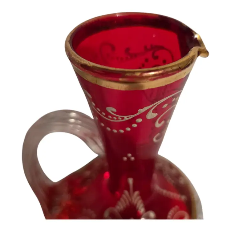 This beautiful Italian art glass cruet vase is a vintage original piece, standing at 6.5 inches tall. It features a lovely cranberry pink color with hand-painted designs, making it a perfect addition to any collection. Some wear such as missing gold around the opening, but otherwise in beautiful condition. No chips or cracks. This cruet vase is a great choice for those who love to add unique and artistic pieces to their home decor.