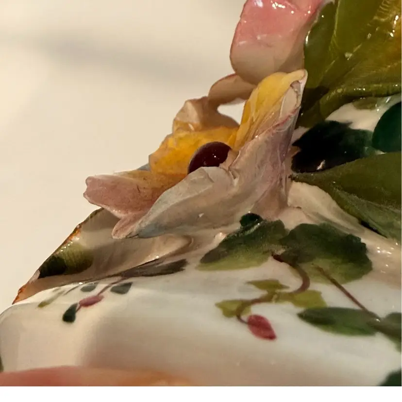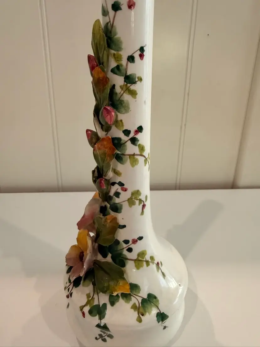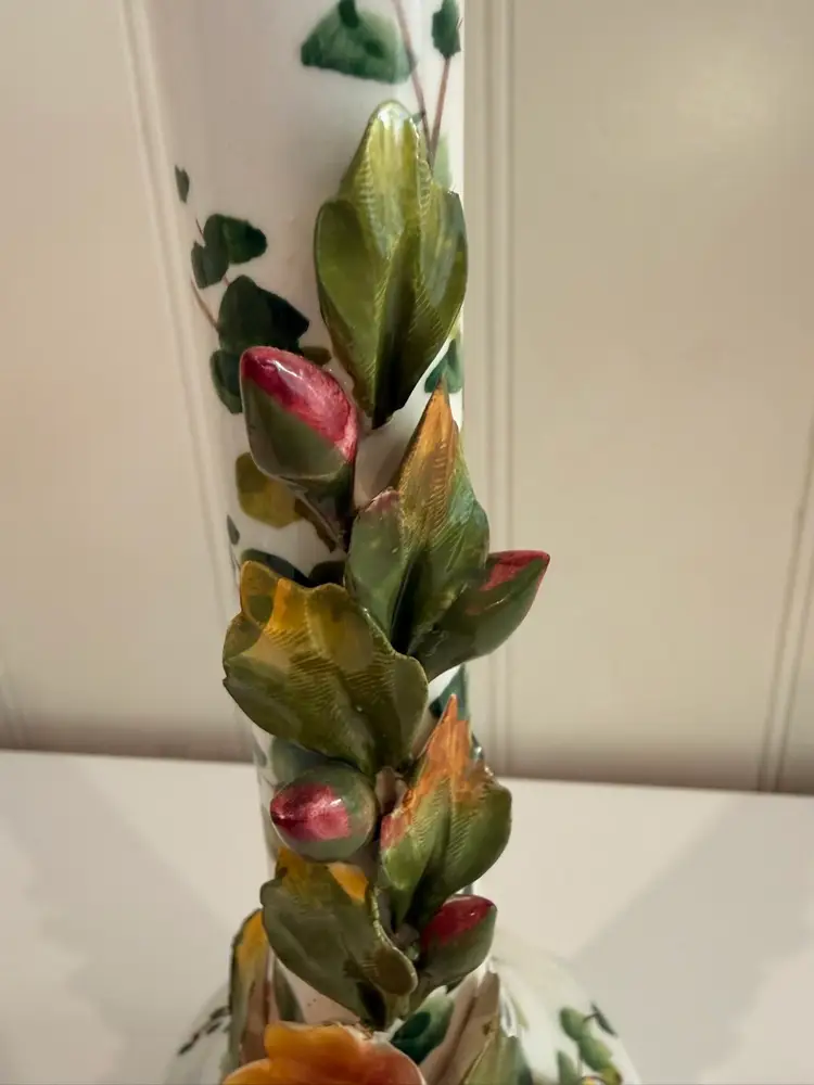 Beautiful Italian Barbotine Majolica hand painted floral vase. One chip on the underside of a flower (see last pic). 10” tall, 3.5” wide at the base, .75” at the opening.
