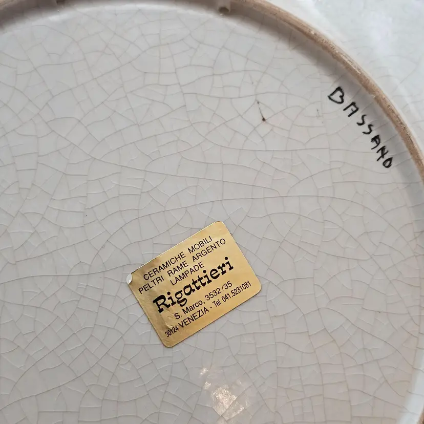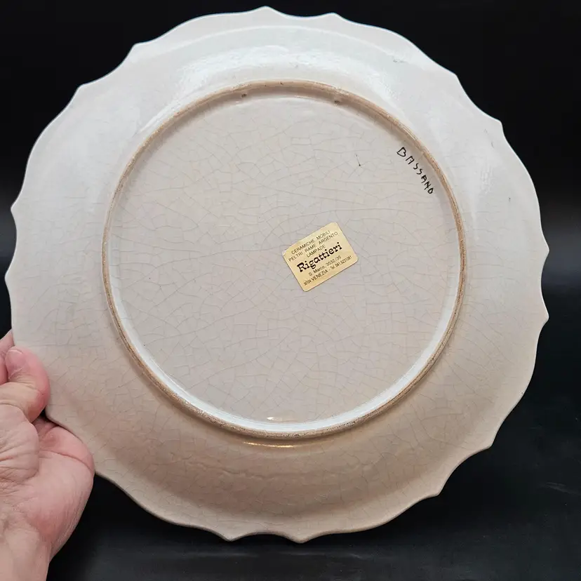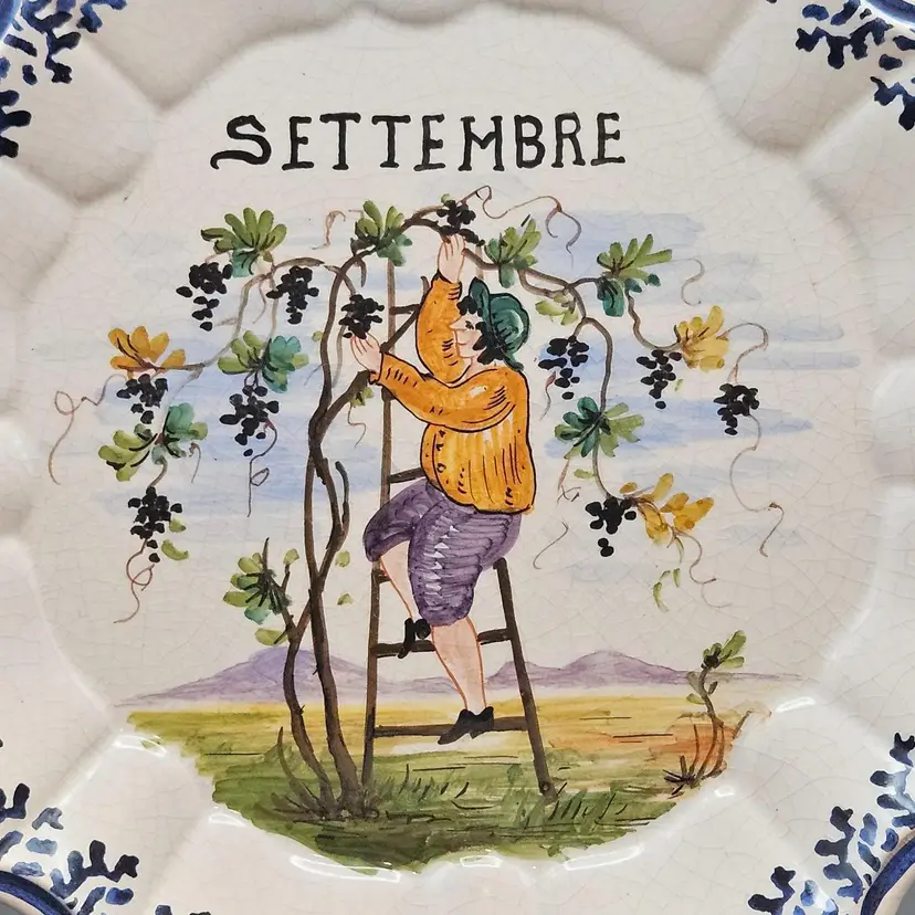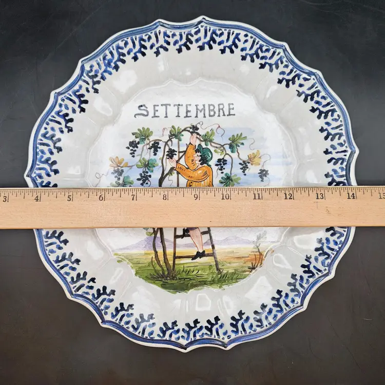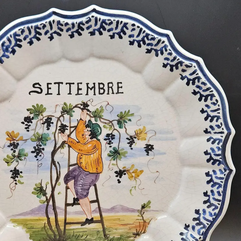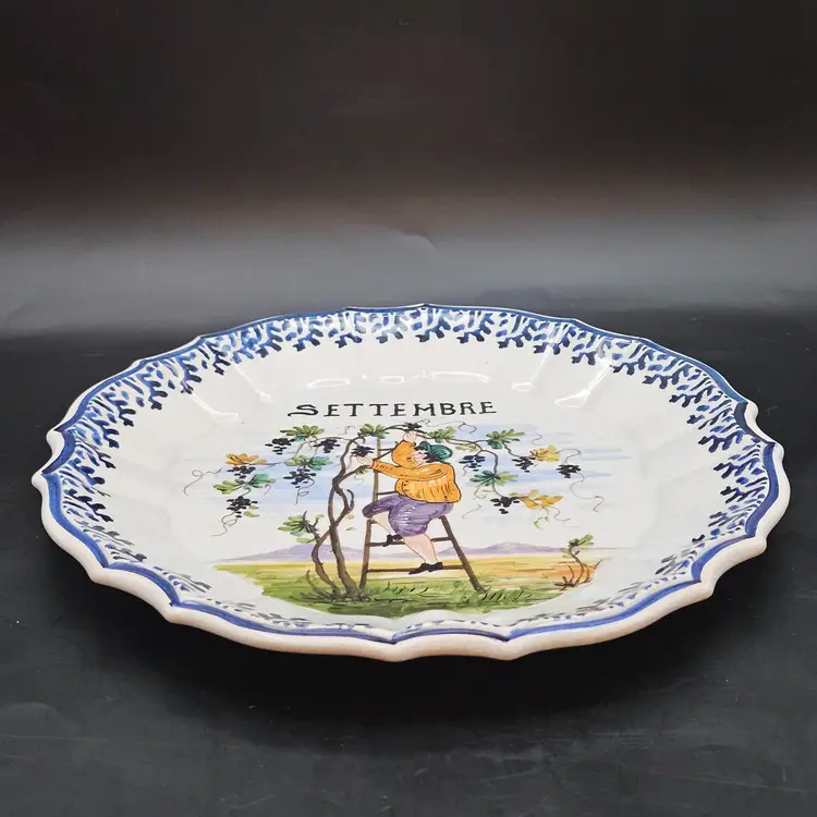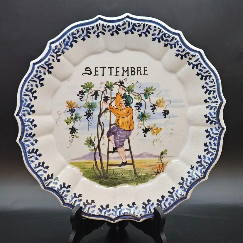 Vintage Italian hand painted art pottery wall plate. Center design depicts man hand picking and harvesting grapes. Plate has the Italian word for the September “Settembre” painted across the top. Features scalloped rim with blue trim. Crazing throughout. Signed by Bassano and sticker from Italian store Rigattieri on the back. Underside also has drilled holes for displaying the plate.