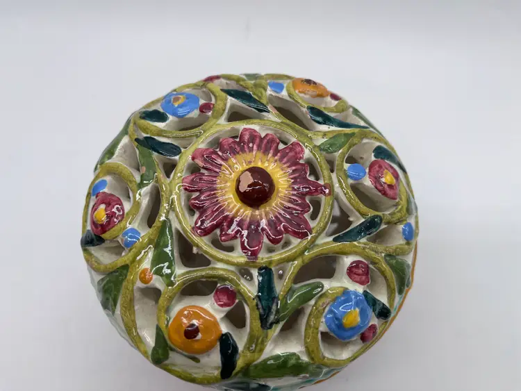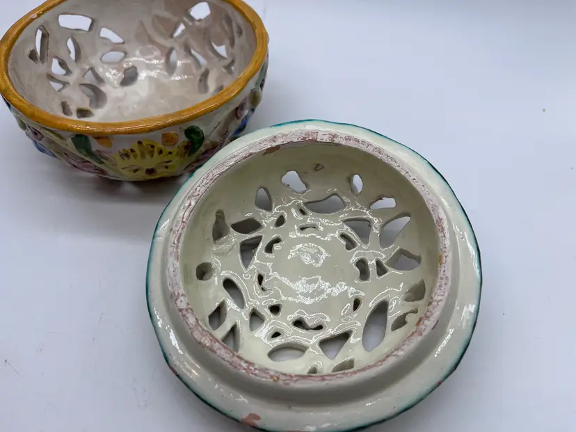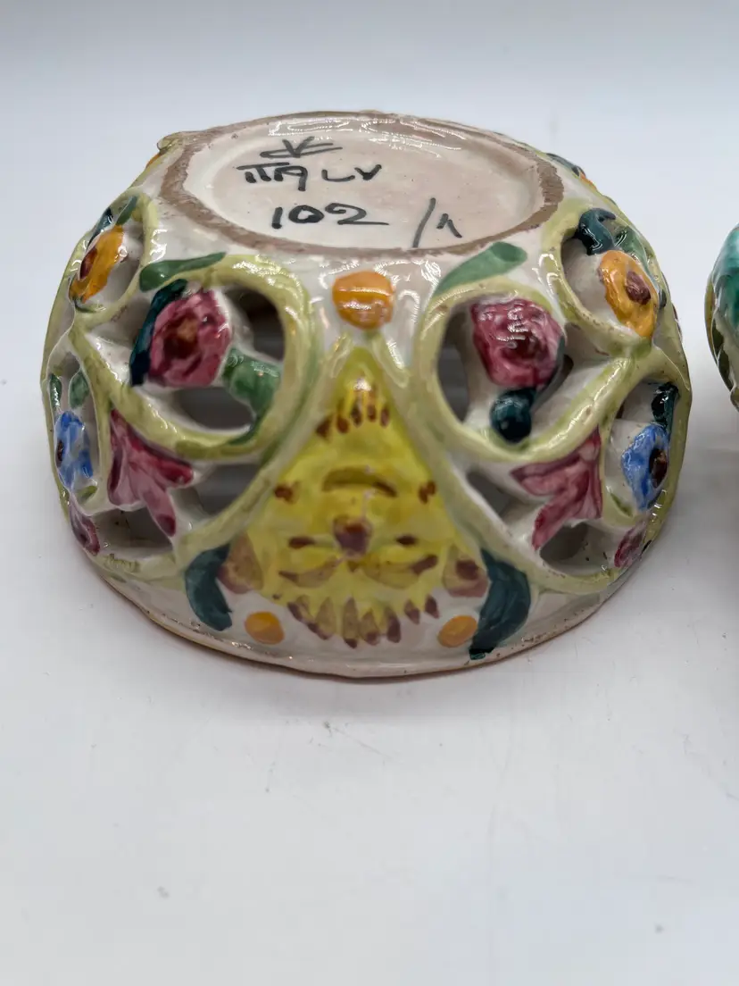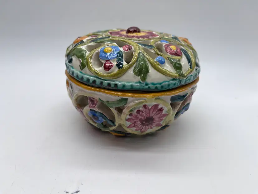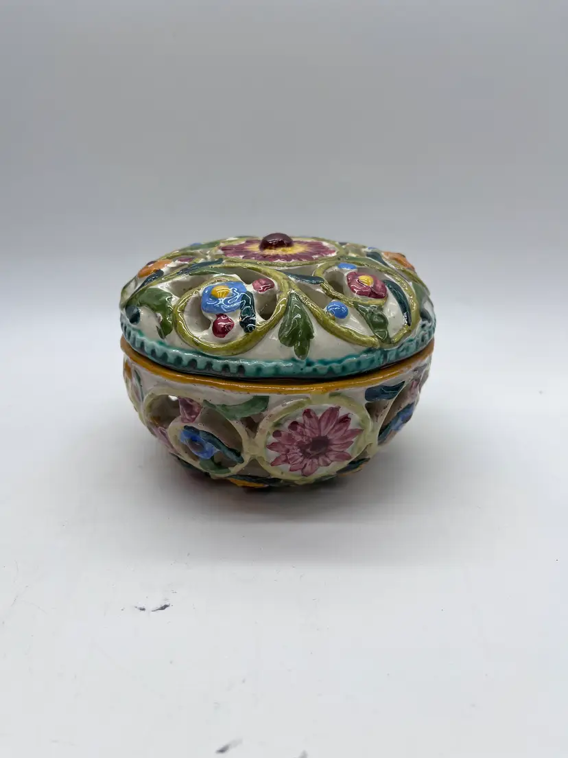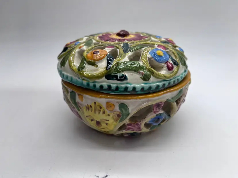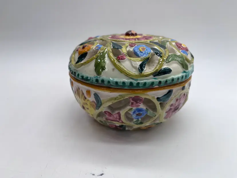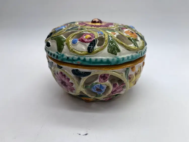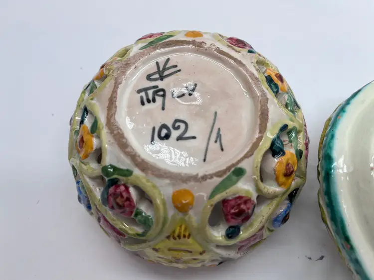 This beautifully detailed ceramic lidded bowl is characteristic of the fine quality of hand made Italian ceramics from the northern Bassano area. The bowl is signed and numbered, but the artist is unknown, though initials are clearly visible. The floral design is embossed, then hand painted. The rough base and visible raw clay show it is a very artisanal piece, likely made in a small family pottery studio. The rough base is typical of pieces produced in the early post WWII years up to the early 1980s when global export and trade became more common, and kilns produced more polished, detail finished pieces.