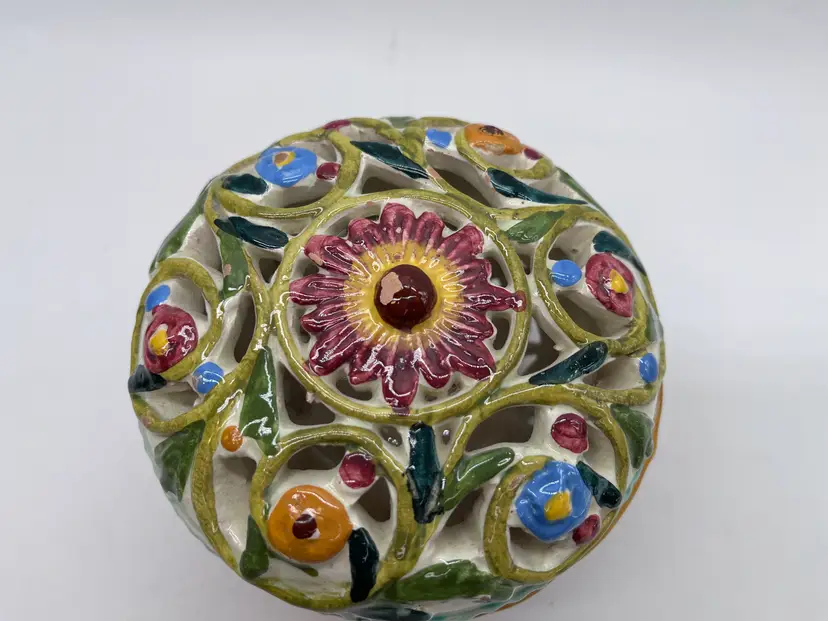 It measures 5.5” wide and 3.5” high, and there is one spot on the lid where the paint has dipped away revealing the red clay mould. Ships from a smoke free pet free home.