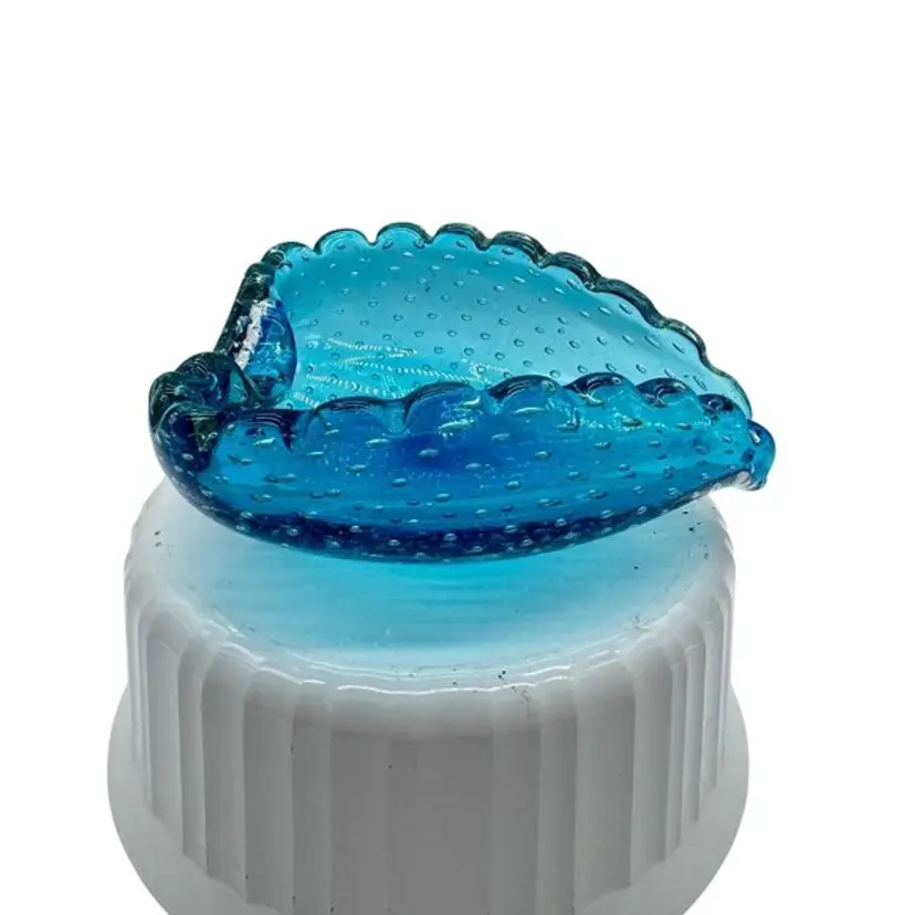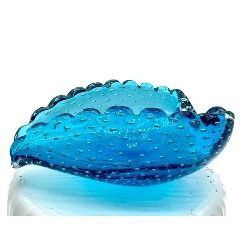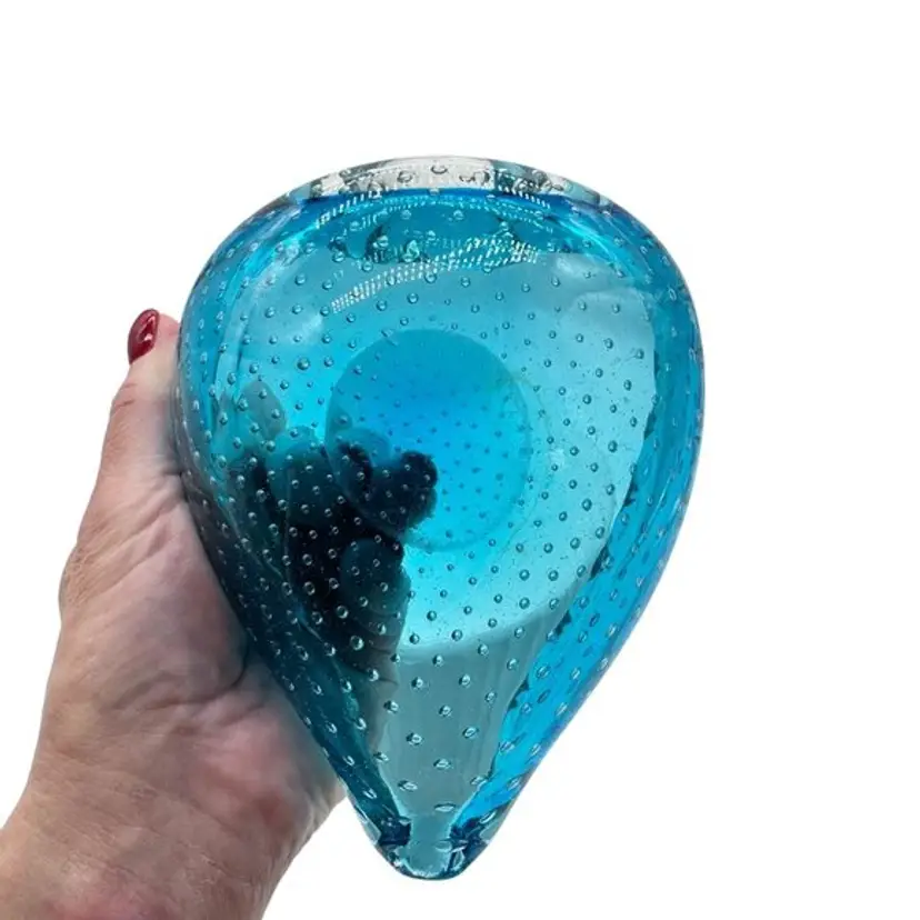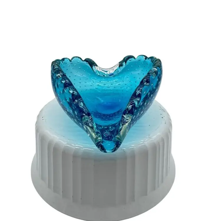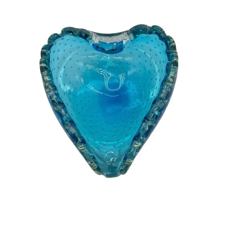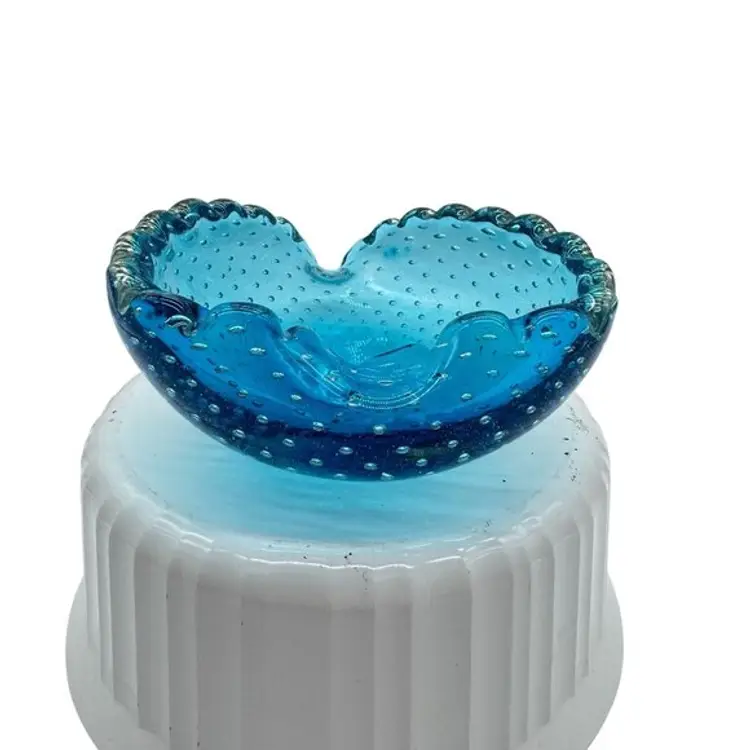 Italian Blue Murano Heart Shaped Dish Bullicante Controlled Bubbles 5.5" x 5"