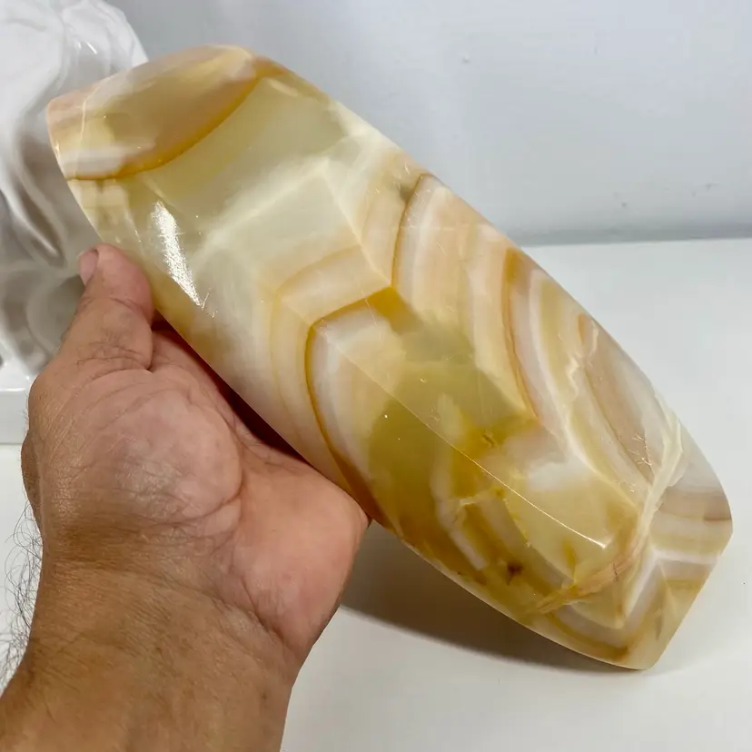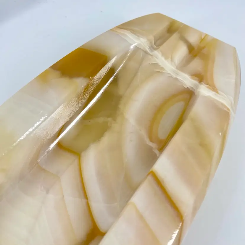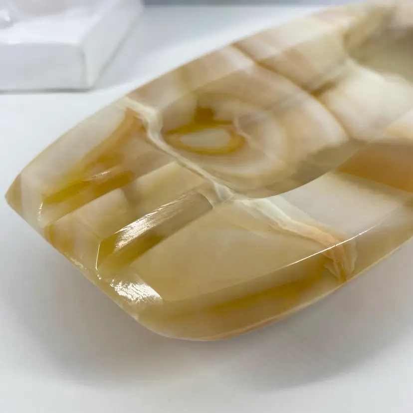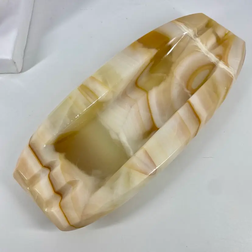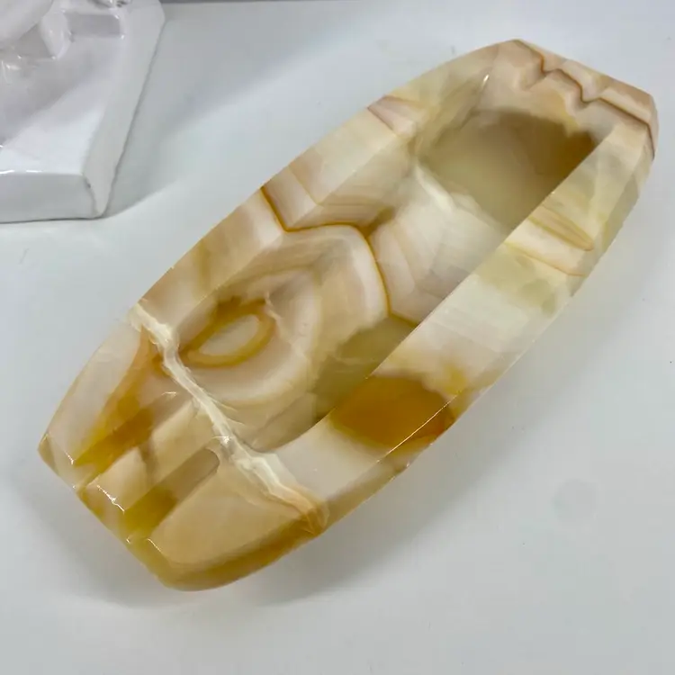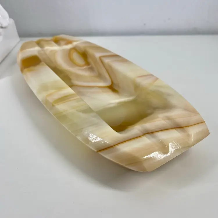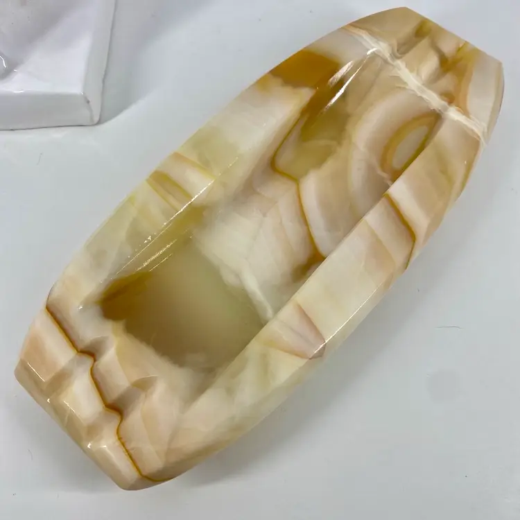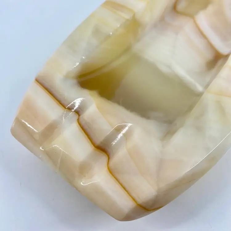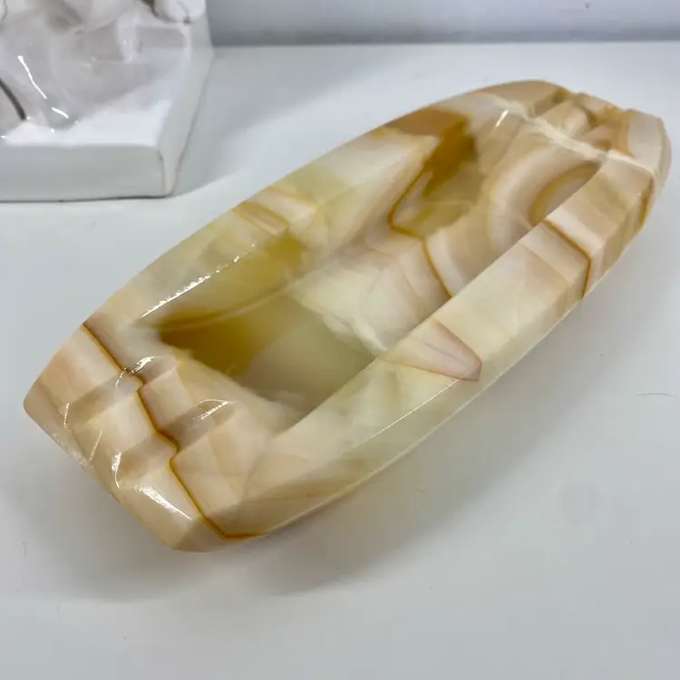 Hi... This Italian stone ashtray is a must-have for any smoking enthusiast. Crafted from beautiful caramel, cream & white Onyx marble and measuring 10" in length by 4.5" in width, this hefty 3 pound vintage ashtray exudes a regal and glamorous aesthetic that will elevate any man cave or smoking room. Made in Italy, this ashtray with 4 indented areas is perfect for hosting your favorite cigarettes cigars or pipe while you relax and enjoy your smoke.