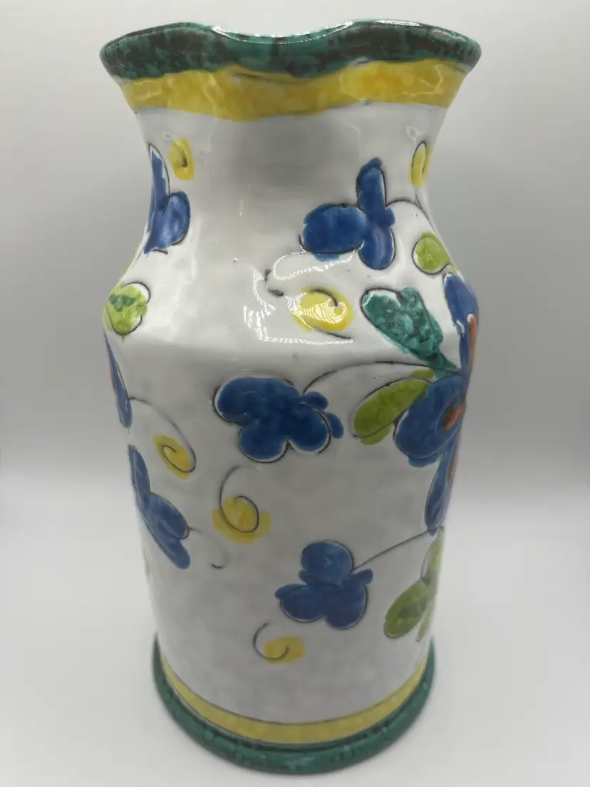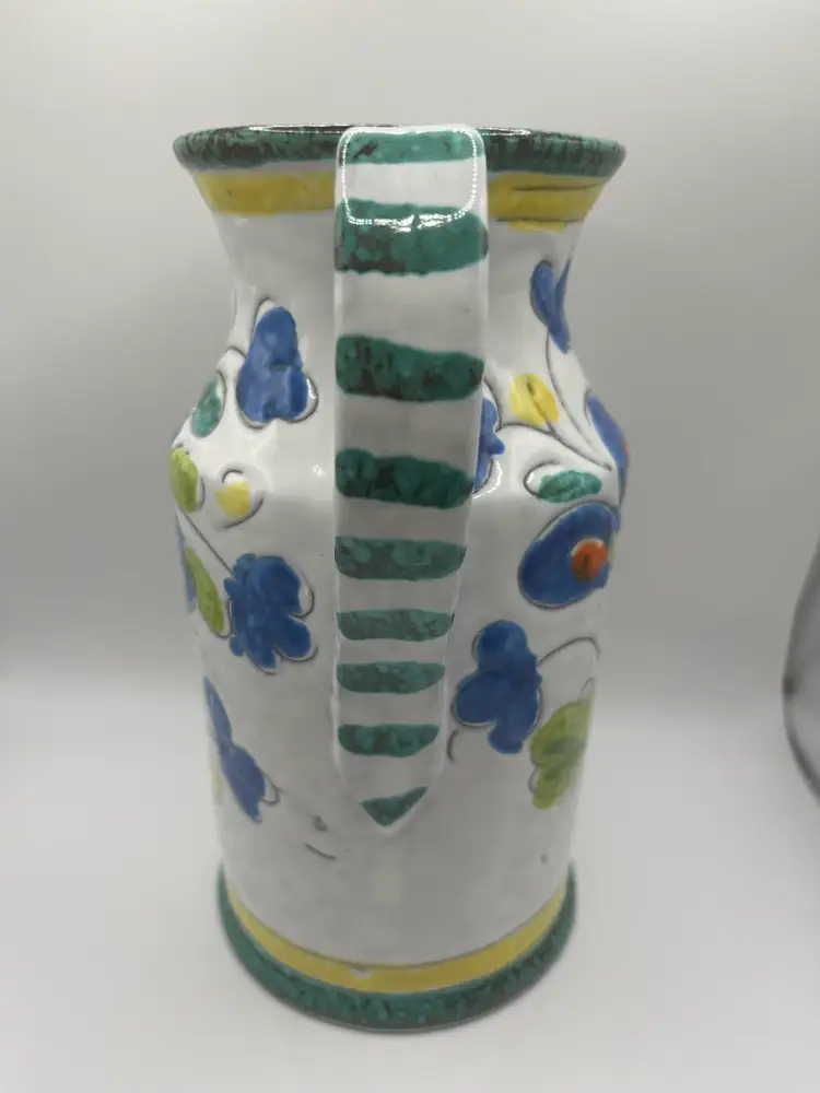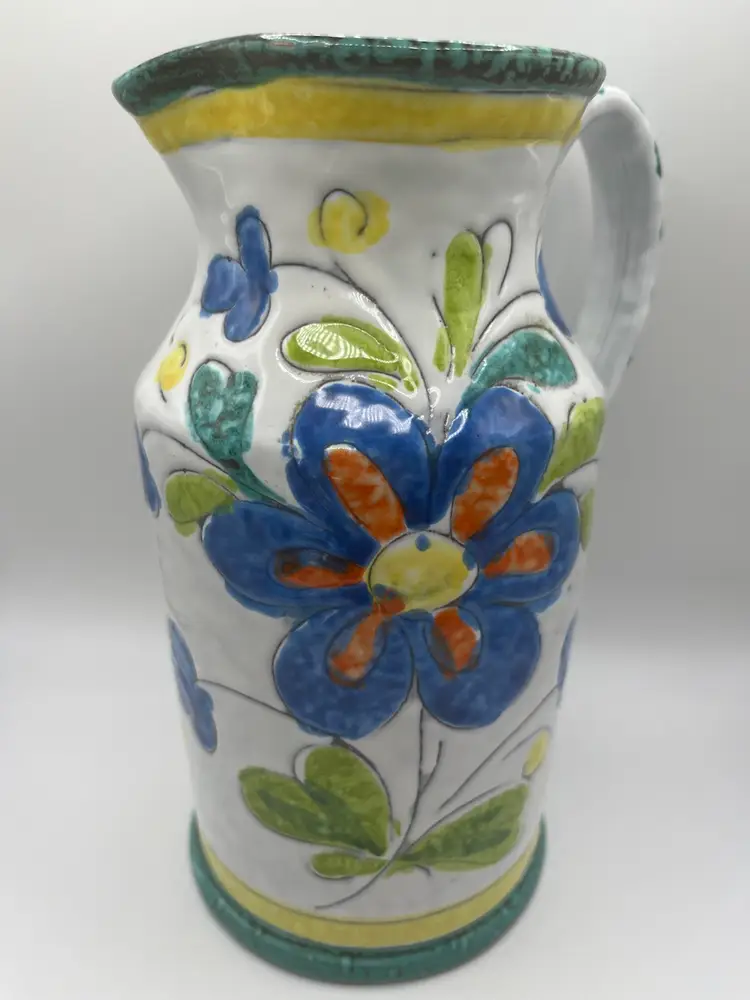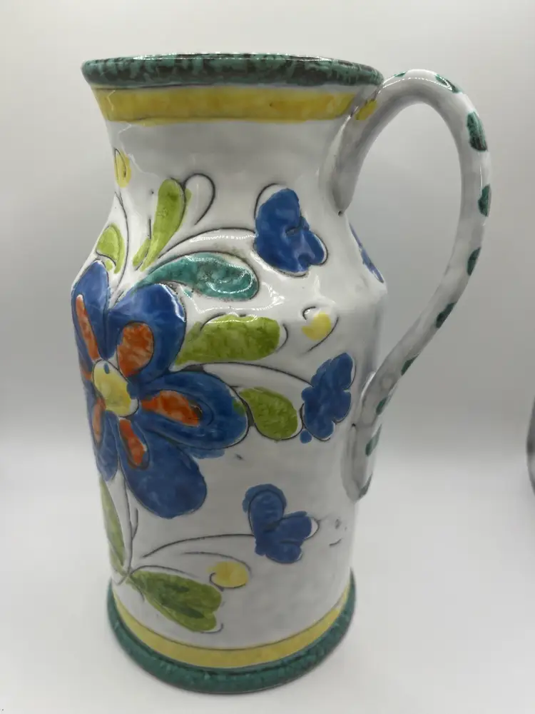 The is a beautiful, colorful, floral Italian pitcher. It is 7 3/4” tall. No chips or cracks.