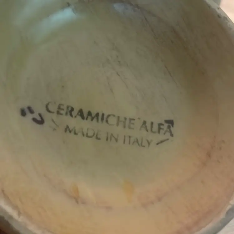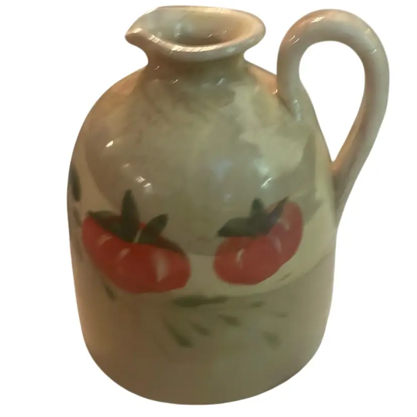 This is a vintage Ceramiche Alfa Tuscan handled ceramic jug or pitcher, hand-painted with a tomato design. It was made in Italy. The jug measures approximately 5 inches tall. It is often used as a pitcher for oil, dressing, or as a vase. The item was previously sold at Crate & Barrel.
