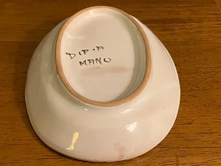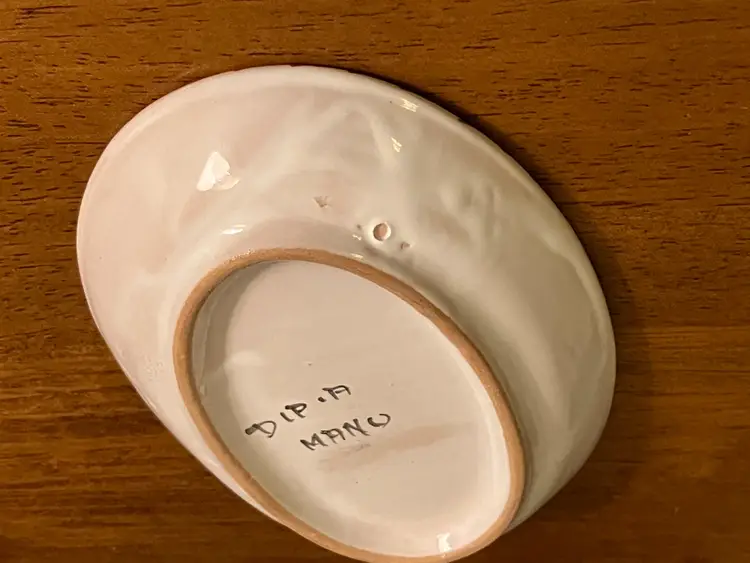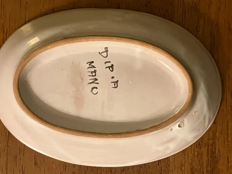 It is 5 3/4 inches wide and 4 inches tall. No chips or cracks.