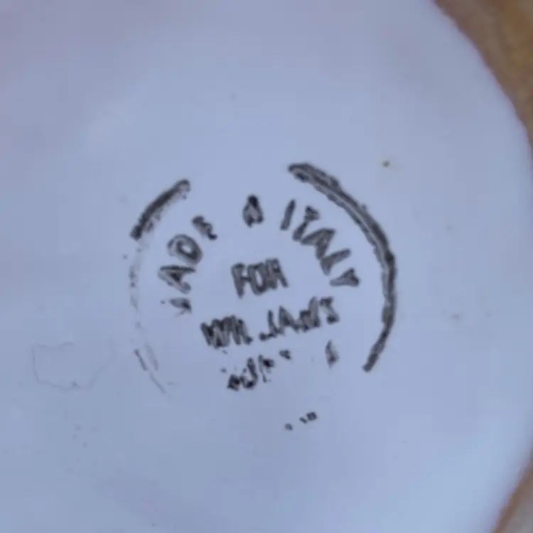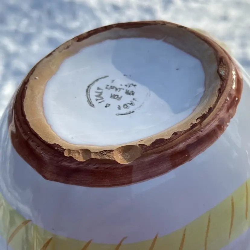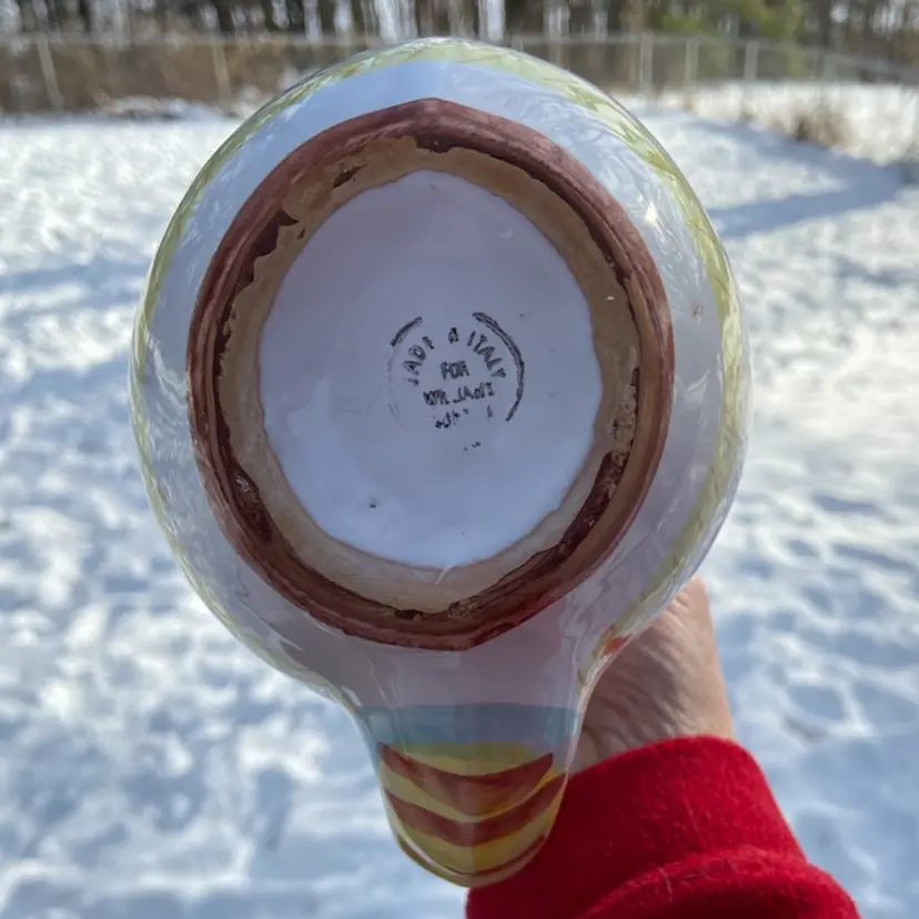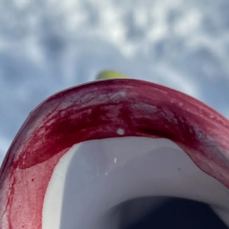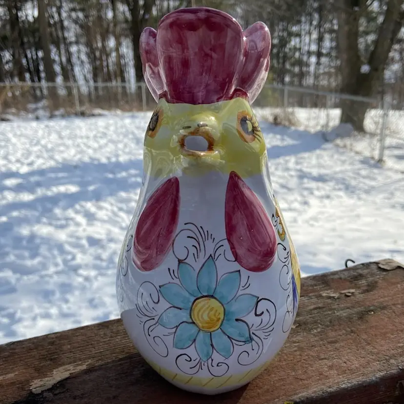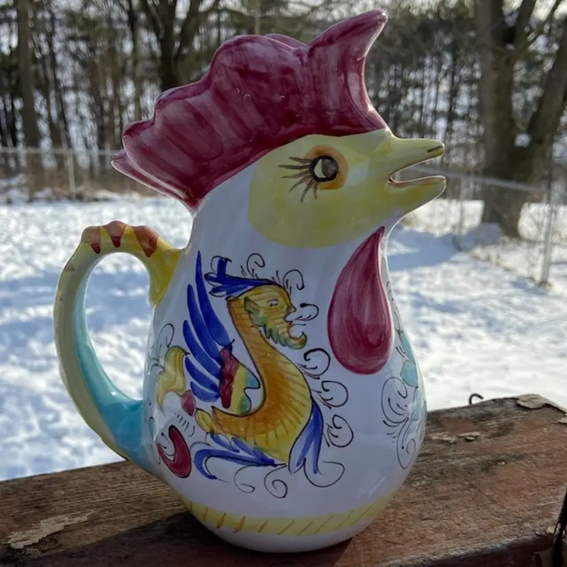 Approx: 8.5”h x 6.5”w including handle. Preowned condition. No cracks. A couple chips on the unglazed bottom rim. Two white spots on the comb are not chips nor missing glaze. There’s a small indented area where glazed was partially missed. See all images as part of the description.