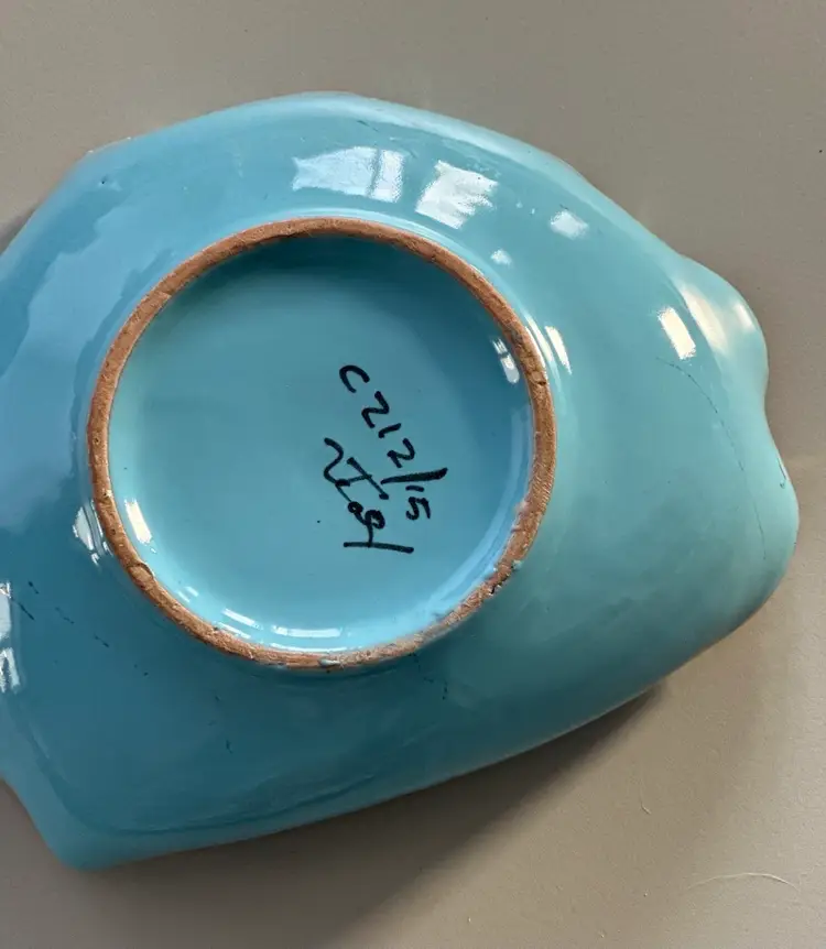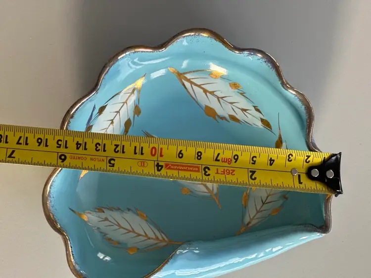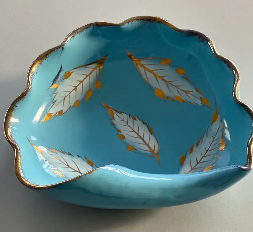 Italian trinket dish/bowl. Beautiful robin egg blue with feathers outlined in gold. Signed Excellent vintage condition