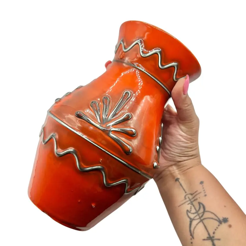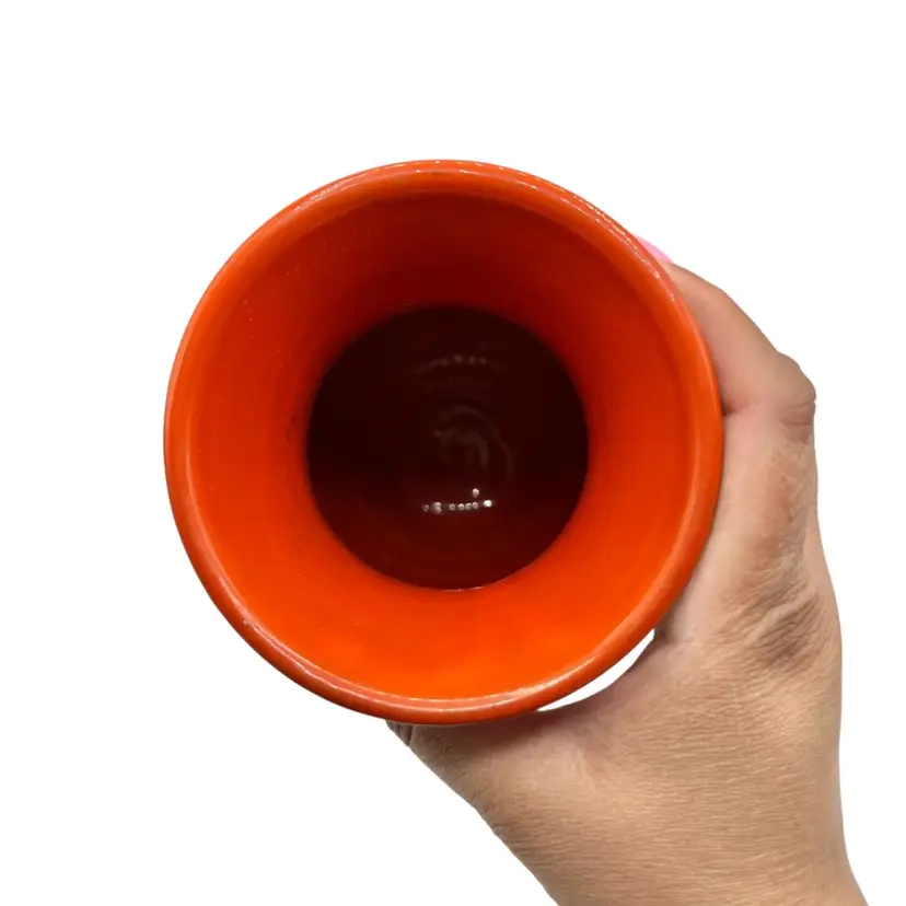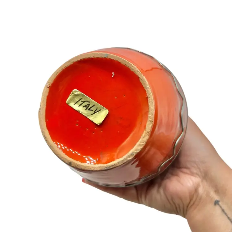 in real life, the color is more like a fire orange diameter is 4 inches and 7.75” tall no chips or cracks Sticker that says Italy on bottom